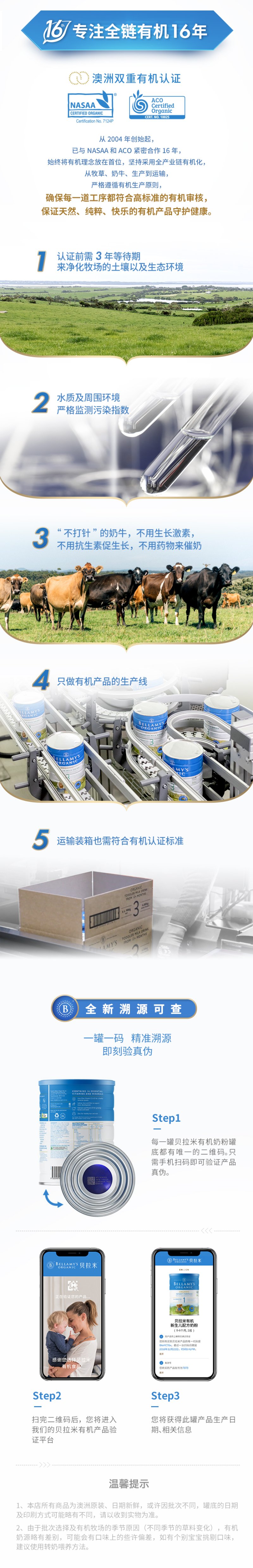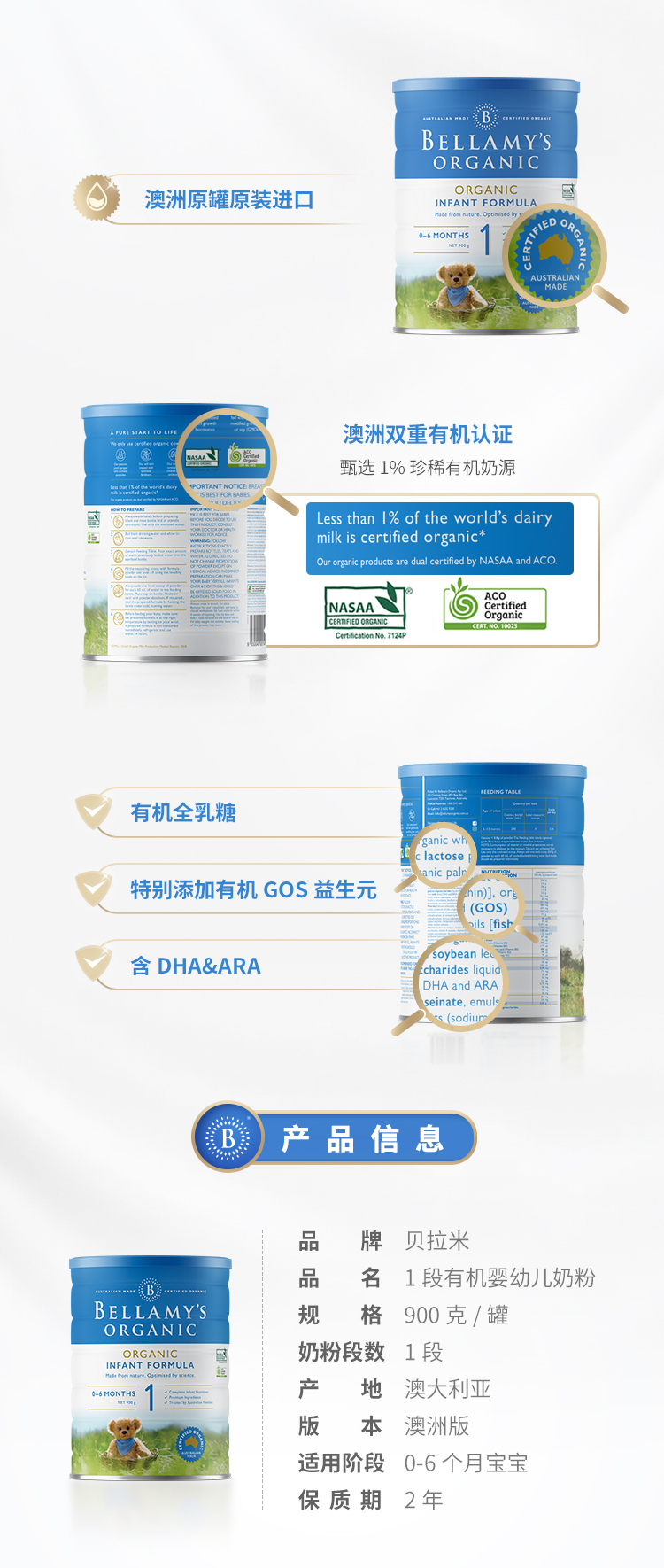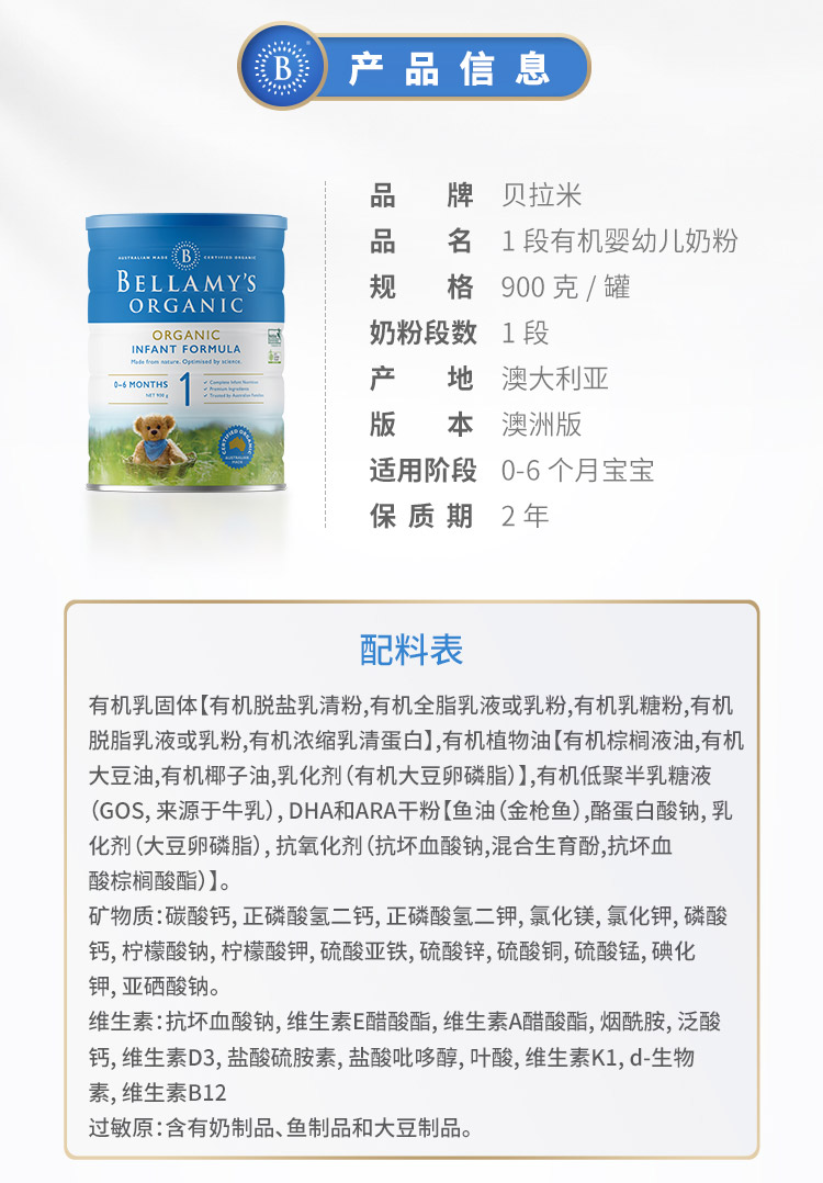 【BSC】澳洲Bellamys贝拉米1段婴儿有机牛奶粉一段新生儿0-6个月900g