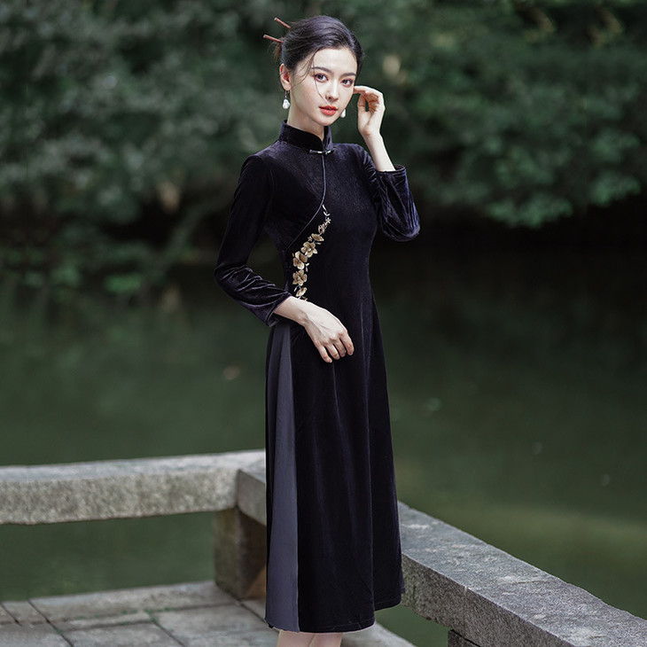 刺绣黑色丝绒显瘦奥黛改良旗袍秋冬 SC18151