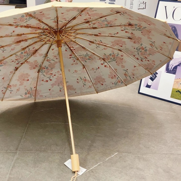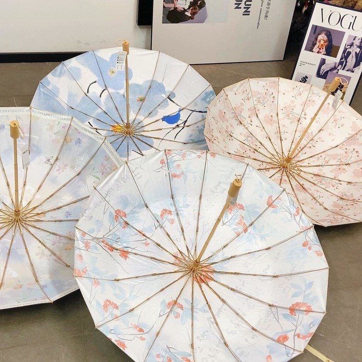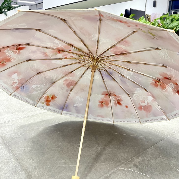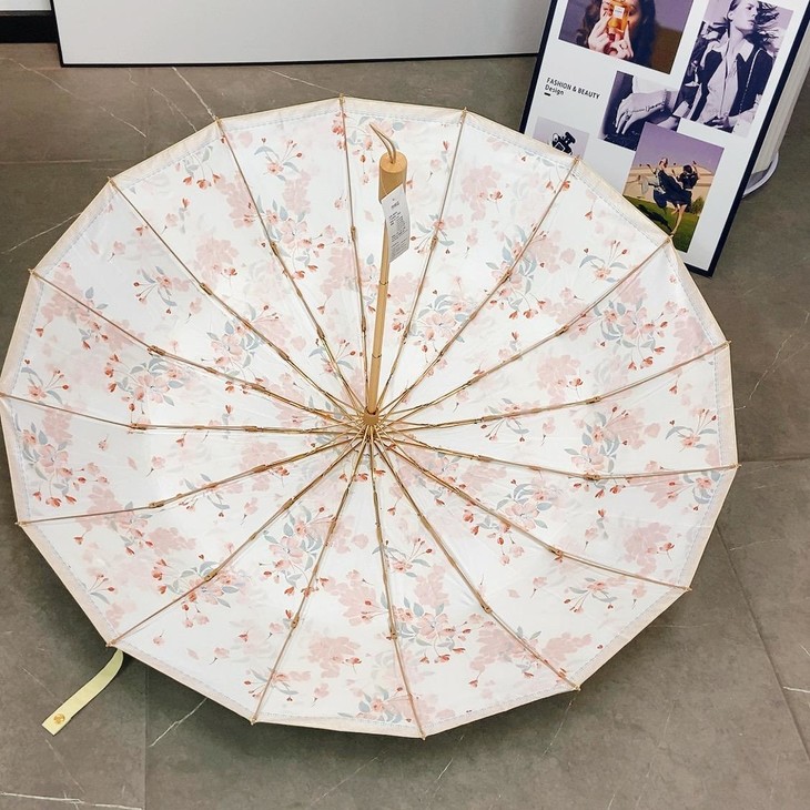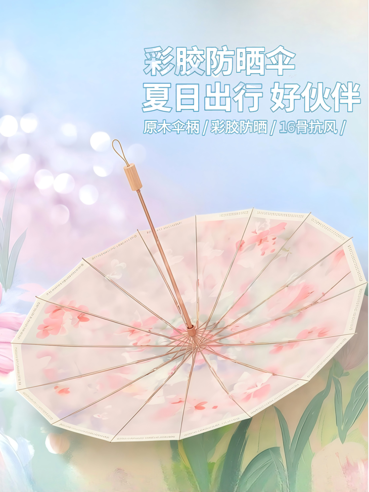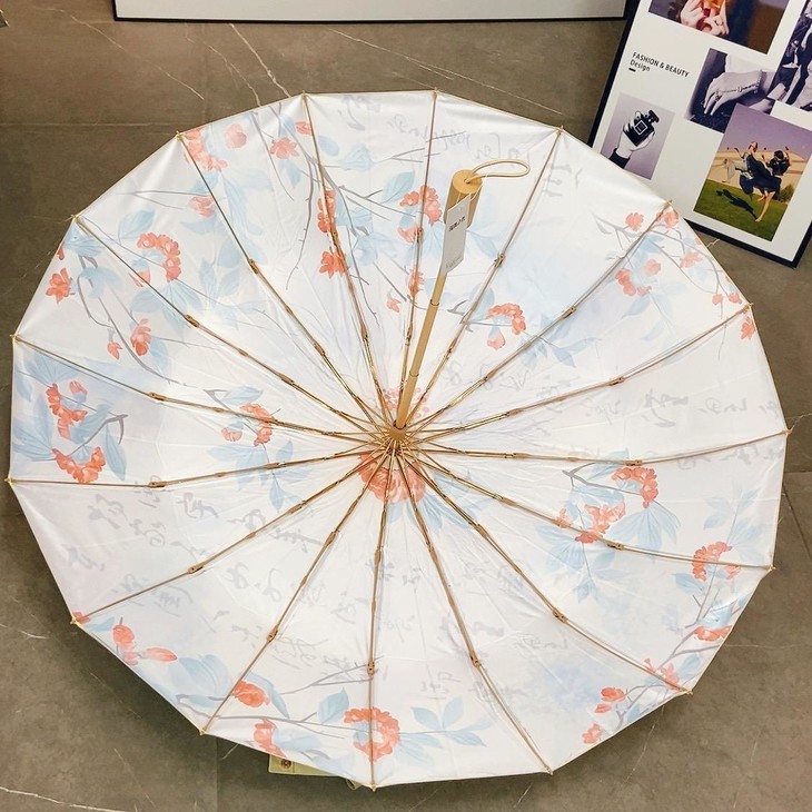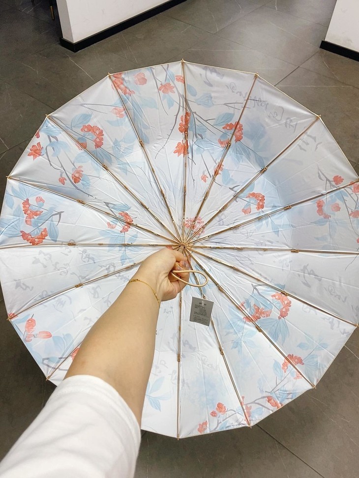 新中式彩胶16骨晴雨两用大伞 3折16根铝合金骨架,不生锈不卡壳 纯实木手柄,收起来是个花苞状🌷 收伞高度29公分,打开直径100cm 外层新型科技彩胶涂层,拒水伞布,一甩即干 挡雨又防晒,防晒指数up50+实标防护!