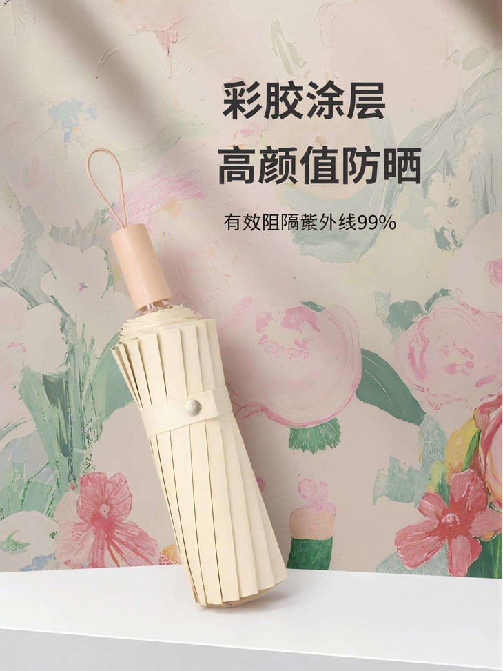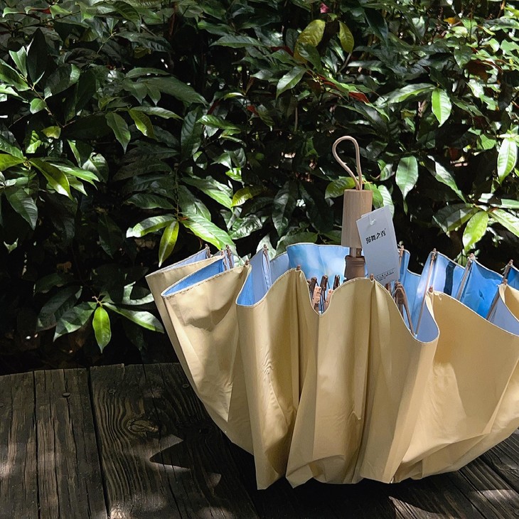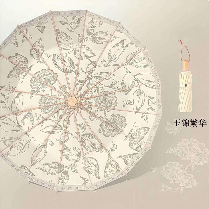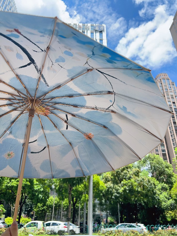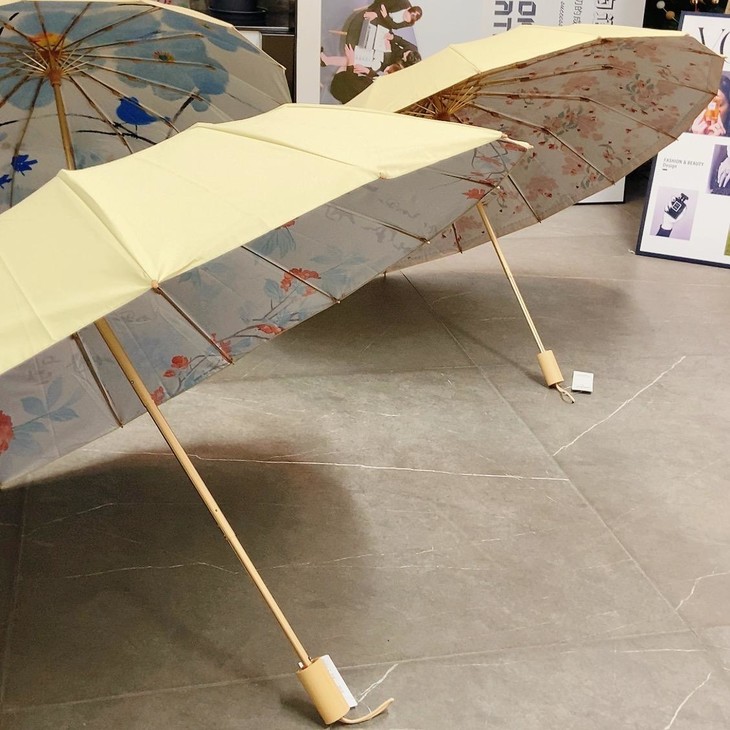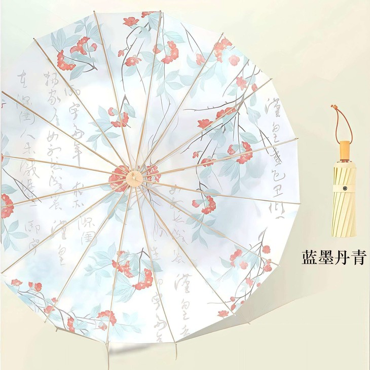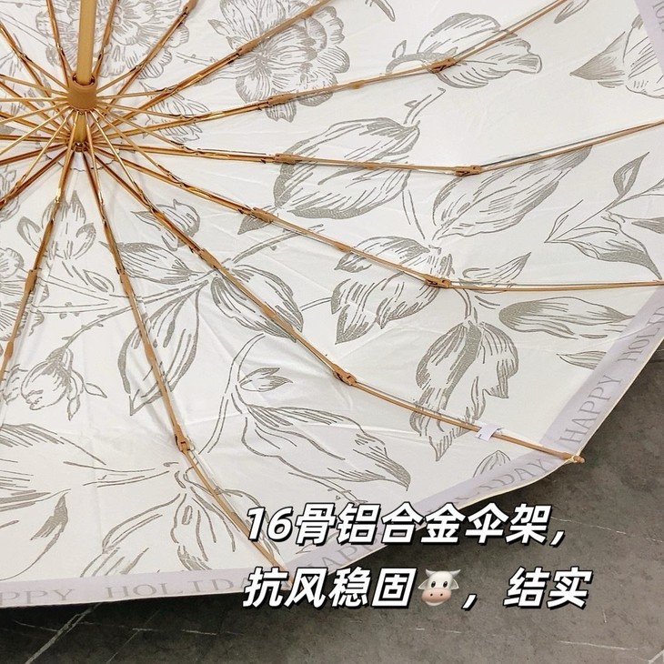 这款国画风格的晴雨两用伞 不仅外观高级,而且骨架够硬核 伞骨采用了16骨金色铝合金架构 成本比铁骨高30%! 手感轻盈,抗风能力强,风吹弯了能自己弹回! 伞面是彩胶涂层,可以有效反射热气 有效阻隔99%紫外线!UPF大于50 伞内温度显著降低 让你在炎炎夏日也能感受到一丝凉爽 三折设计+晴雨两用,放车里、随身带都超方便