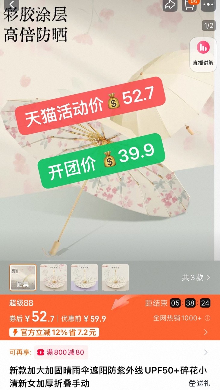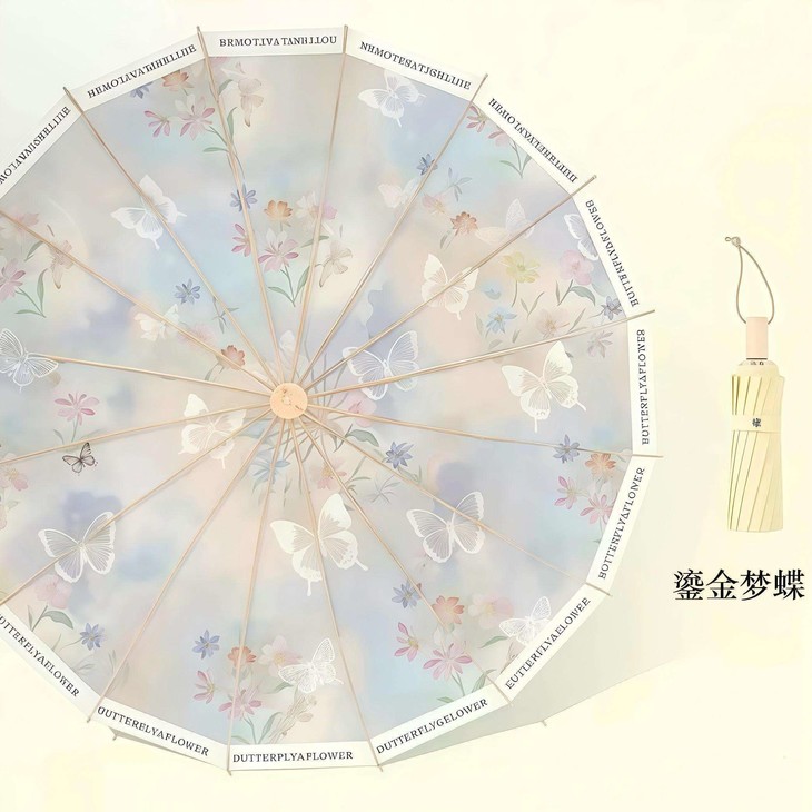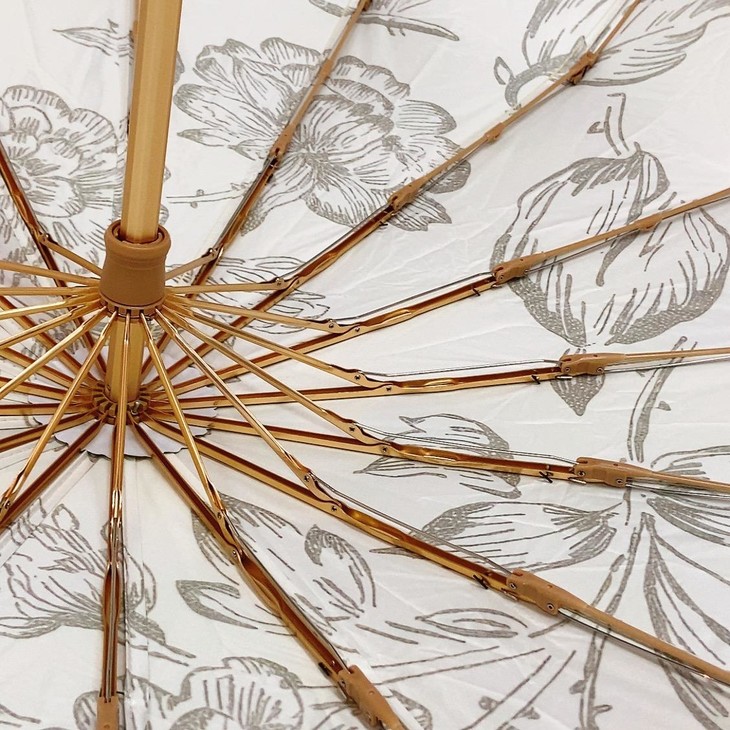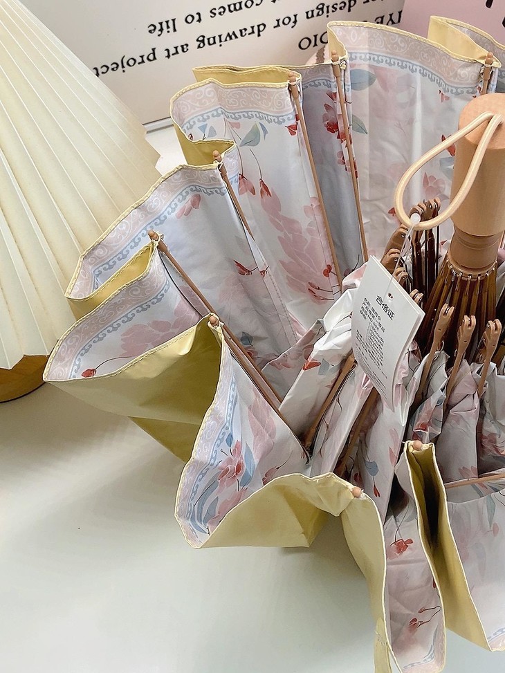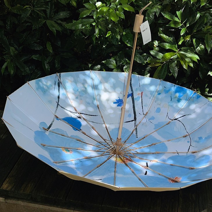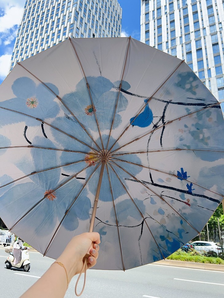 这款国画风格的晴雨两用伞 不仅外观高级,而且骨架够硬核 伞骨采用了16骨金色铝合金架构 成本比铁骨高30%! 手感轻盈,抗风能力强,风吹弯了能自己弹回! 伞面是彩胶涂层,可以有效反射热气 有效阻隔99%紫外线!UPF大于50 伞内温度显著降低 让你在炎炎夏日也能感受到一丝凉爽 三折设计+晴雨两用,放车里、随身带都超方便