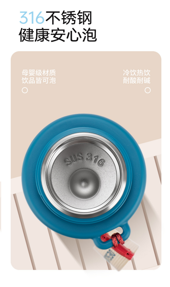 316不锈钢材质,长效保温保冷,味道干净不串味,拿捏你的味蕾。 早上灌的冰美式,到了下午开会提神,还是透心凉的冰爽。 冬天泡的热茶/枸杞水,几小时过去依然暖胃暖心。