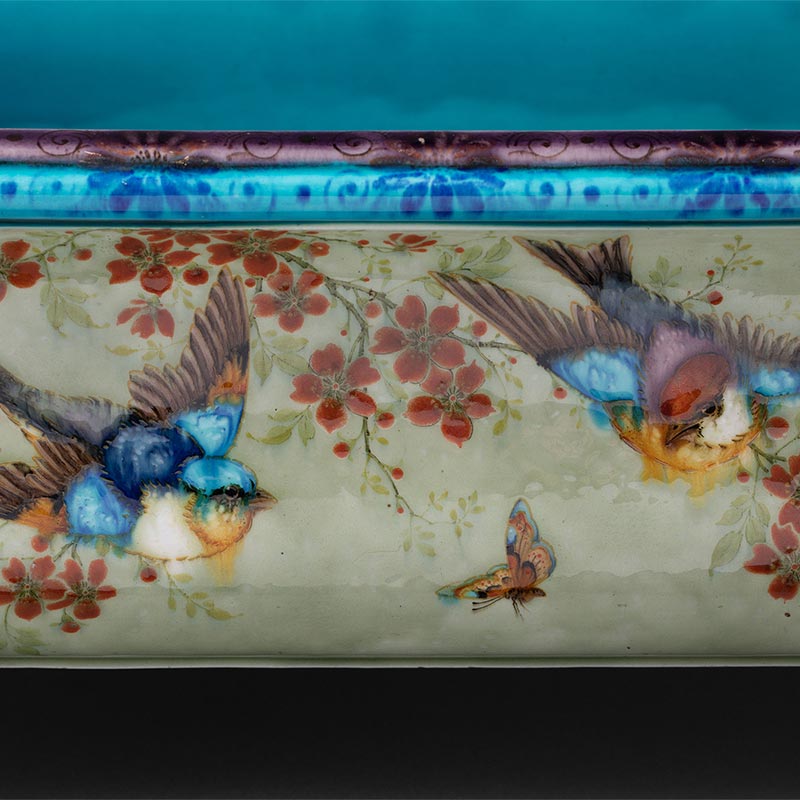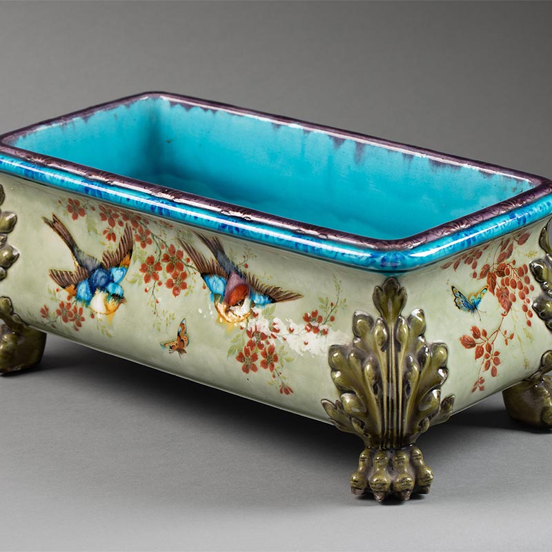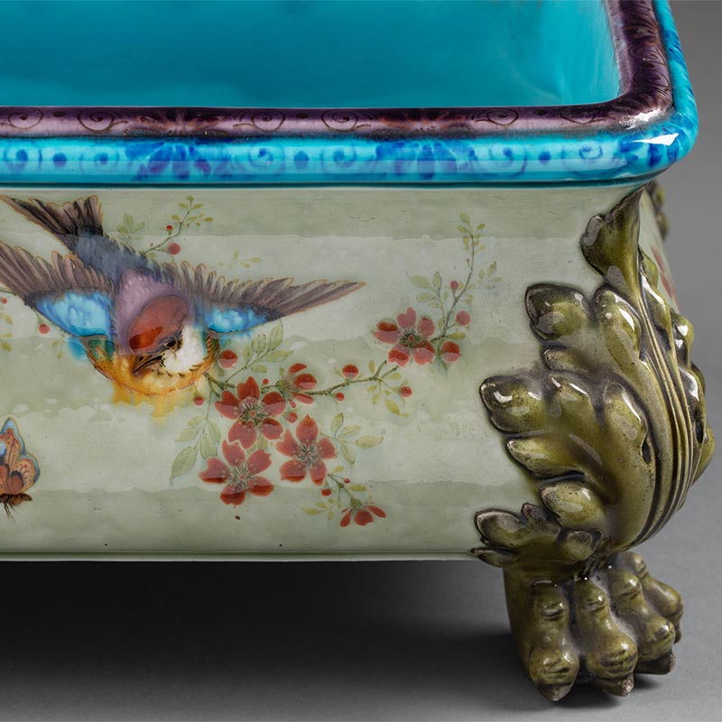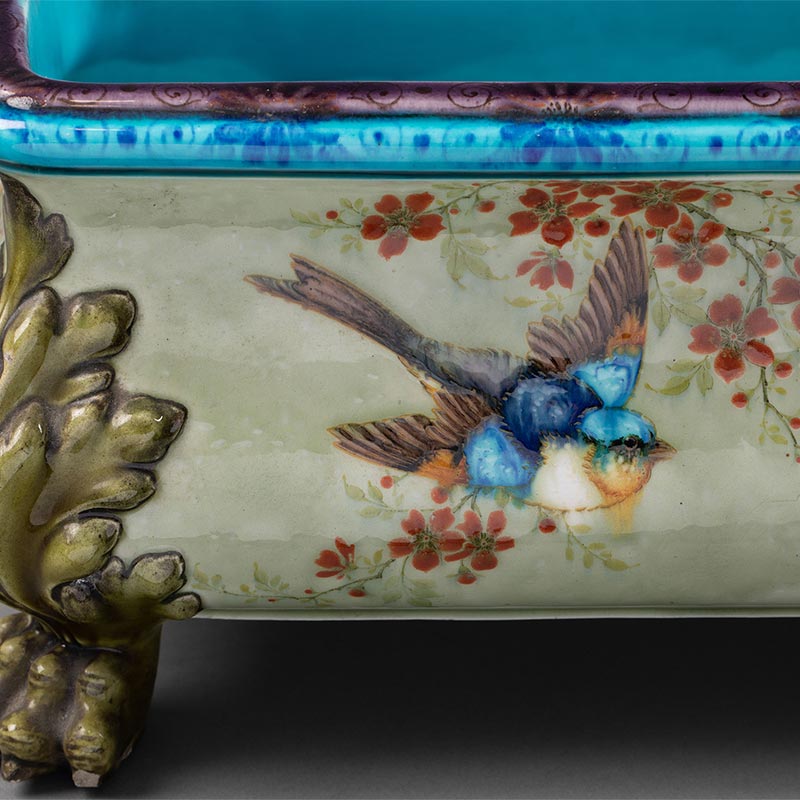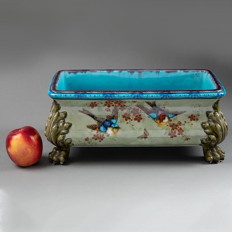 19世纪法国陶艺大师Théodore Deck签名出品东方风格兽爪足装饰繁花鸟雀主题彩釉陶瓷花盆套