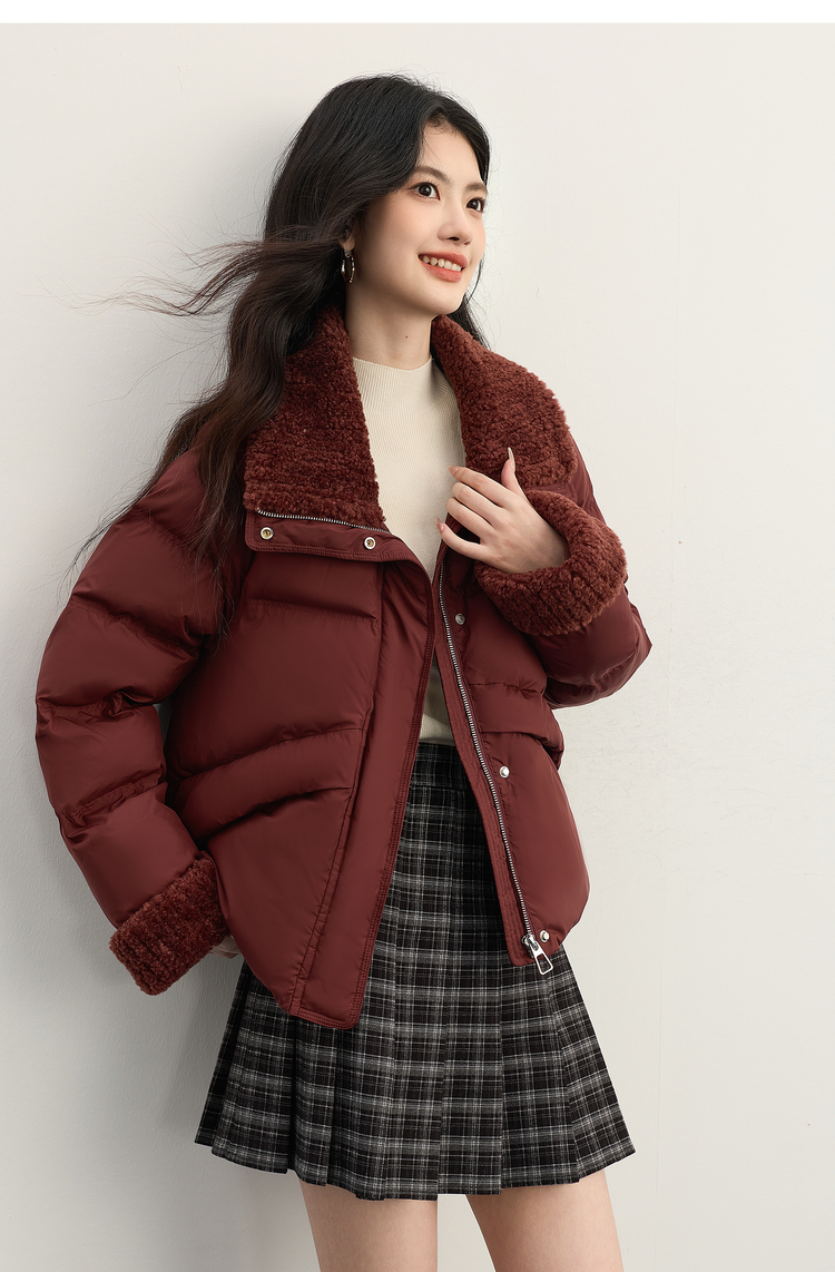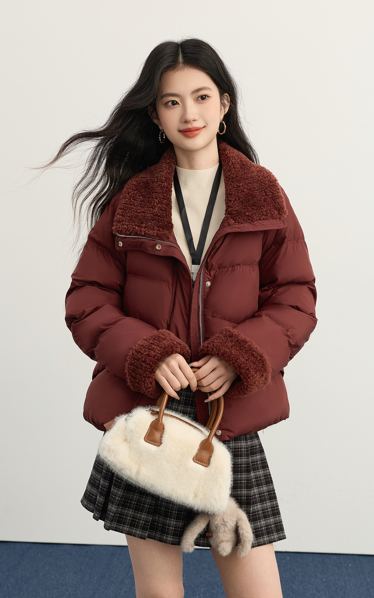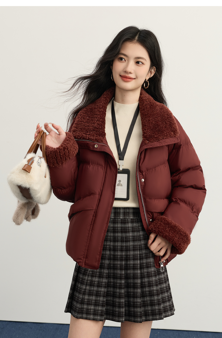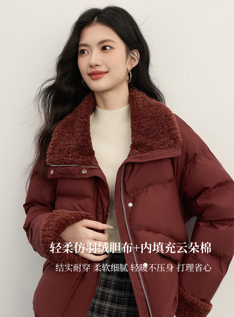 【年货节】熙世界朗姆酒红色面包棉服女2025冬装新款毛绒翻领保暖棉衣短外套