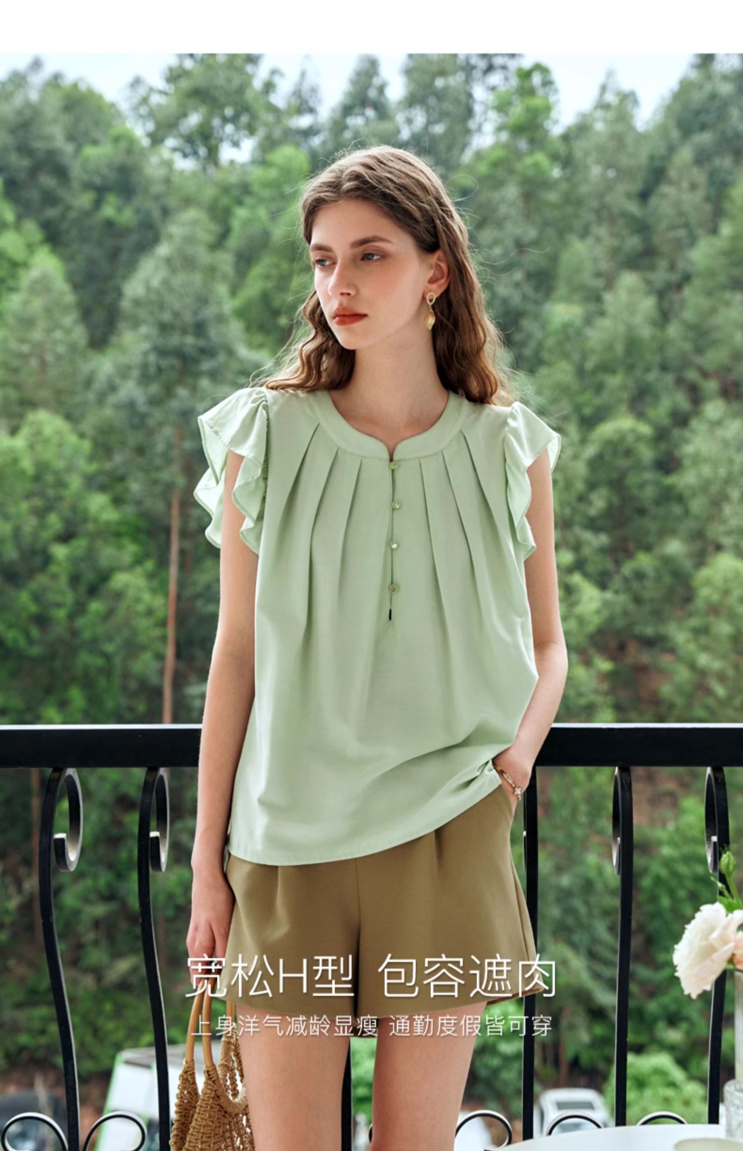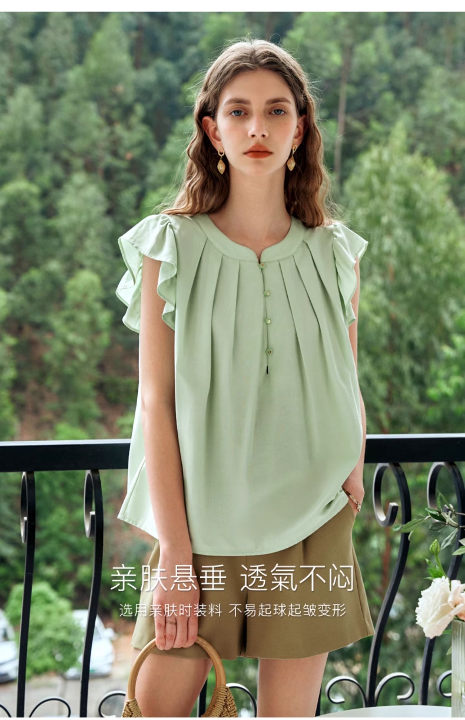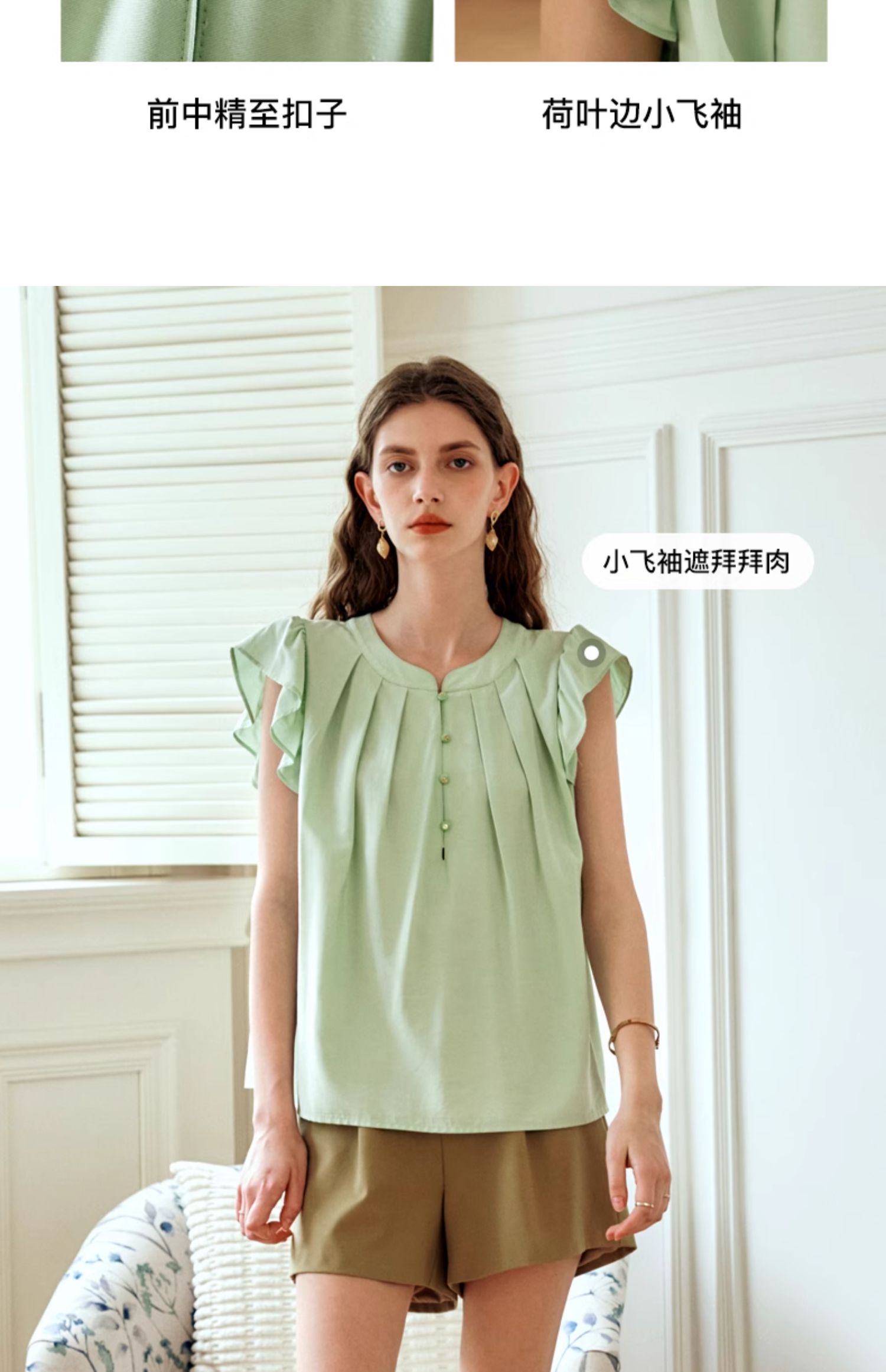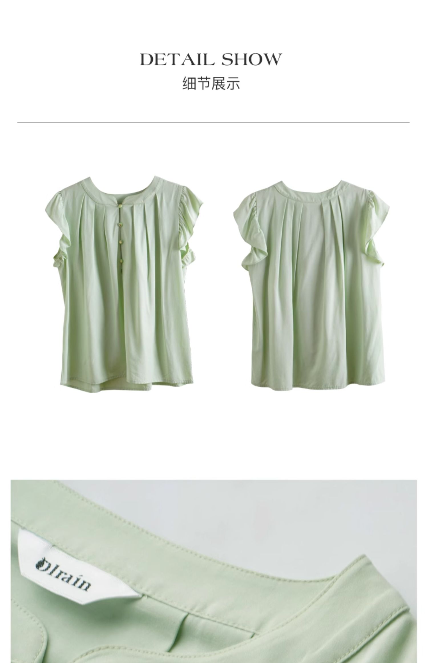 OLrain欧芮儿法式圆领衬衫女夏季2024新款设计感荷叶边小飞袖上衣