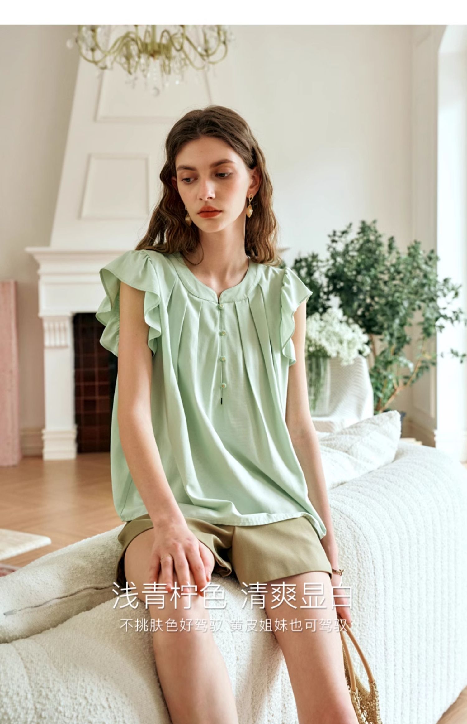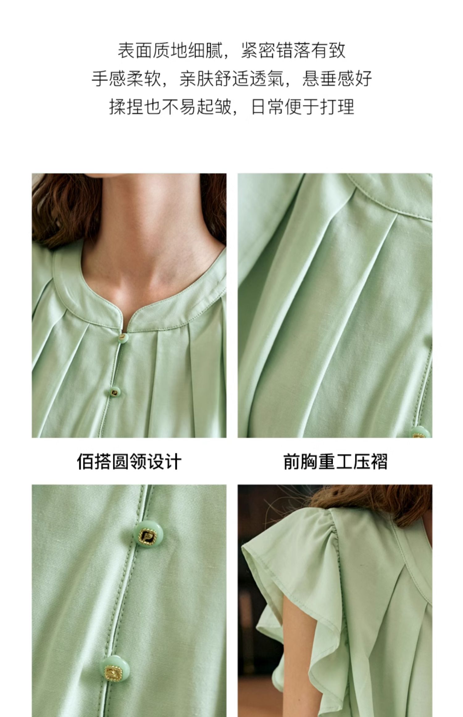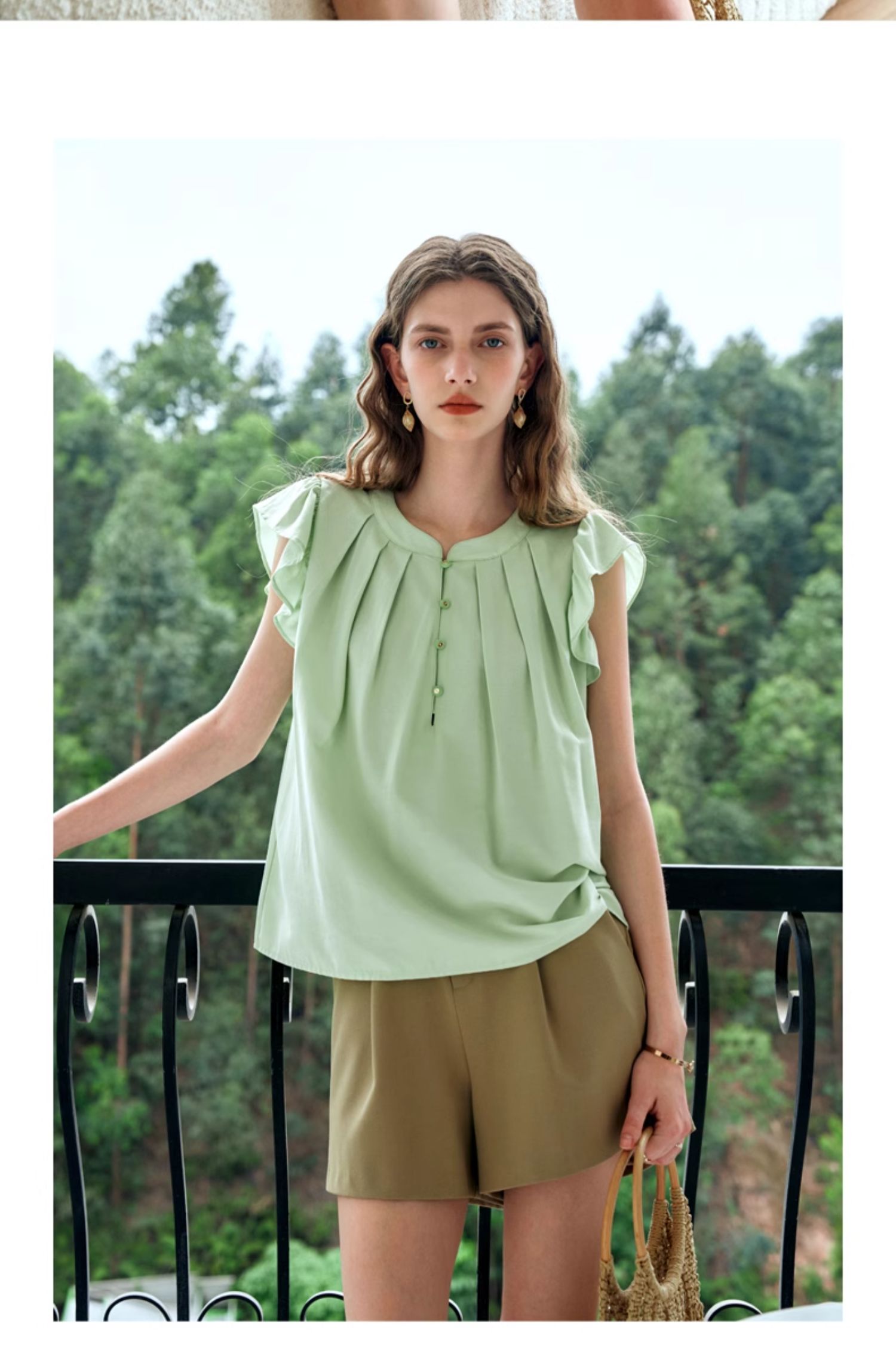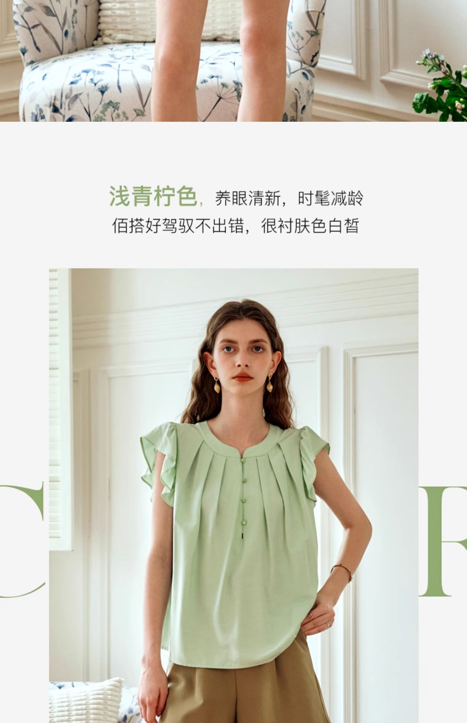 OLrain欧芮儿法式圆领衬衫女夏季2024新款设计感荷叶边小飞袖上衣