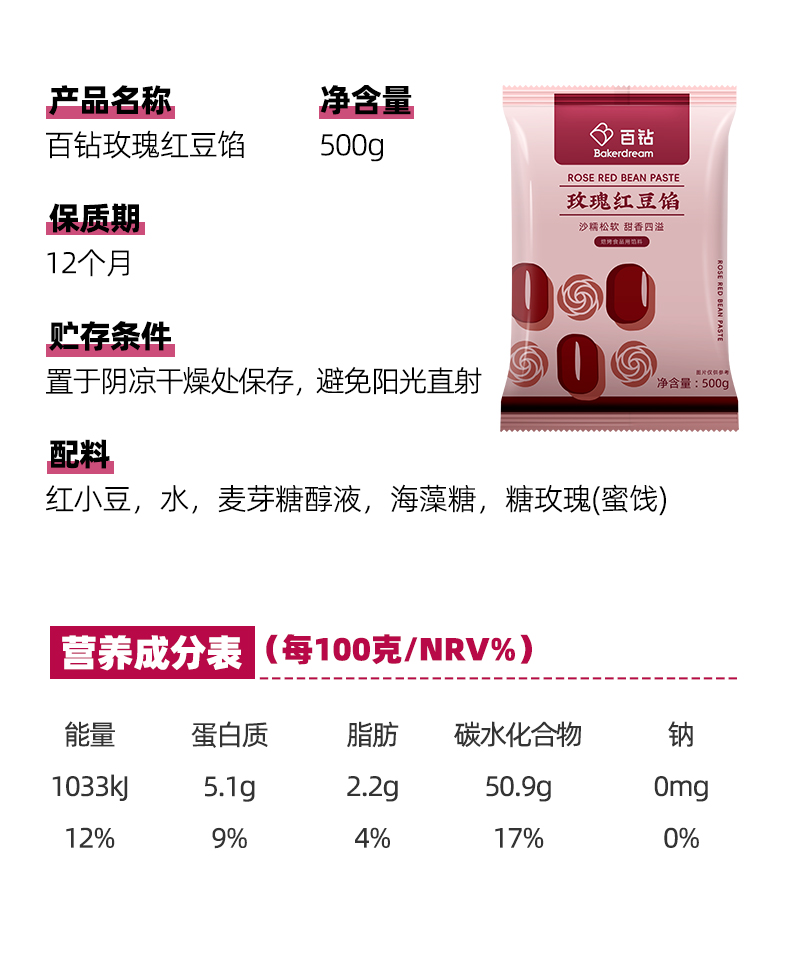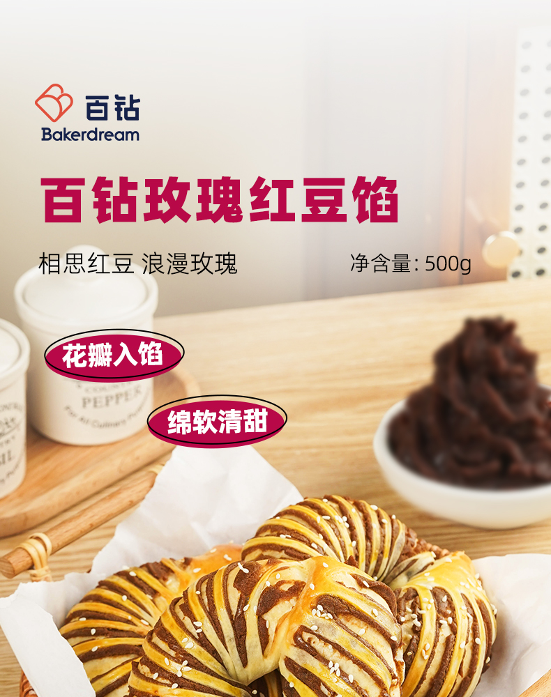 500g 百钻玫瑰红豆馅 汤圆馅料 面包馅 冰皮月饼原料