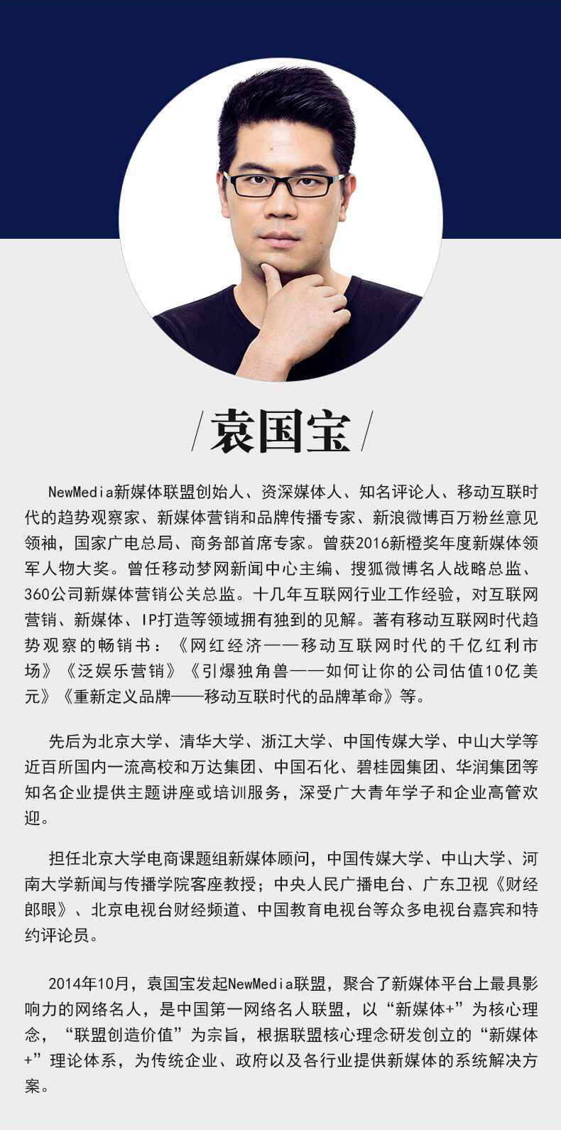 ◎袁国宝 NewMedia新媒体联盟创始人、资深媒体人、知名评论人、新媒体营销和品牌传播专家、新浪微博百万粉丝意见领袖,国家广电总局、商务部首席专家。曾获2016新橙奖年度新媒体领军人物大奖。曾任移动梦网新闻中心主编、搜狐微博名人战略总监、360公司新媒体营销公关总监。十几年互联网行业工作经验,对互联网营销、新媒体、IP打造等领域拥有独到的见解。著有移动互联网时代趋势观察的畅销书:《网红经济——移动互联网时代的千亿红利市场》《泛娱乐营销》《引爆独角兽——如何让你的公司估值10亿美元》《重新定义品牌——移动互联时代的品牌革命》等。
