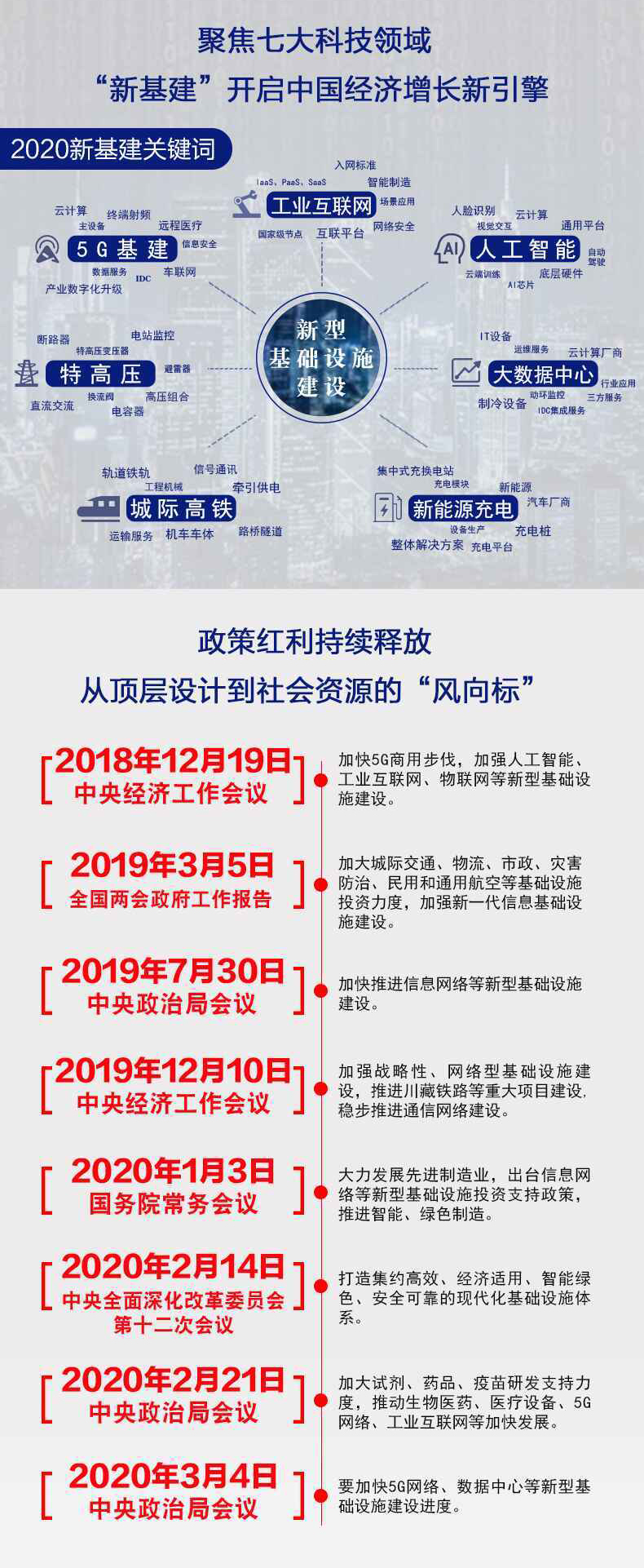 2020年3月4日,中共中央政治局常务委员会召开会议。会议强调,要加快推进国家规划已明确的重大工程和基础设施建设,其中要加快 5G 网络、数据中心等新型基础设施建设进度。新型基础设施建设(简称“新基建”)是指发力于科技端的基础设施建设,涉及到通信、科技、电力、工业、交通、汽车等多个社会民生重点行业。