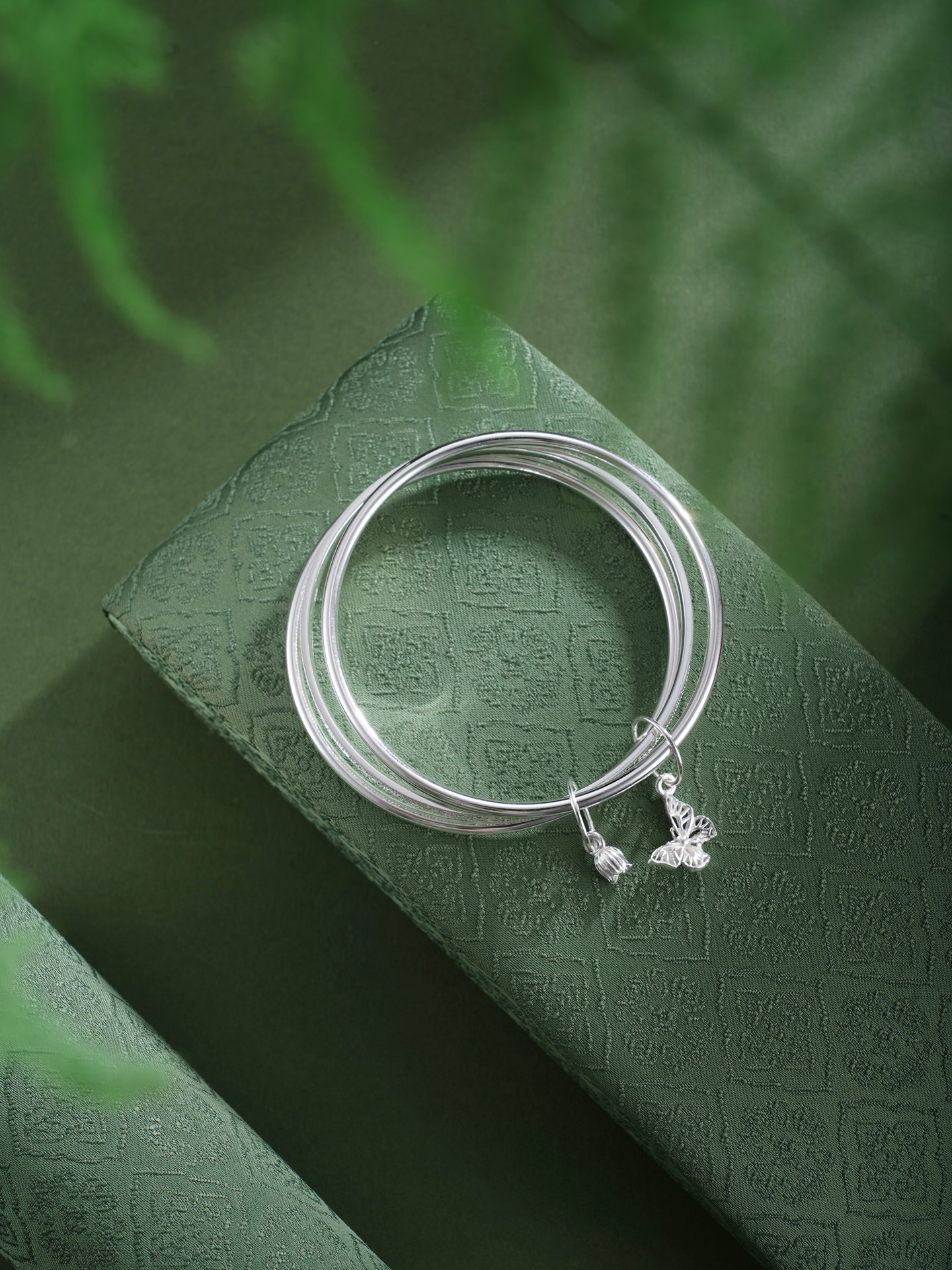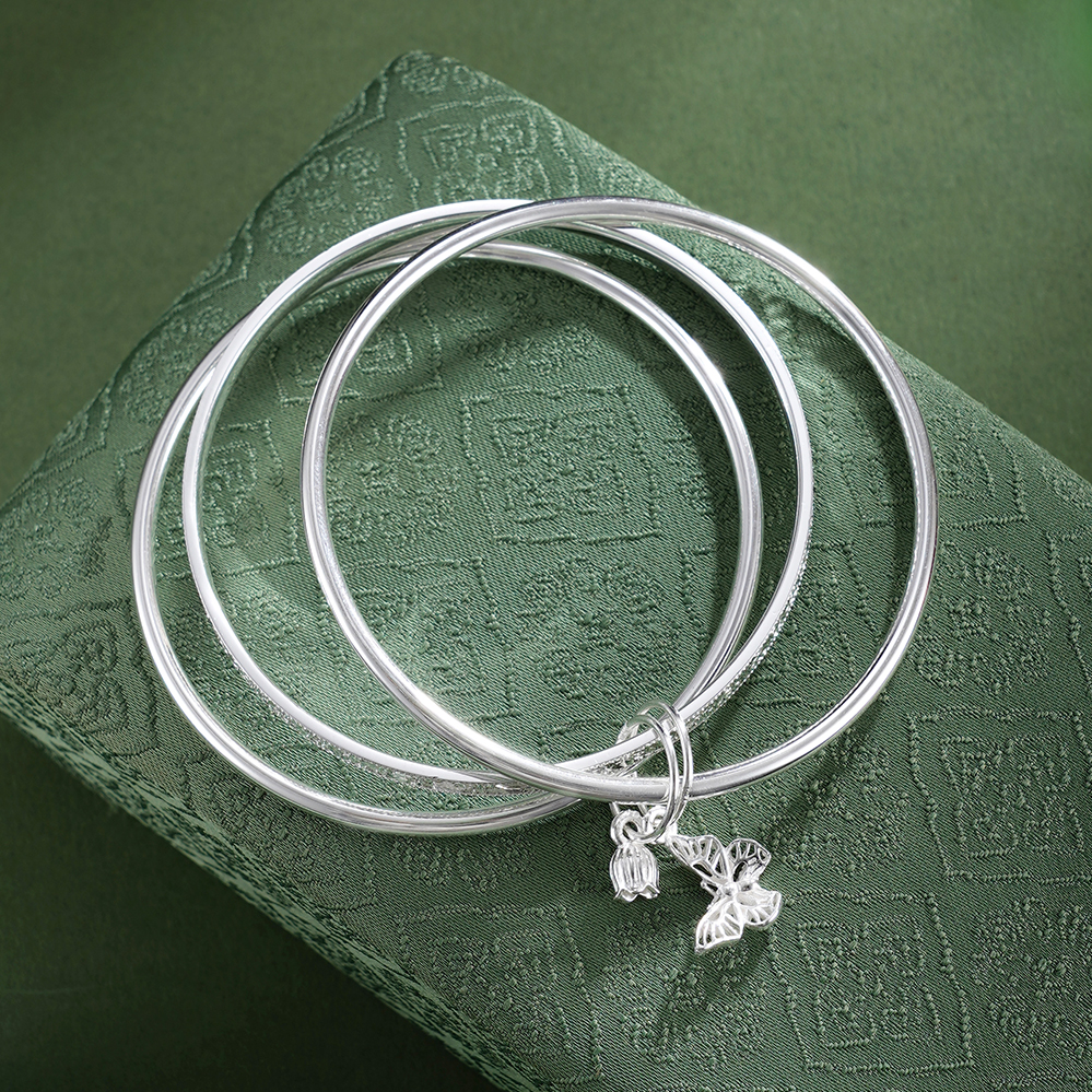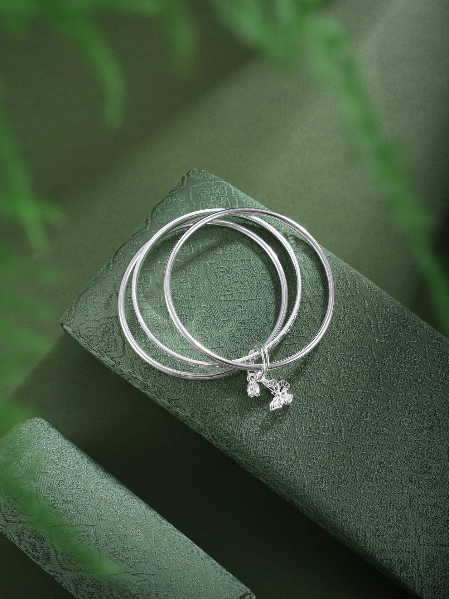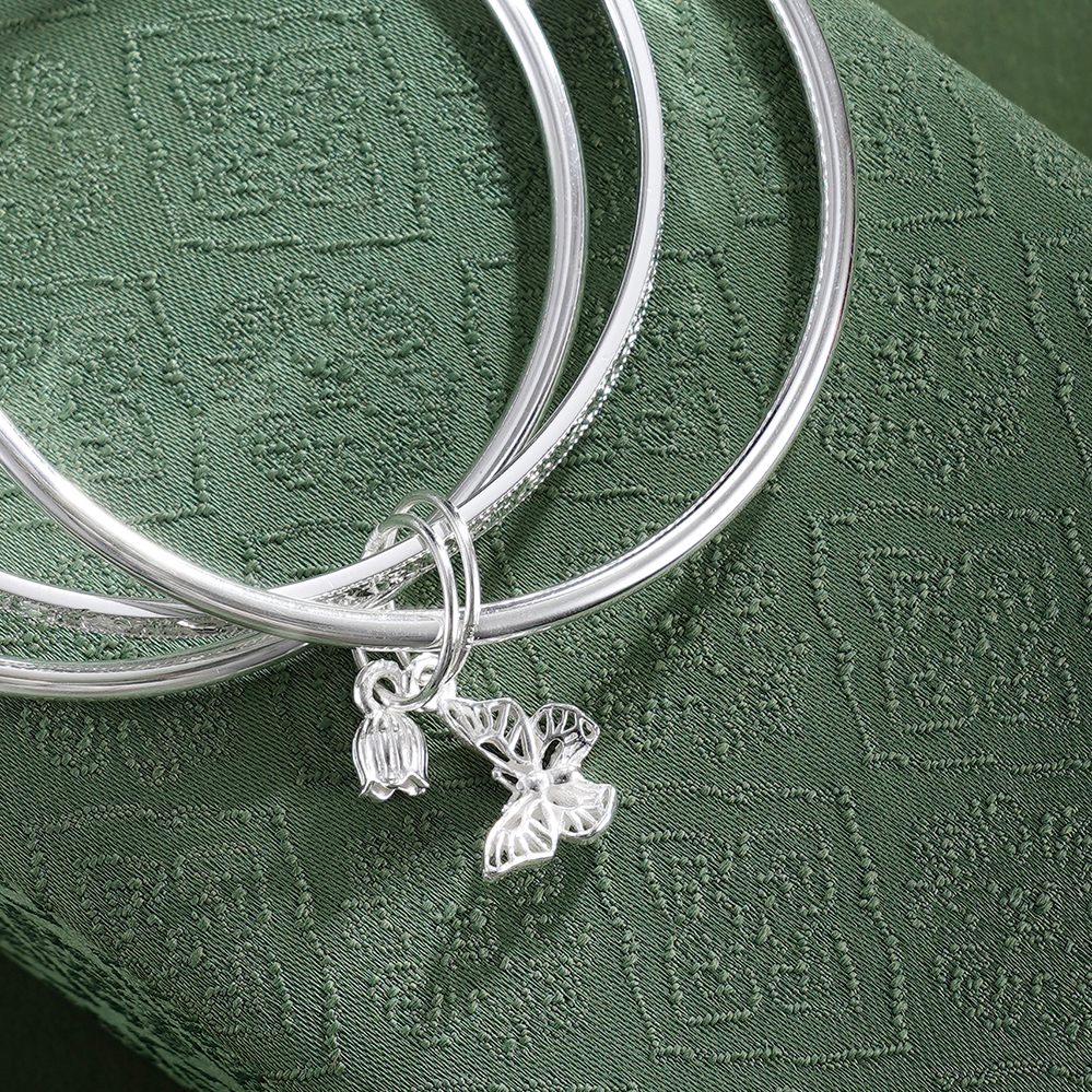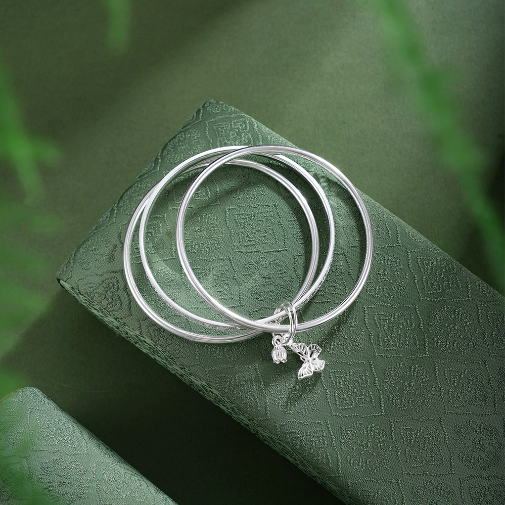 【寓意】:以纯银三圈叠戴,取“三生万物”之圆满,蝴蝶与铃兰花轻缀其间,蝴蝶象征自由蜕变,铃兰寓意幸福归来,二者相映,一生顺遂无忧,美好常伴左右。