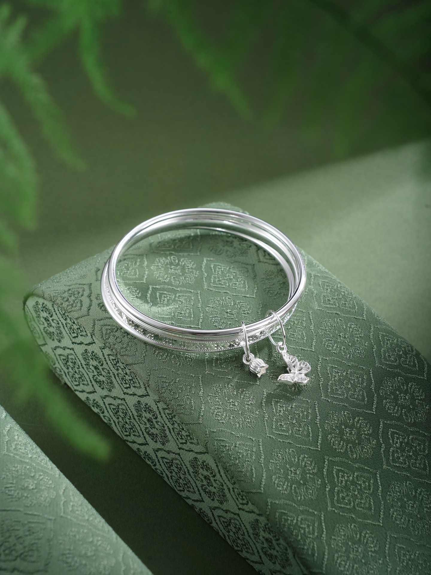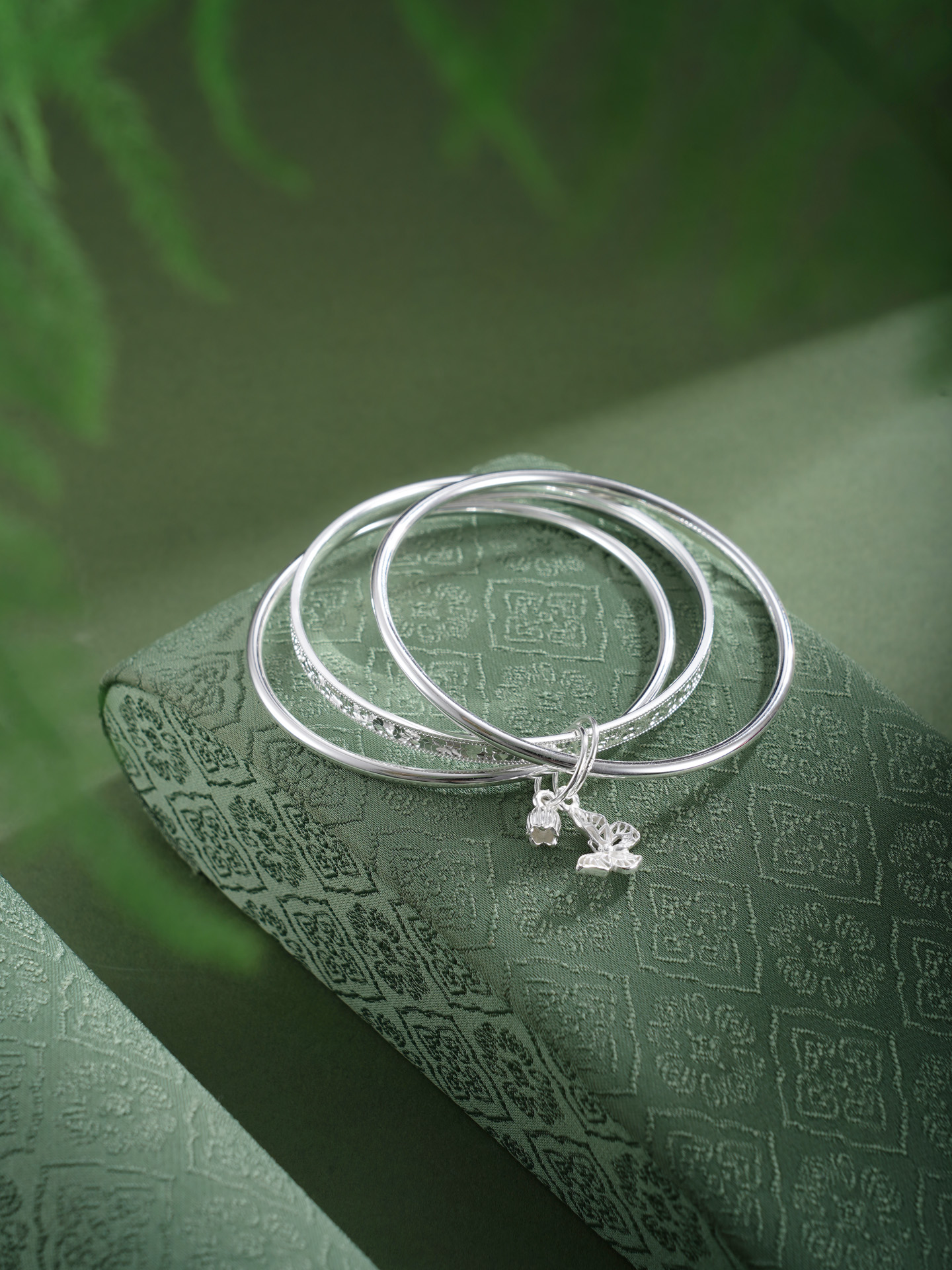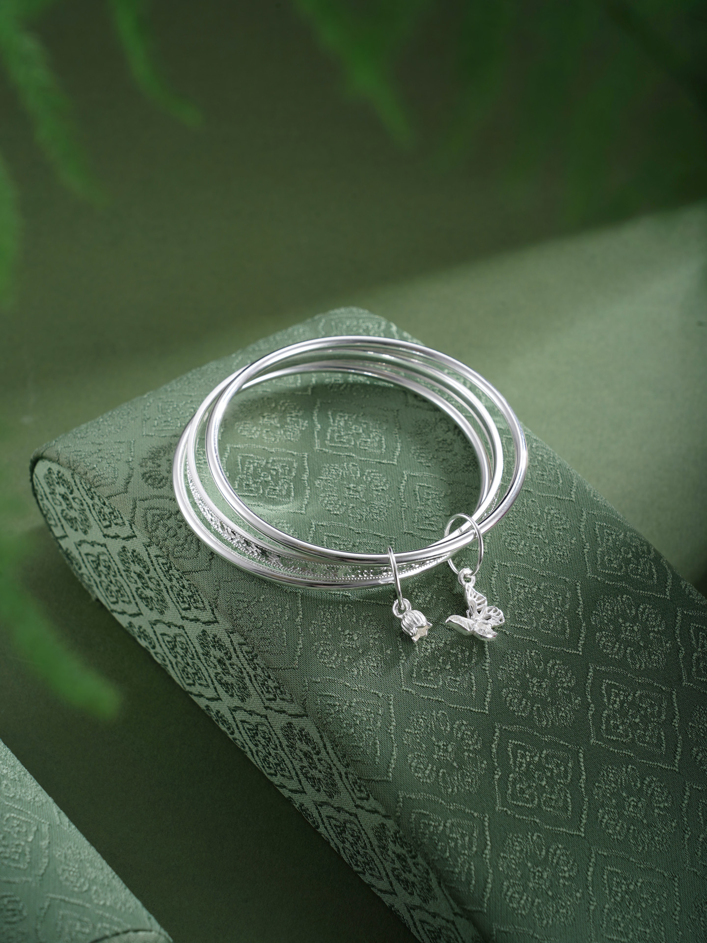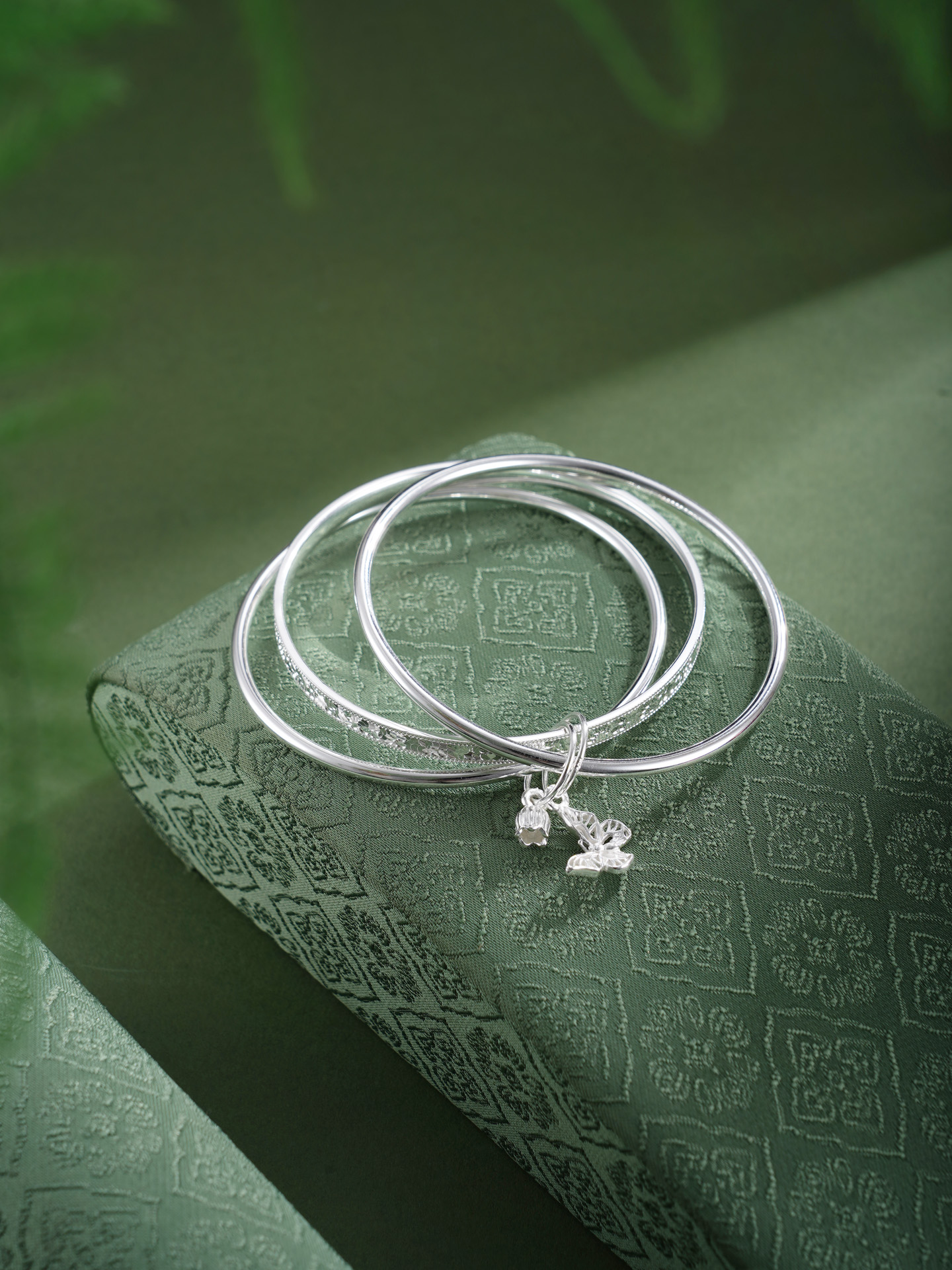 【寓意】:以纯银三圈叠戴,取“三生万物”之圆满,蝴蝶与铃兰花轻缀其间,蝴蝶象征自由蜕变,铃兰寓意幸福归来,二者相映,一生顺遂无忧,美好常伴左右。
