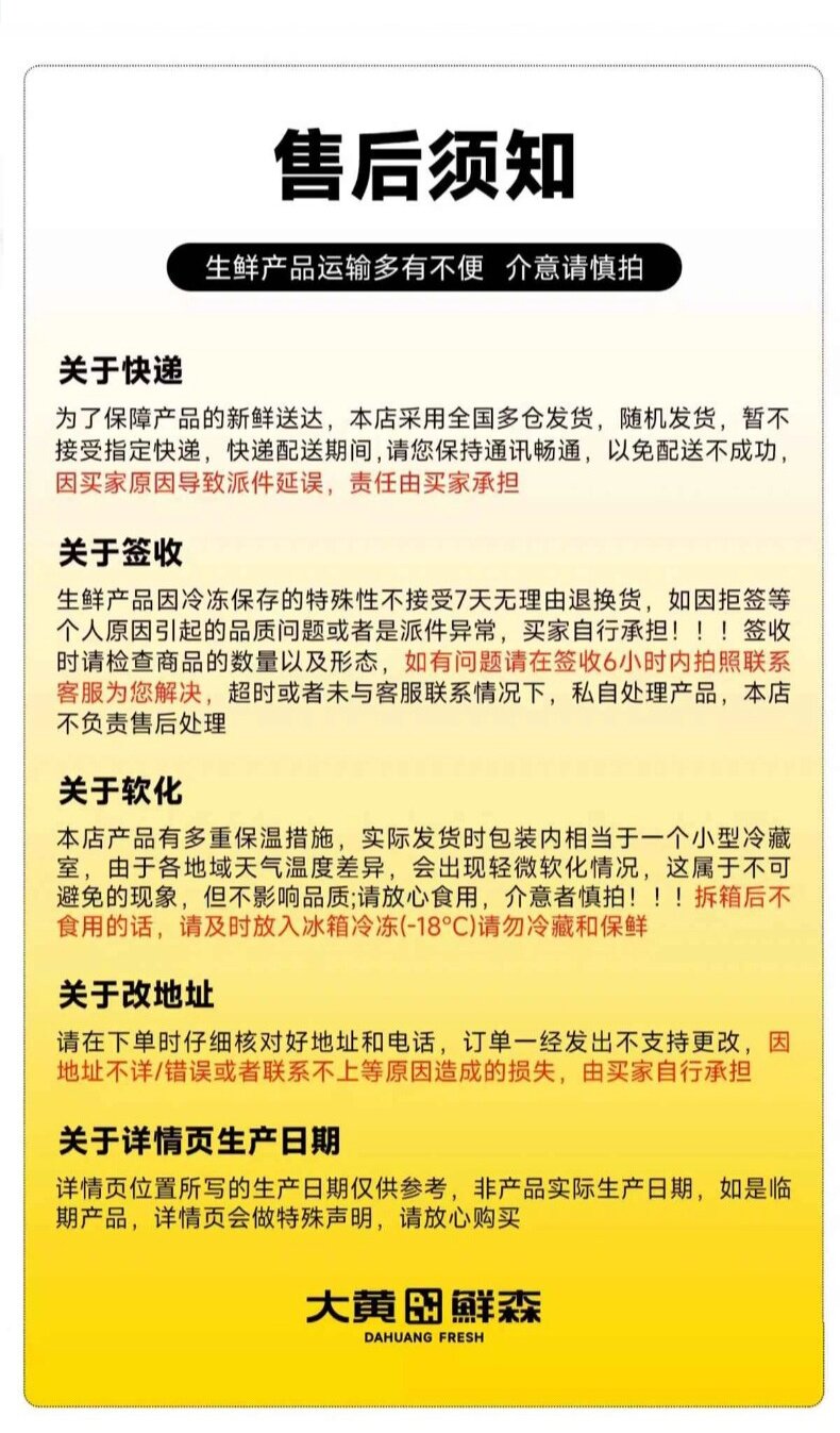 1、该产品属于生鲜食品类,不支持7天无理由退换货;