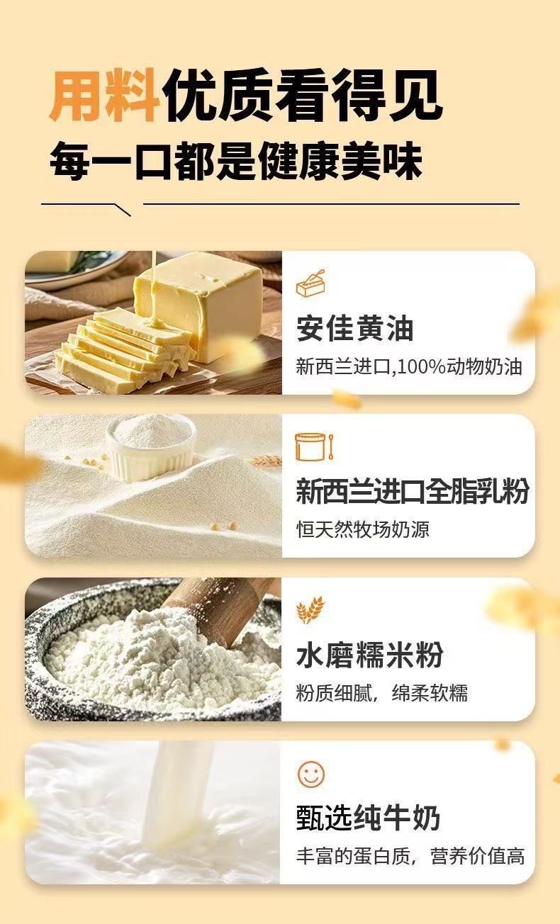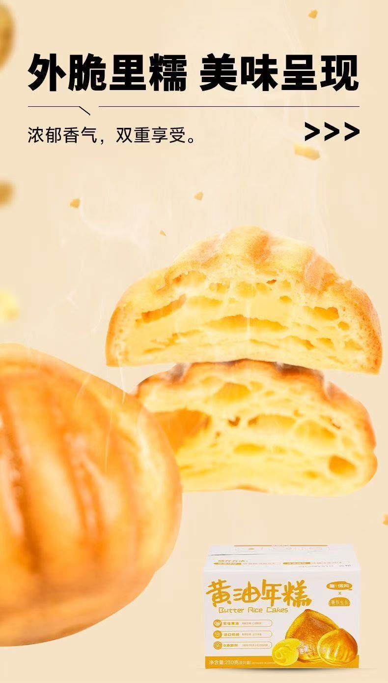【美味零食丨黄油烤年糕 230g*8/盒】甄选纯牛奶,优质水磨糯米粉等,都是现做现发,外脆里糯,奶香浓郁口感软糯,大小均匀,早餐一口满足,下午茶和野外郊游也可带