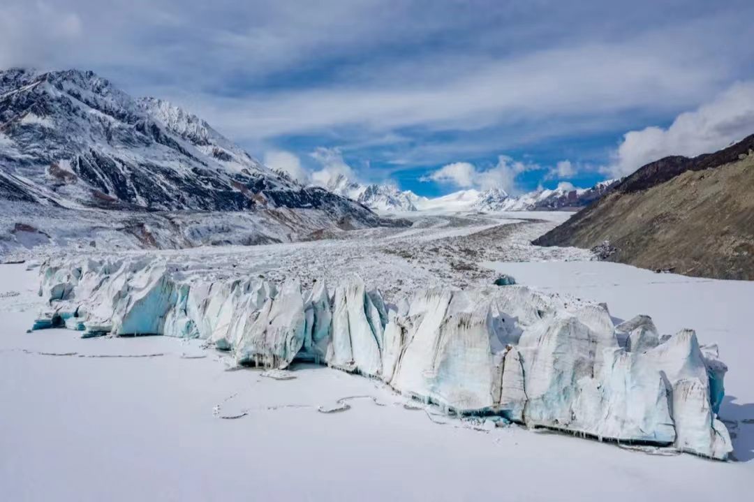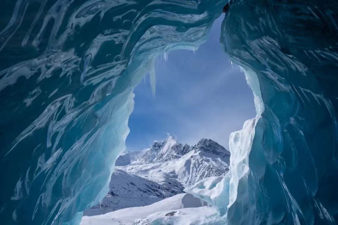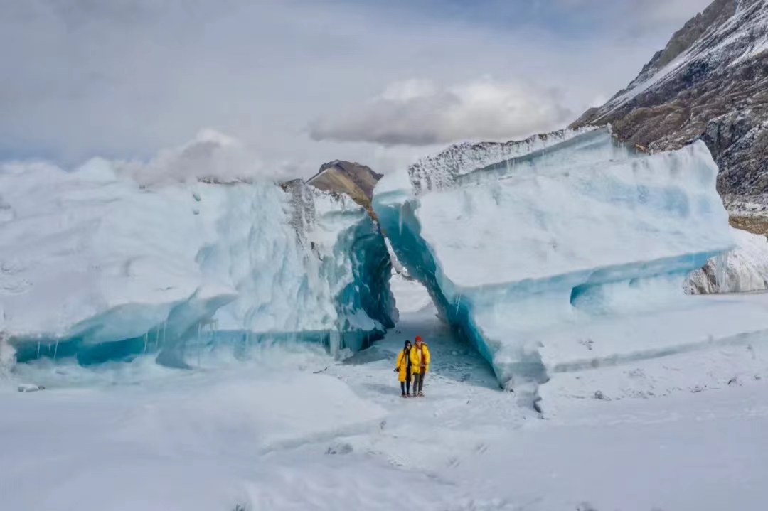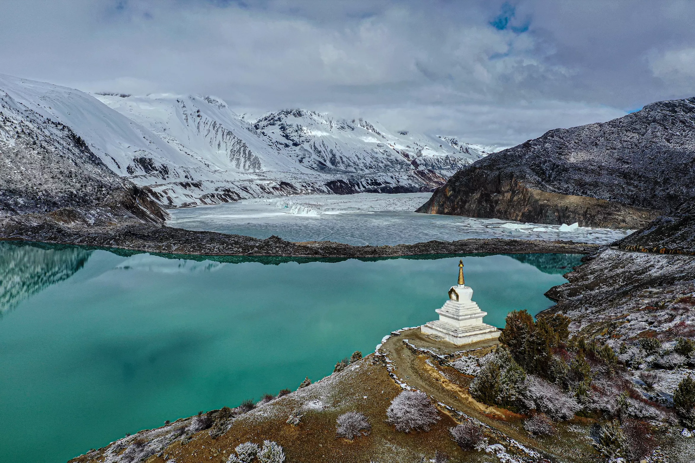 普隆寺是一处游客鲜至的静心之所。这座有着400余年历史的古寺虽然规模不大,却在信众中有着很高的声誉,寺庙中每日飘荡着煨桑的香气,红墙后冰岩交织的纹路清晰可见。站在寺庙山崖边向西眺望,便是朱西冰川伏卧在群山之中的巨大冰体。不同时节前来,都能在同一画面中找到四季的色彩。