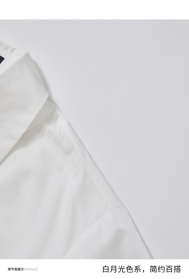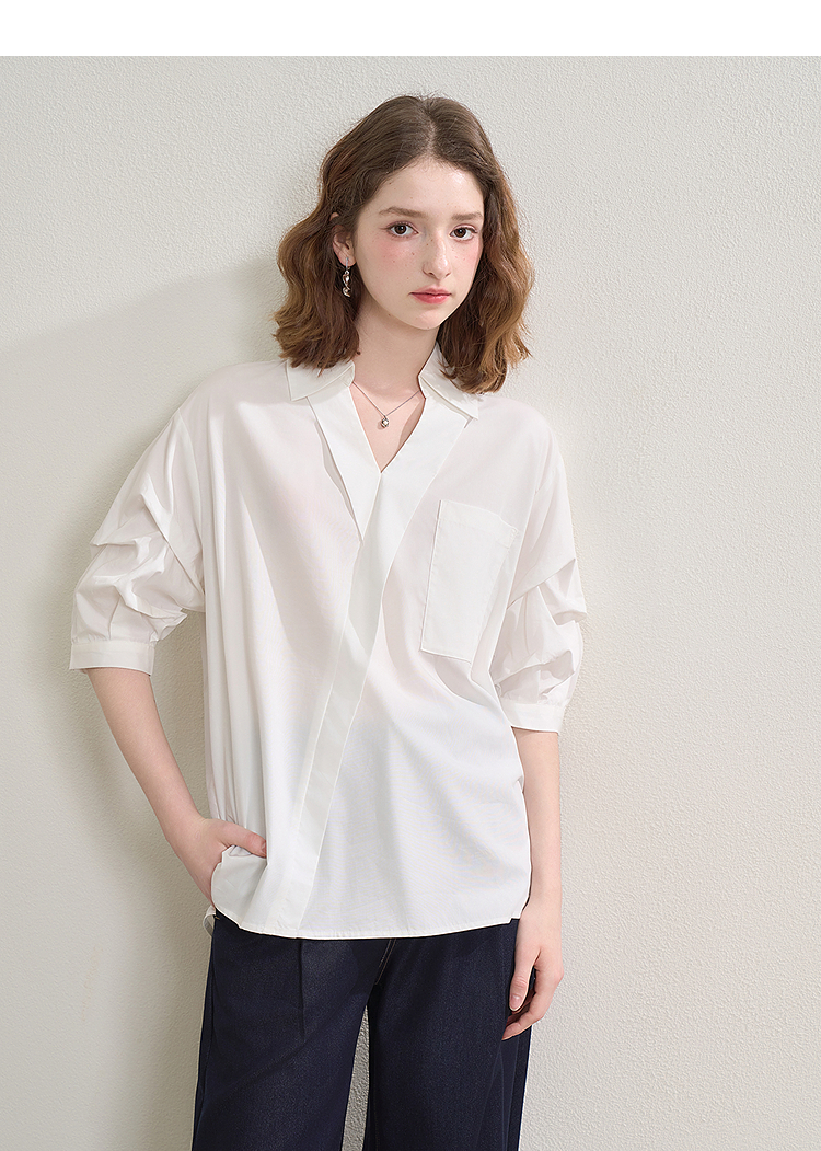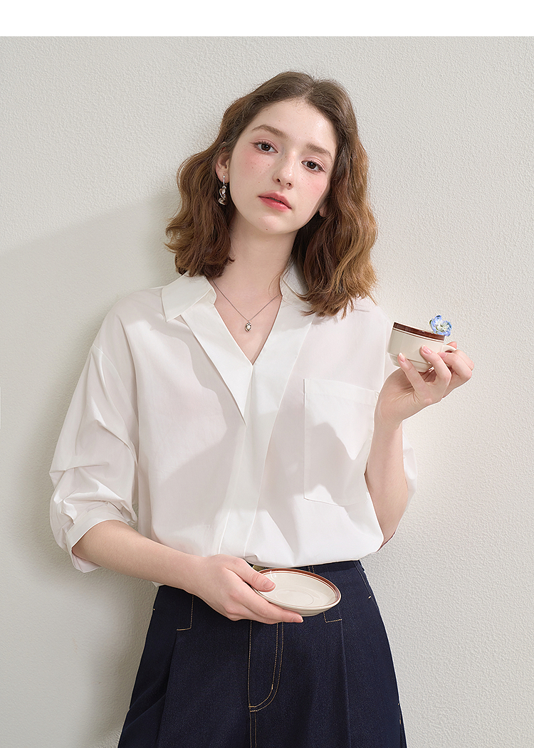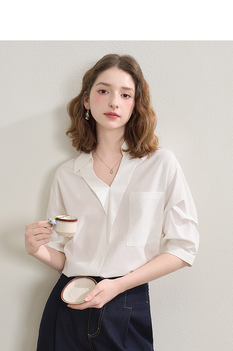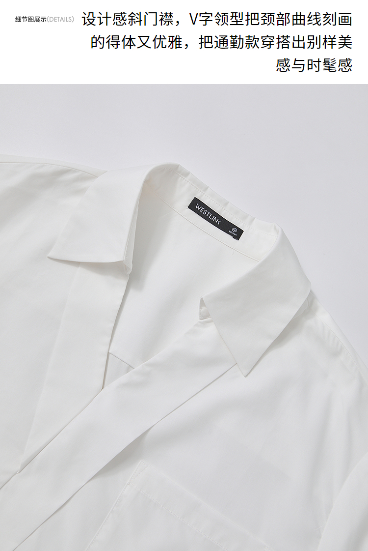 气质V领通勤白衬衫女夏季斜门襟设计感百搭显瘦短袖衬衣V0850322