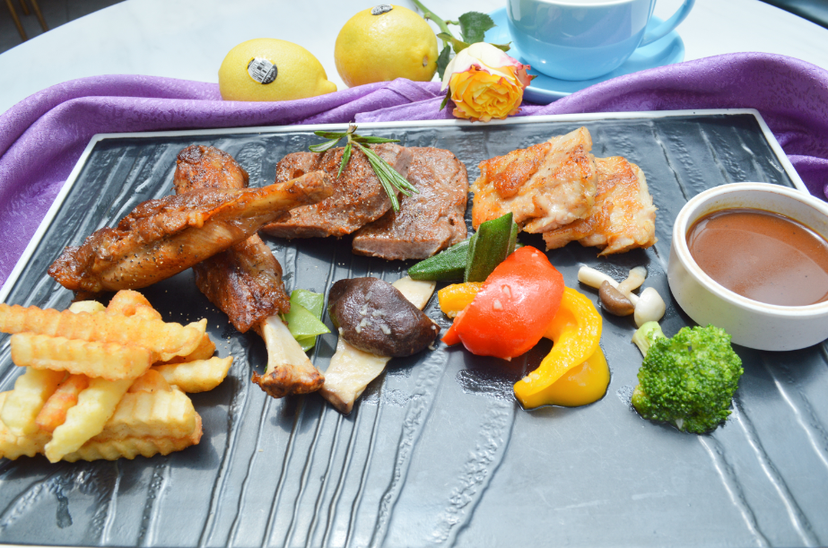 欧亚组合:嫩煎谷饲西冷牛扒+炭烧猪仔骨+日式照烧鸡扒+法式炸薯条+蒜香炒什菜