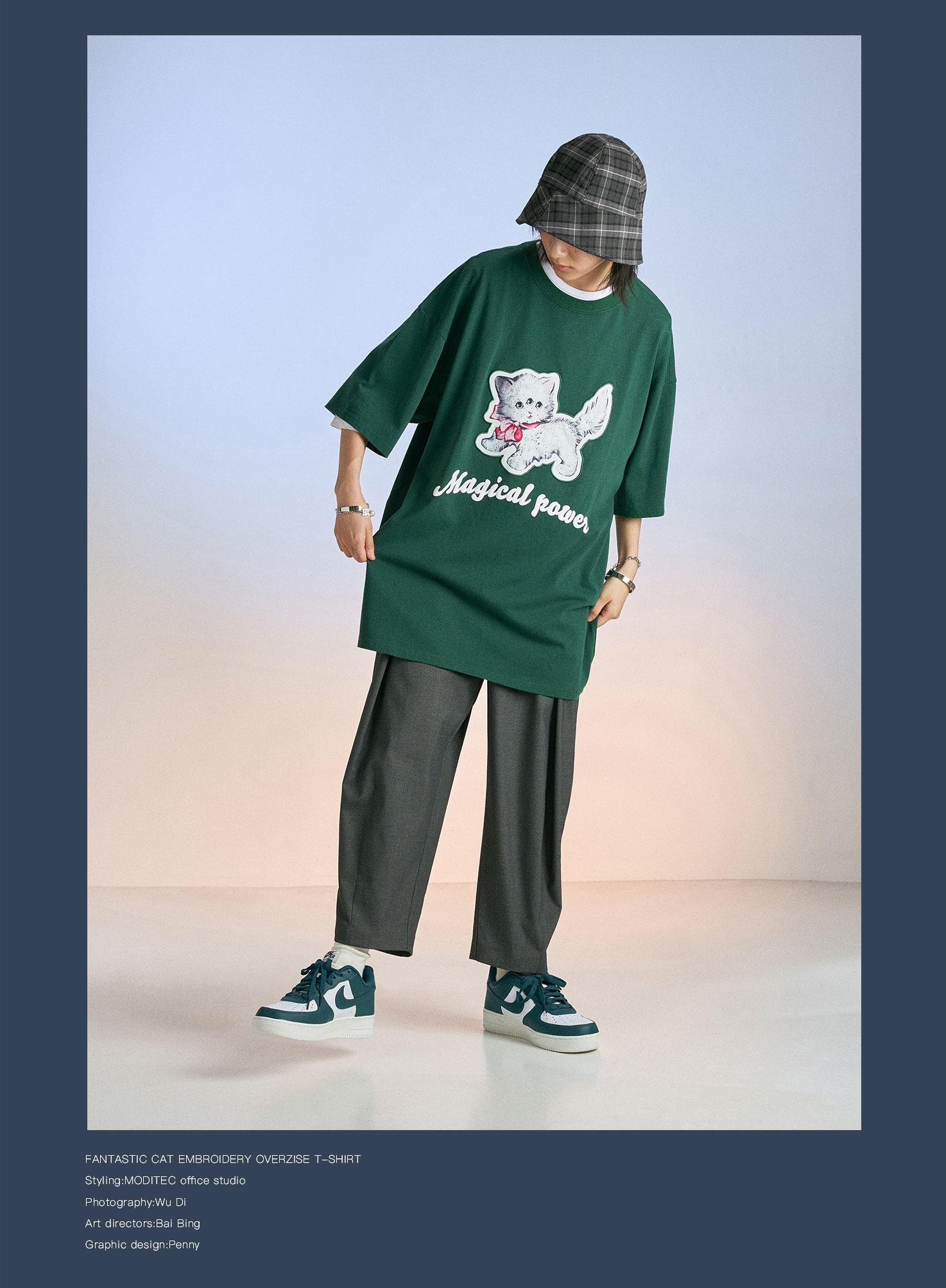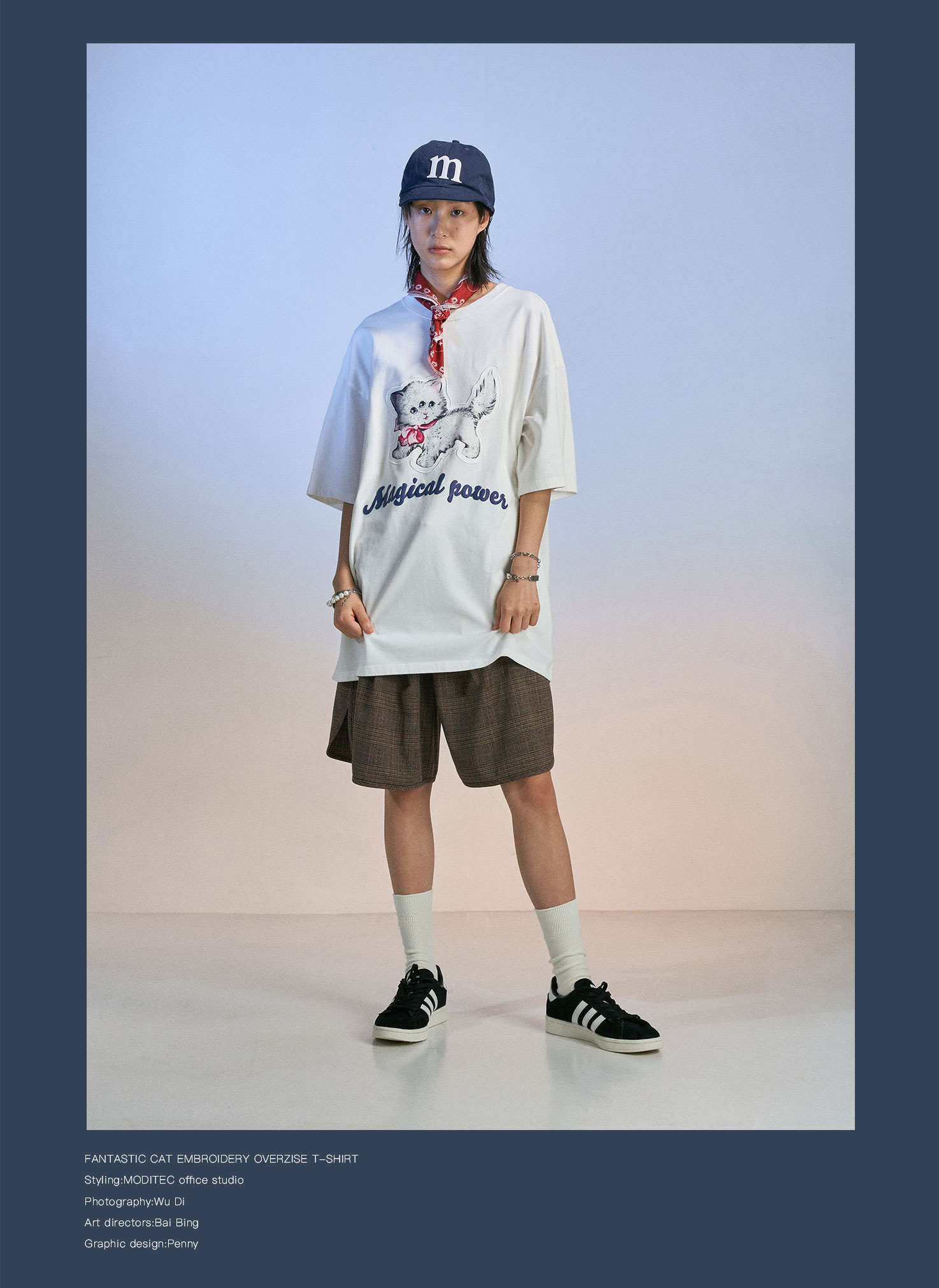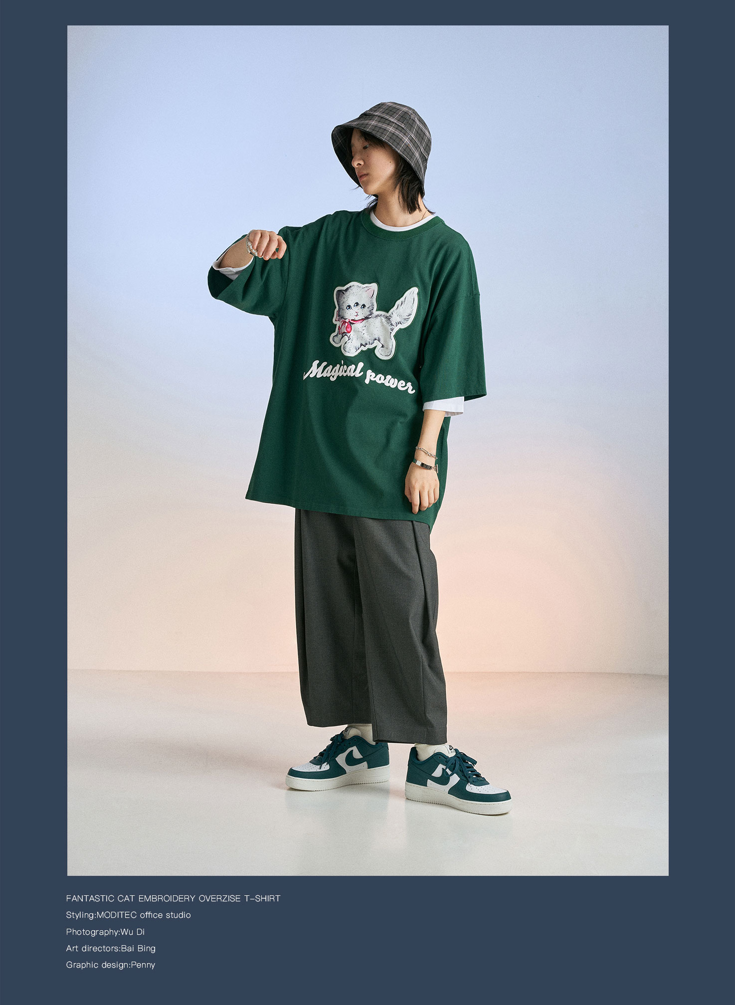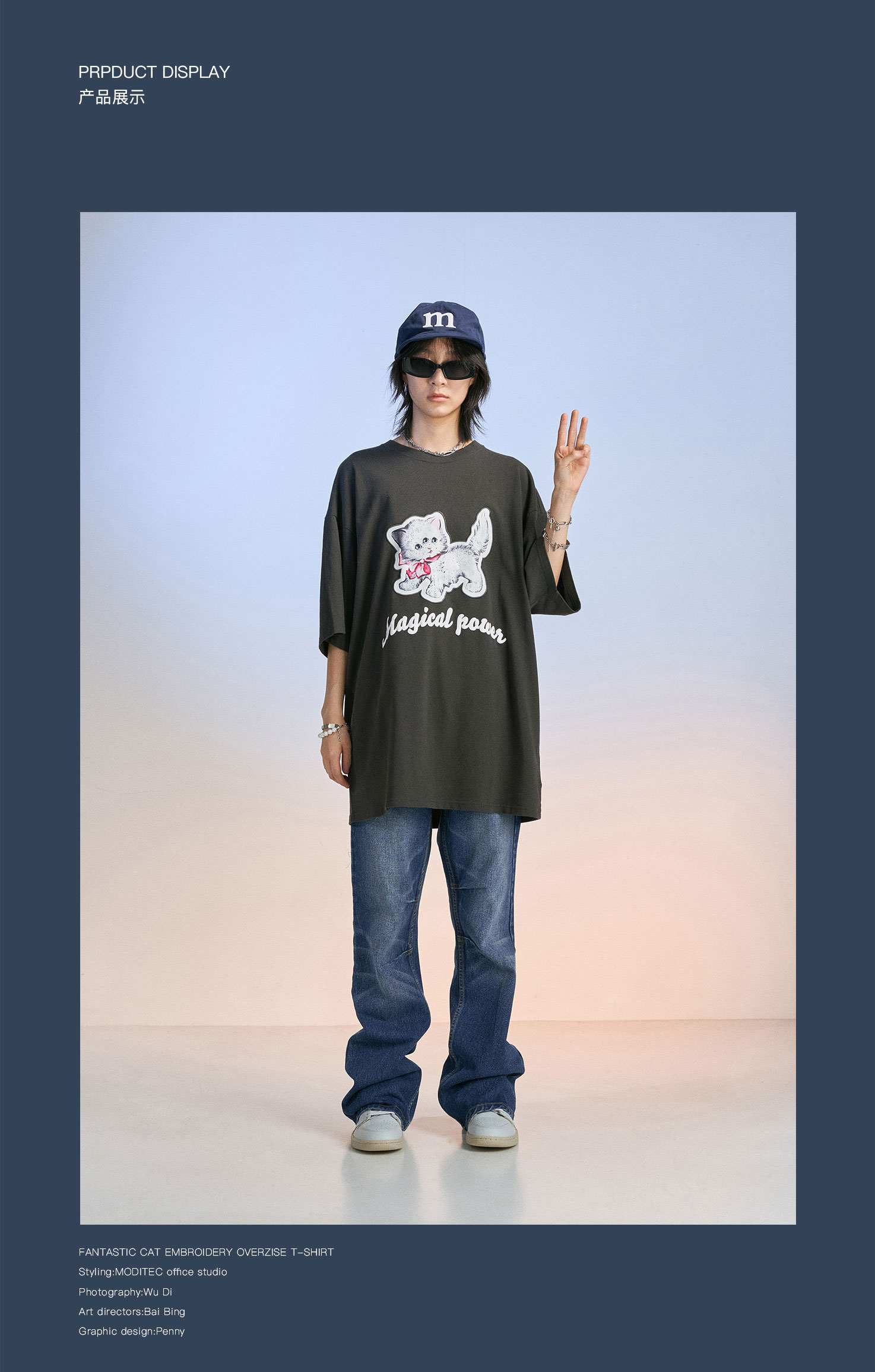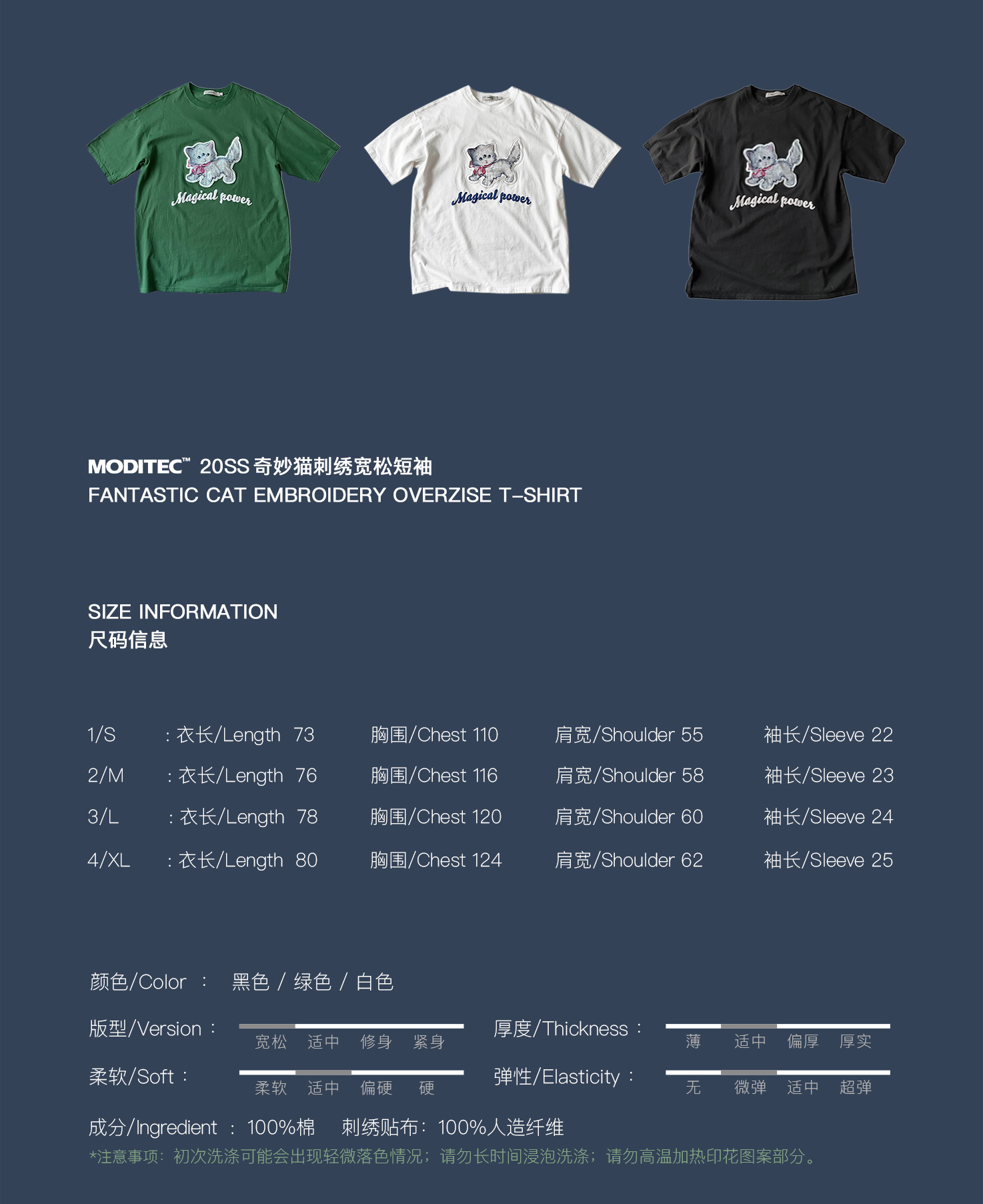 MODITEC 20SS 多色奇妙猫落肩短袖 刺绣印花宽松廓形短袖纯棉T恤
