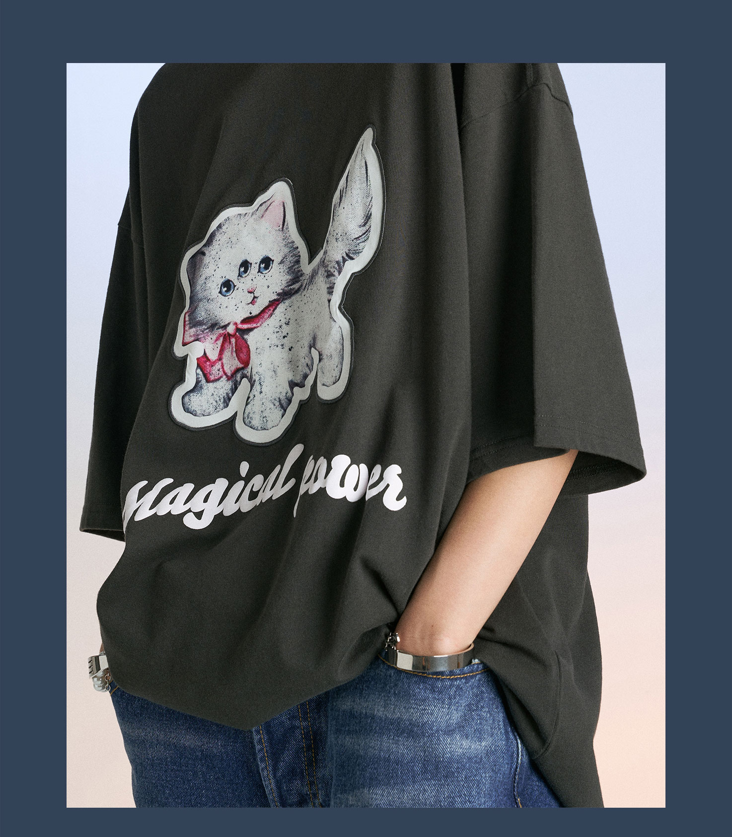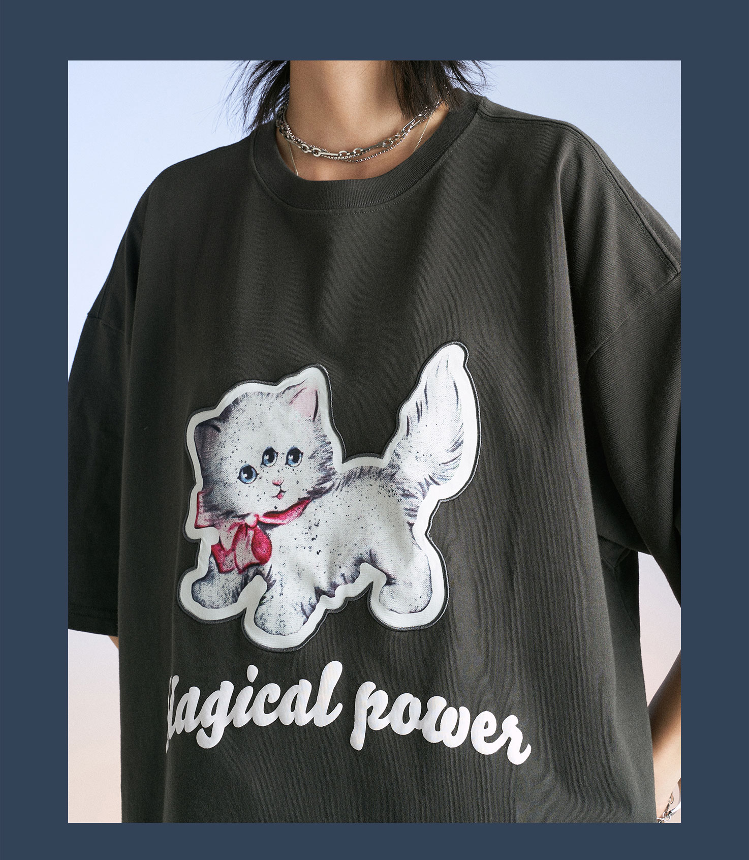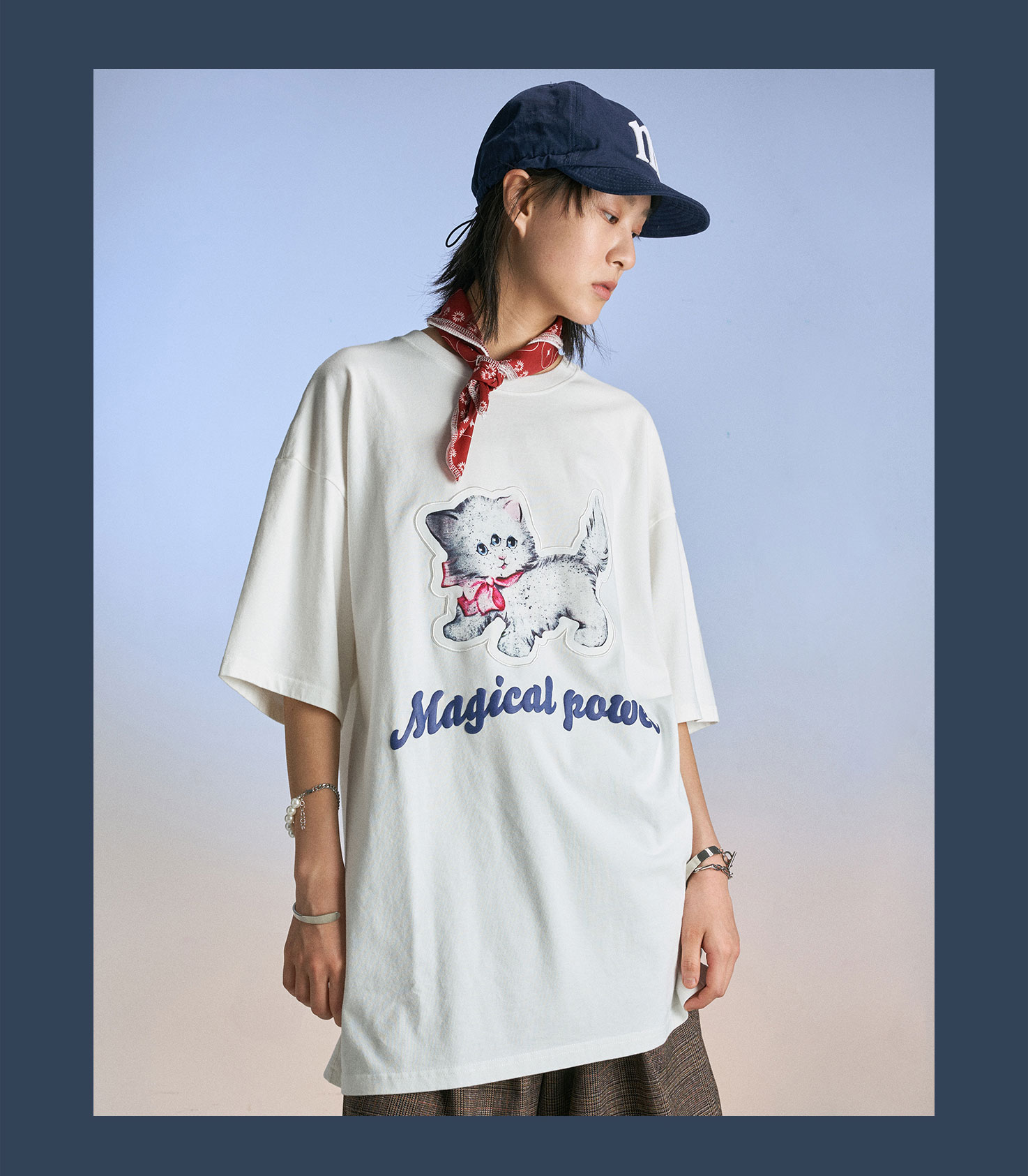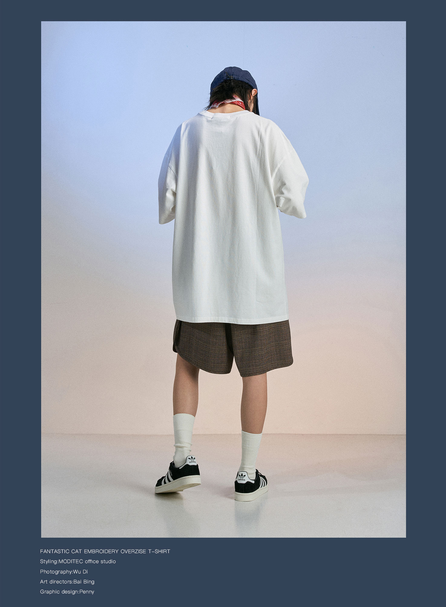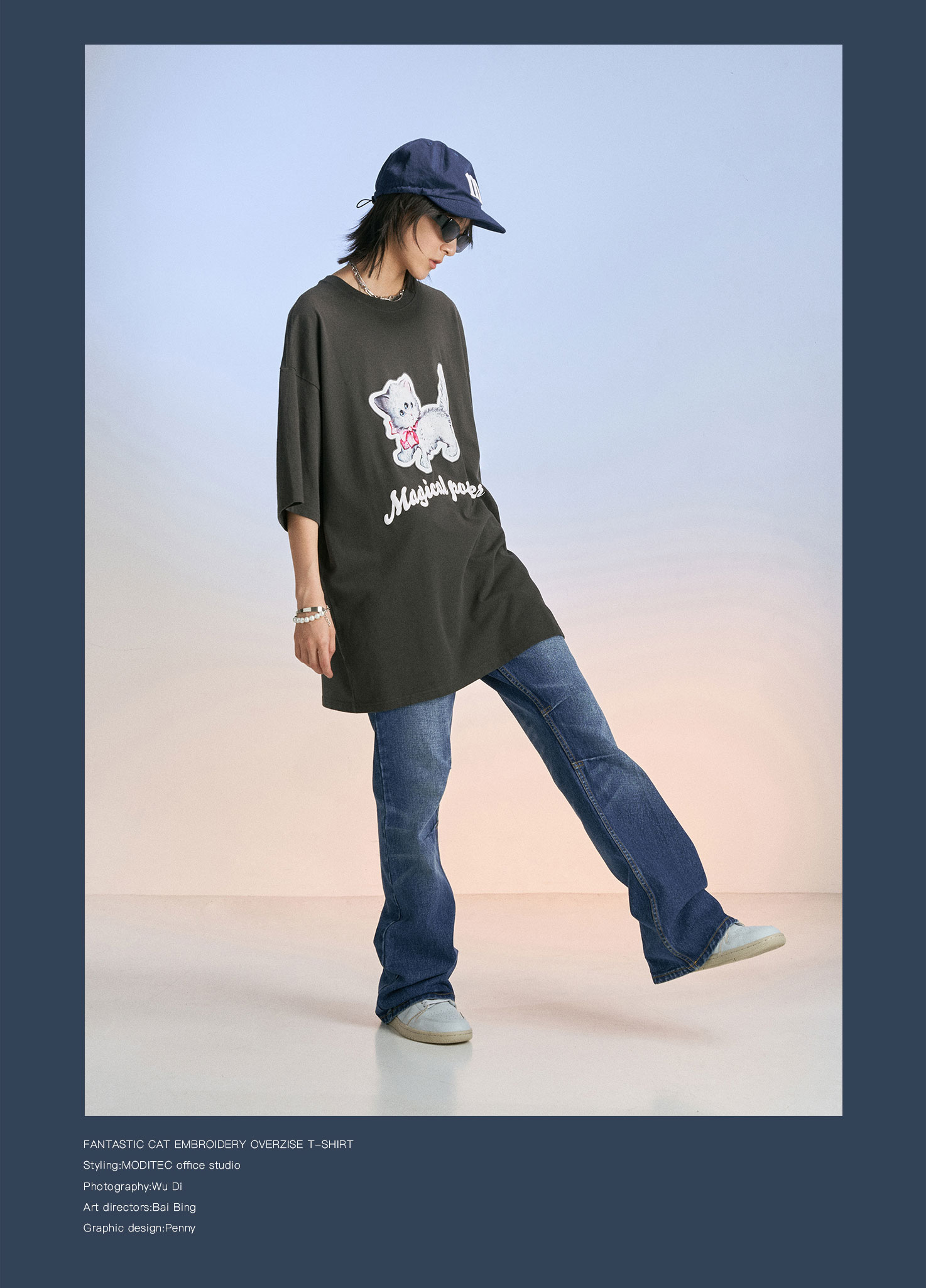 MODITEC 20SS 多色奇妙猫落肩短袖 刺绣印花宽松廓形短袖纯棉T恤