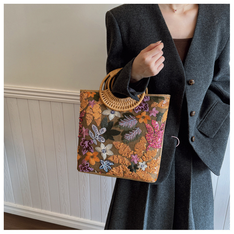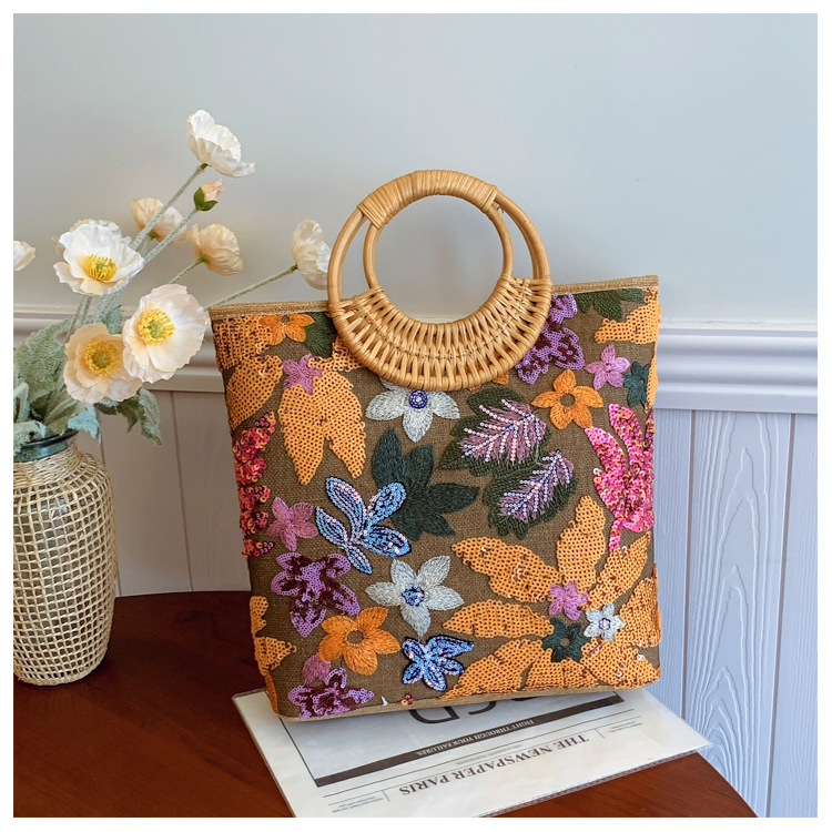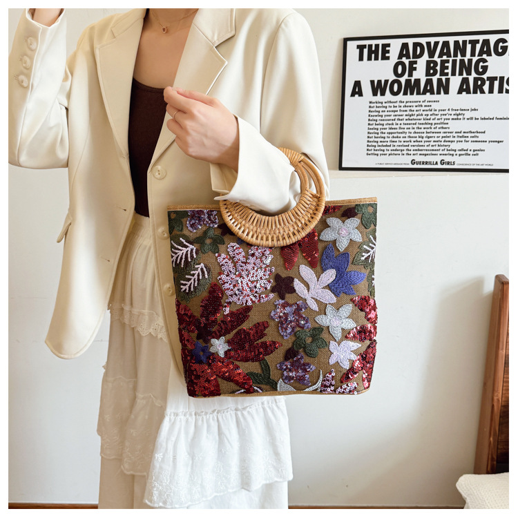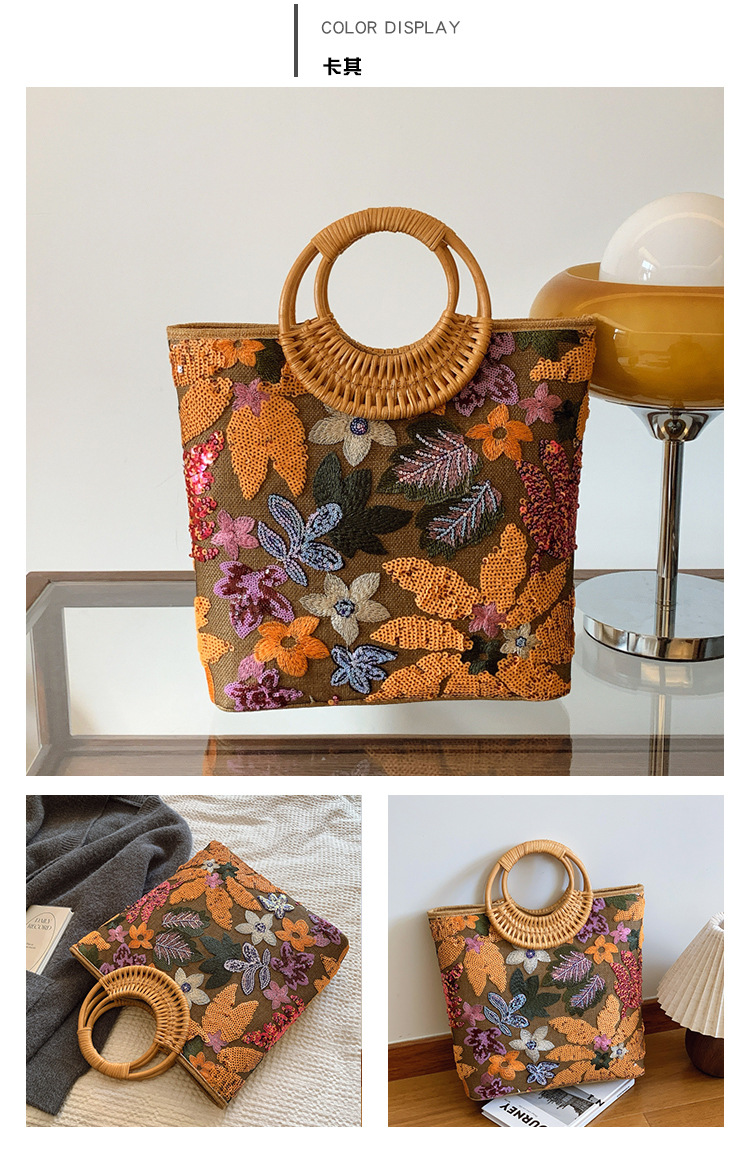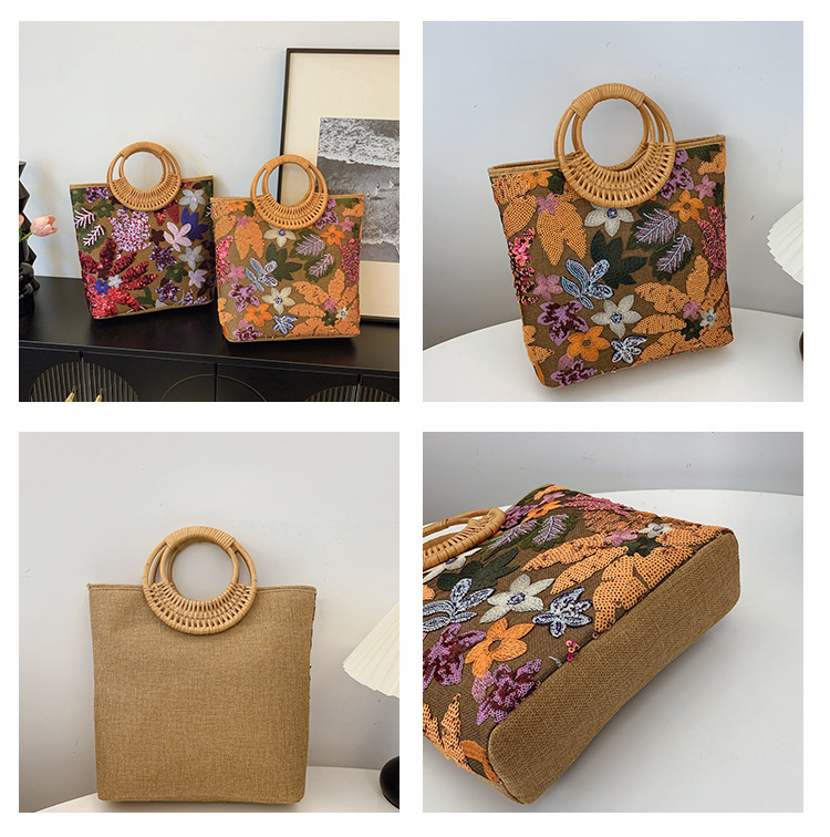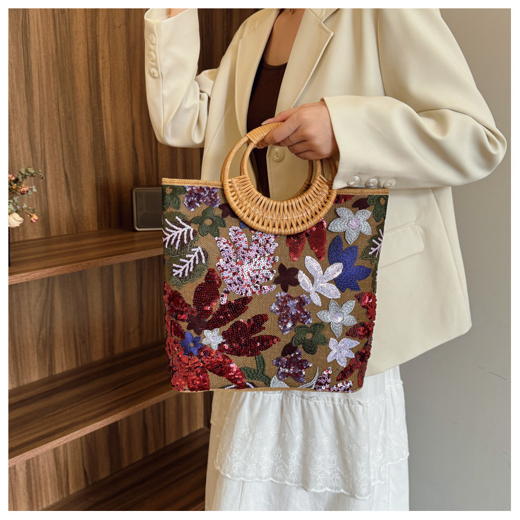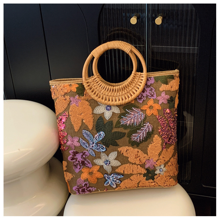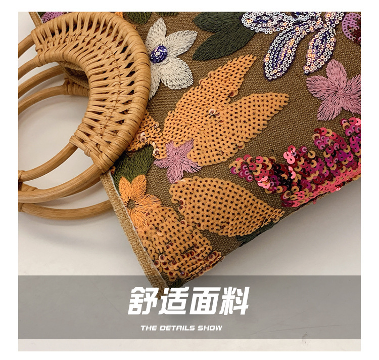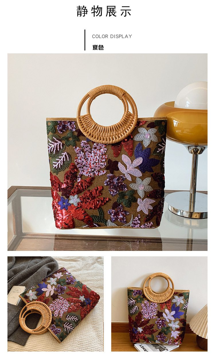 【小众高奢刺绣包包】亮片草编托特包 高奢小众刺绣女士包包 大容量时尚编织手提包