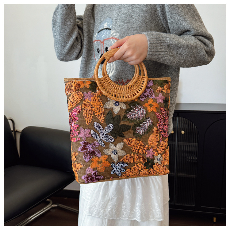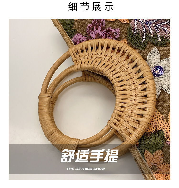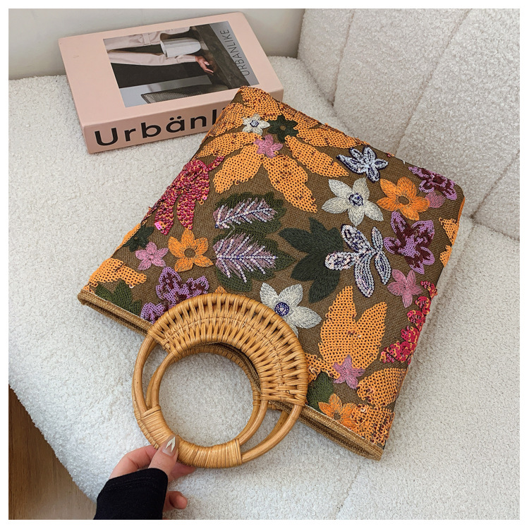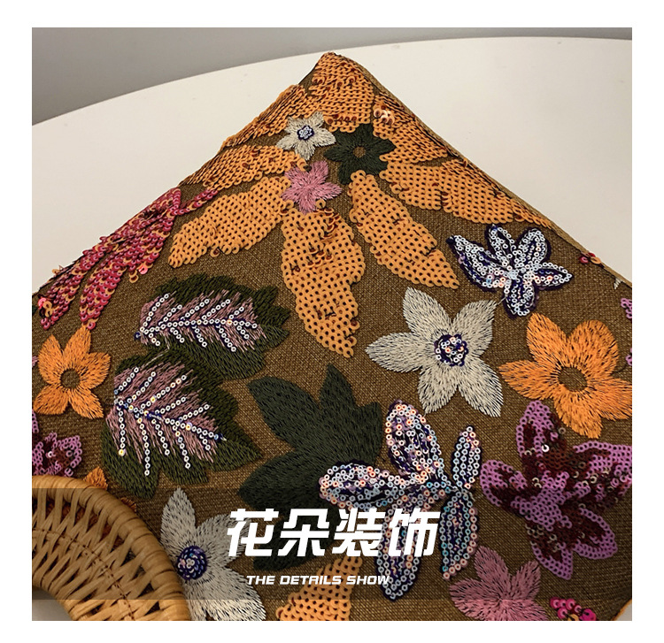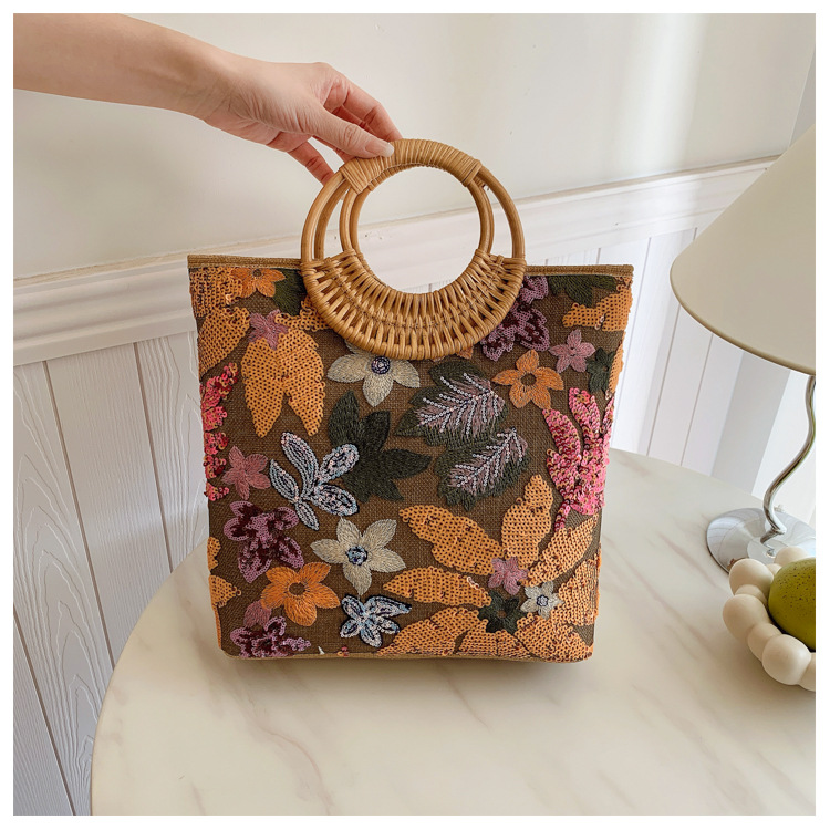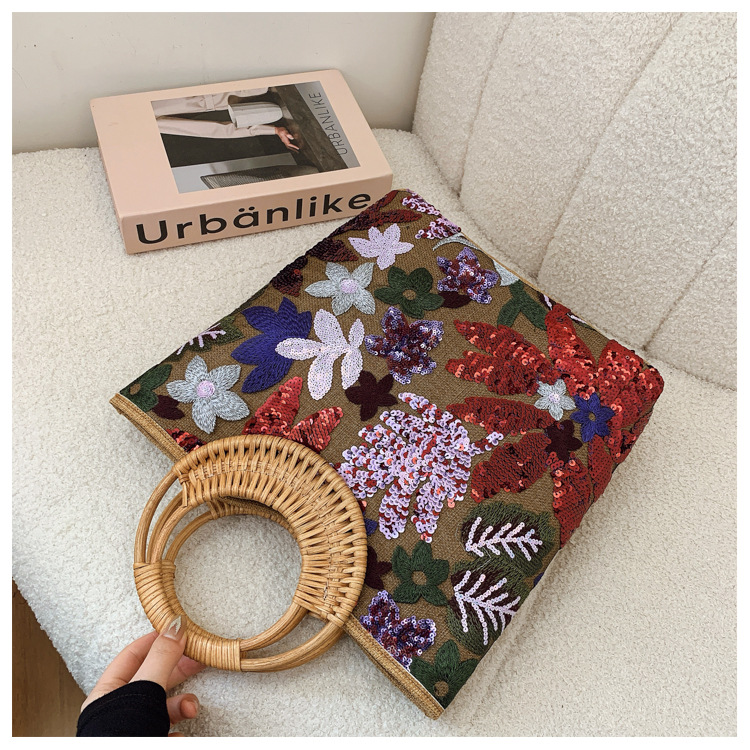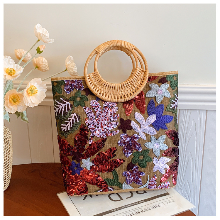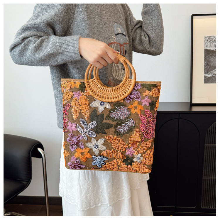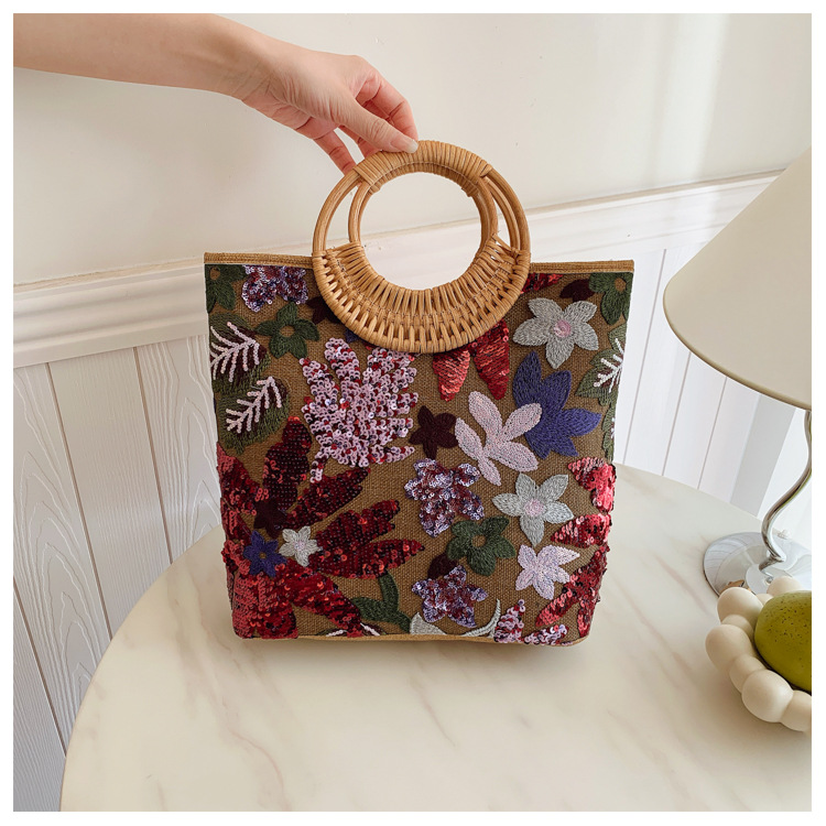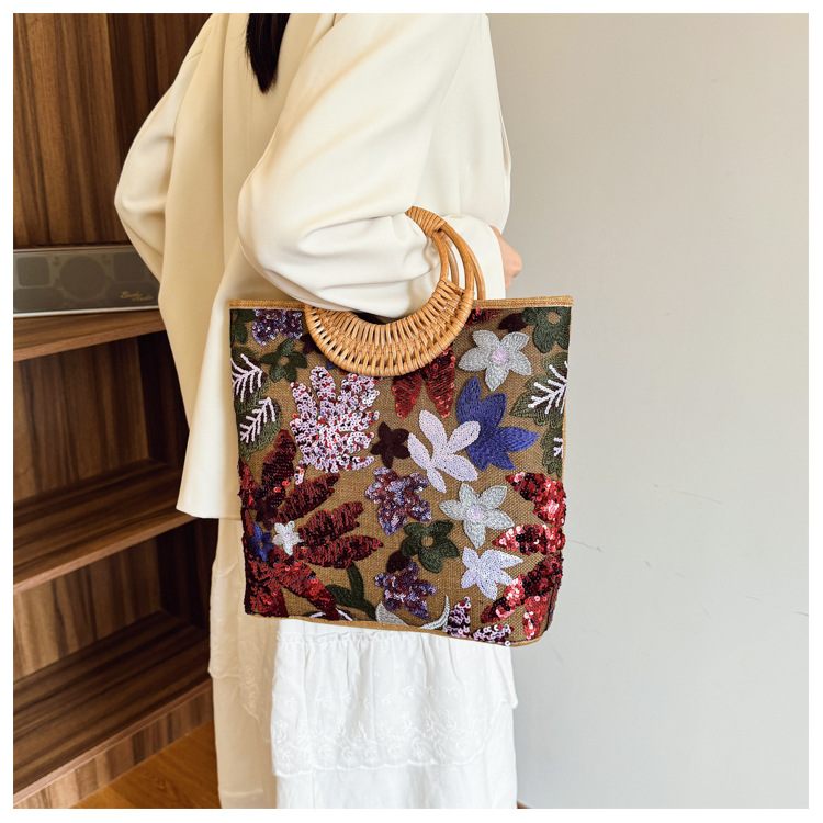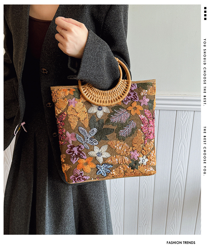 【小众高奢刺绣包包】亮片草编托特包 高奢小众刺绣女士包包 大容量时尚编织手提包