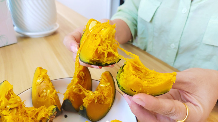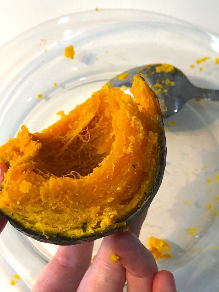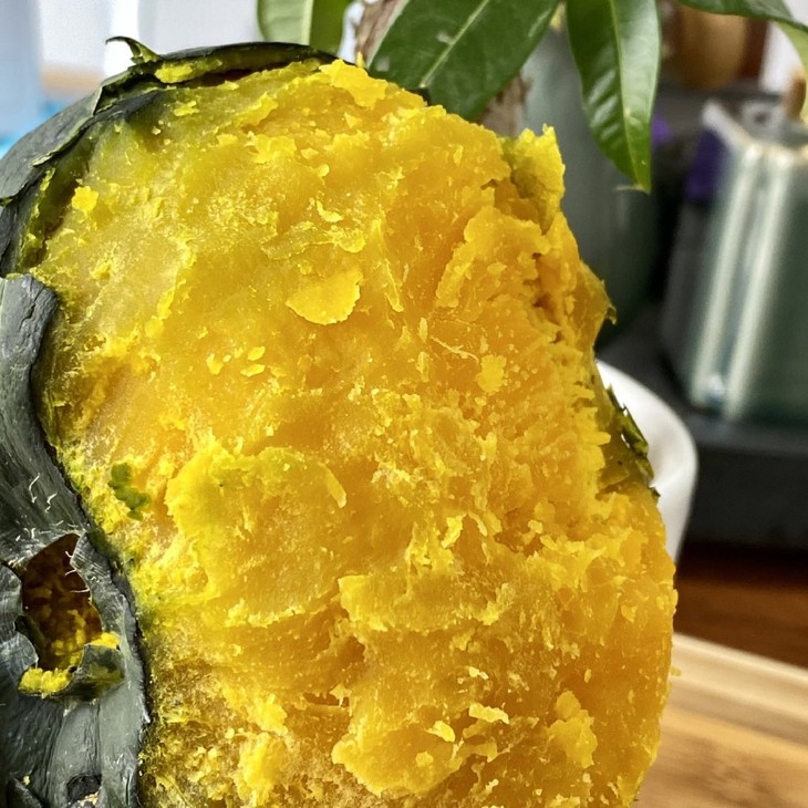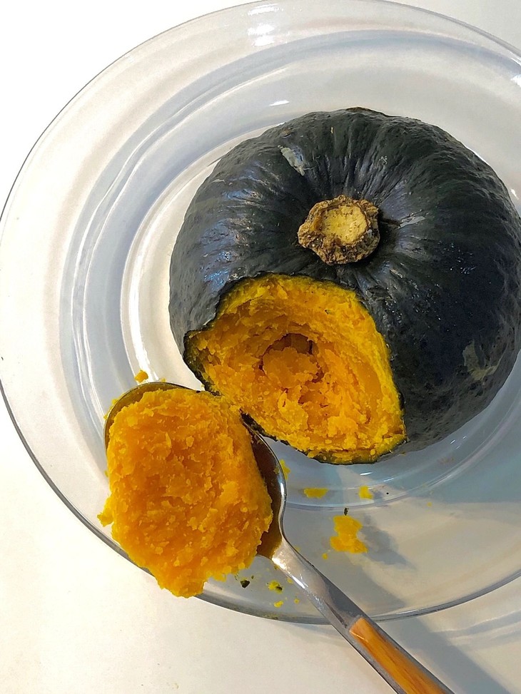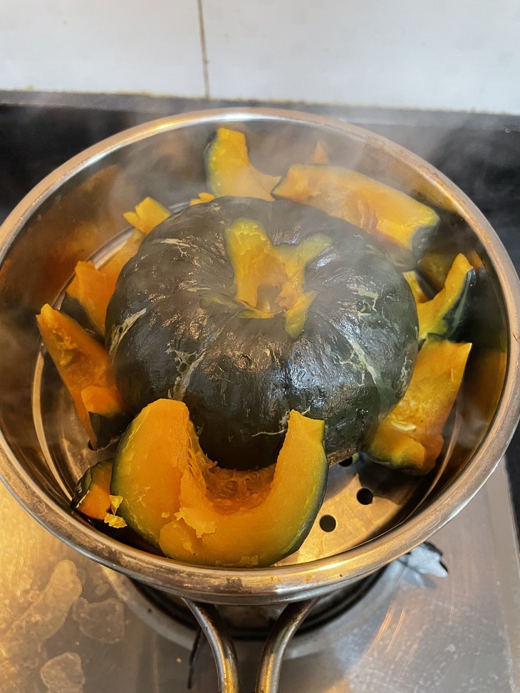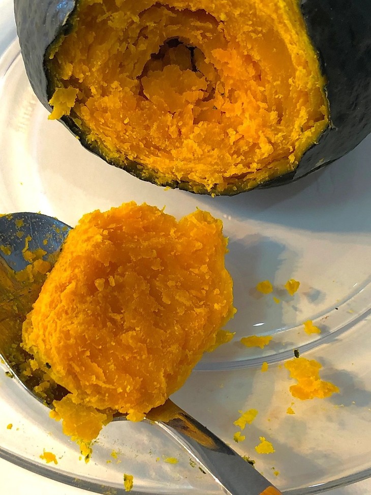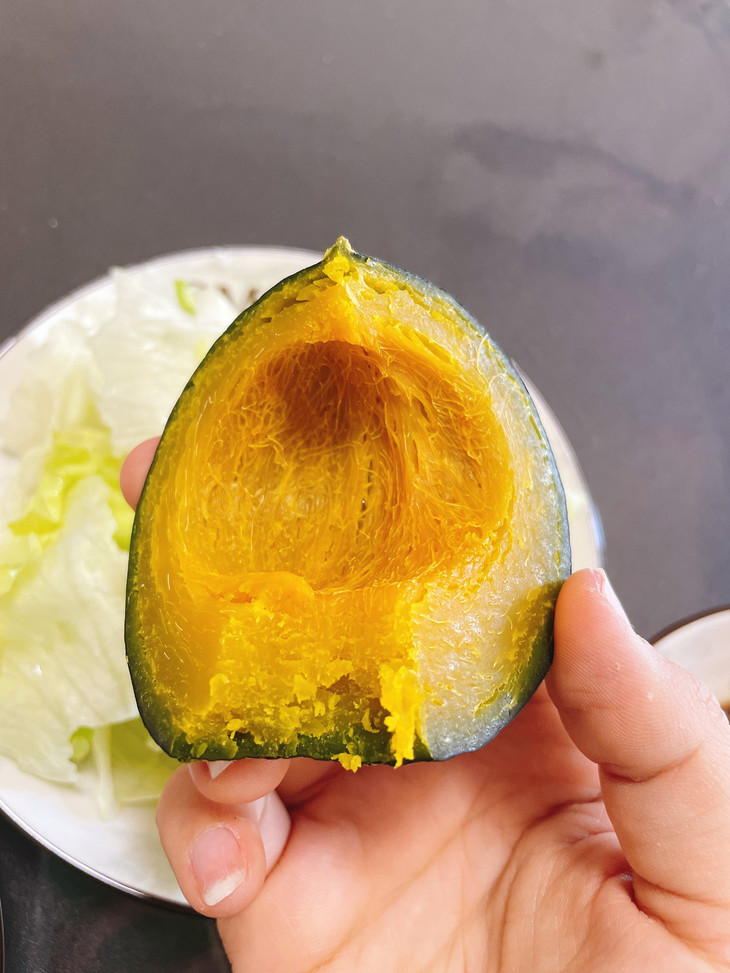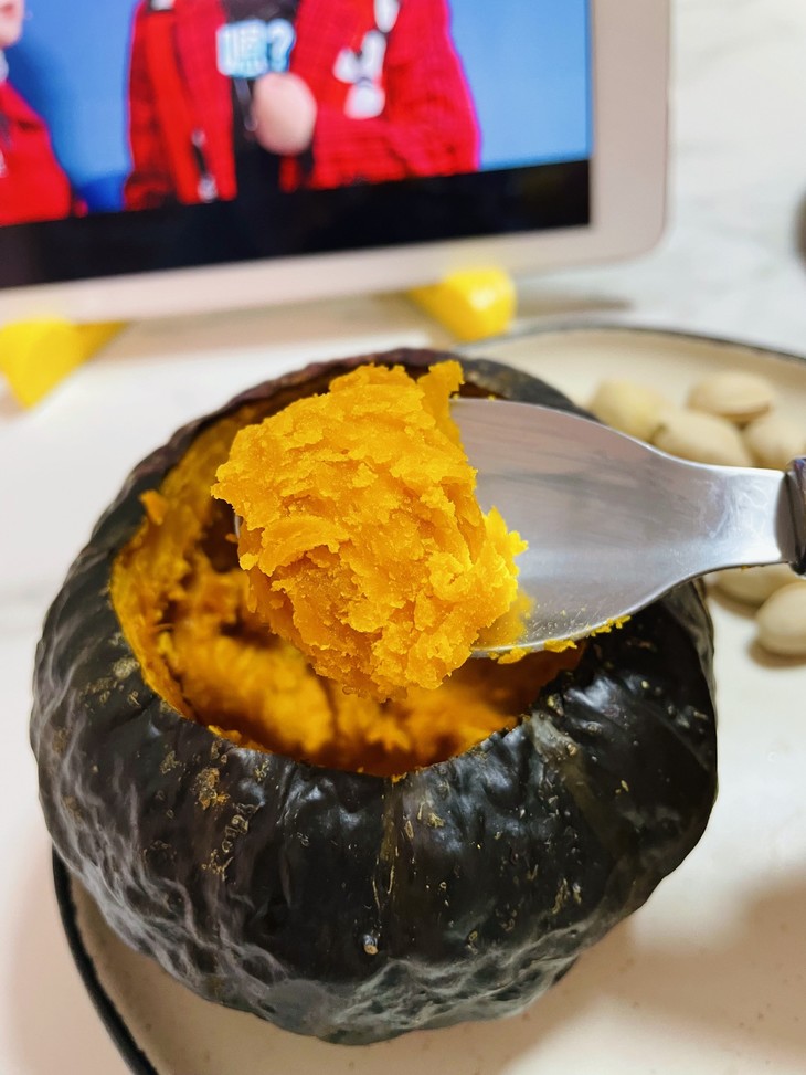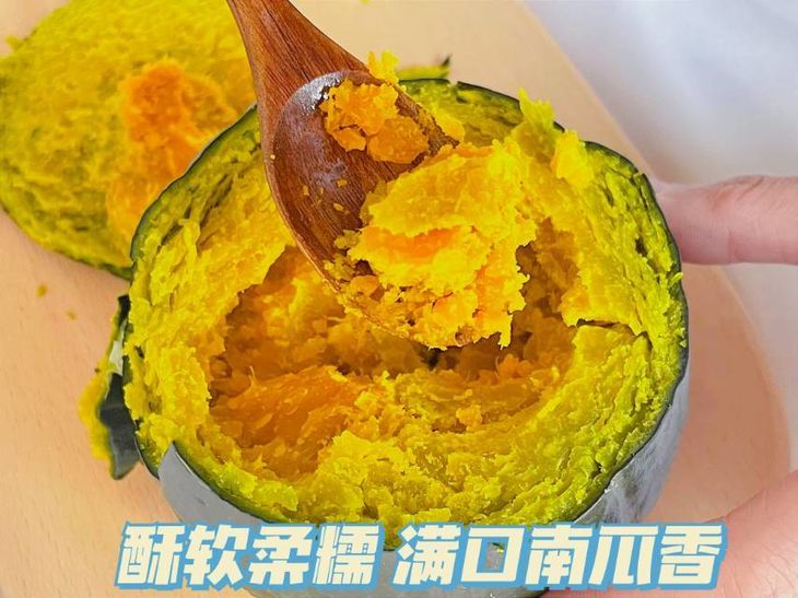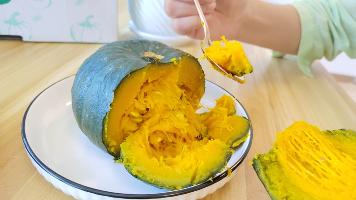 带皮蒸熟的贝贝南瓜,用勺子轻轻一压就变成了泥,浓郁的南瓜香扑面而来