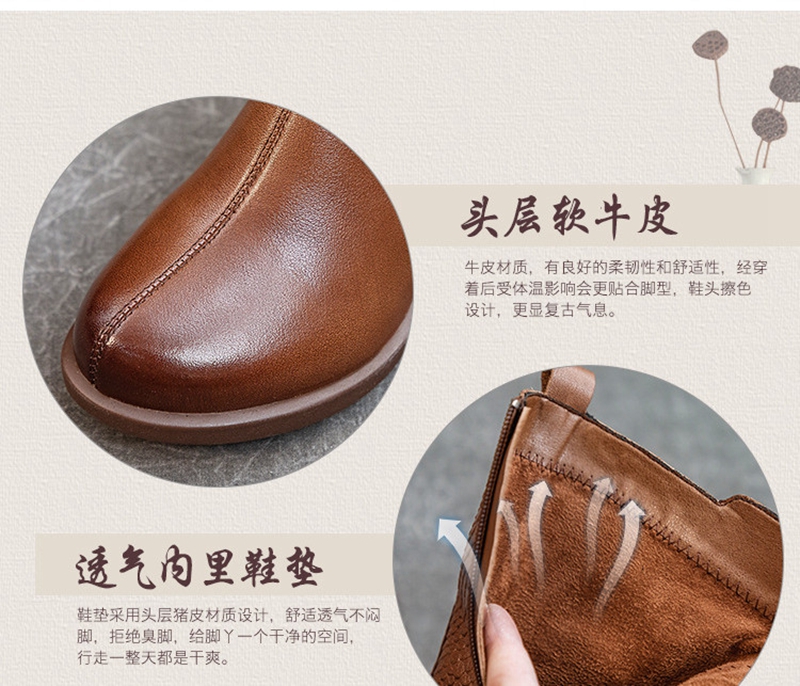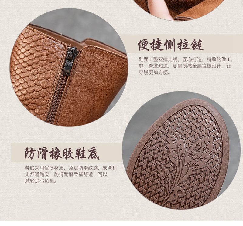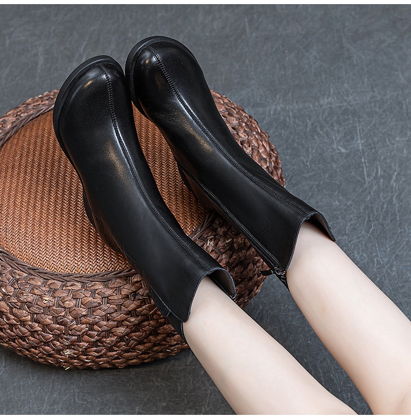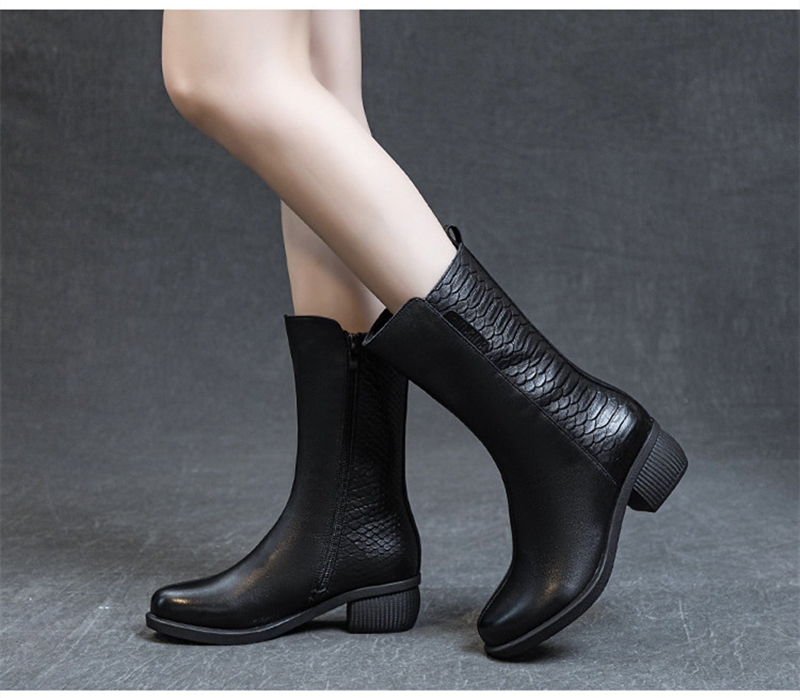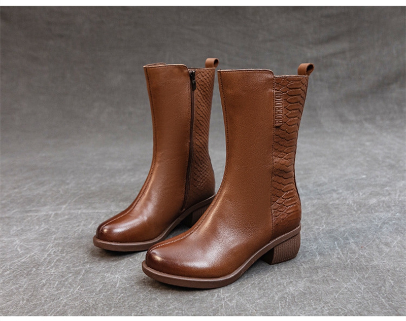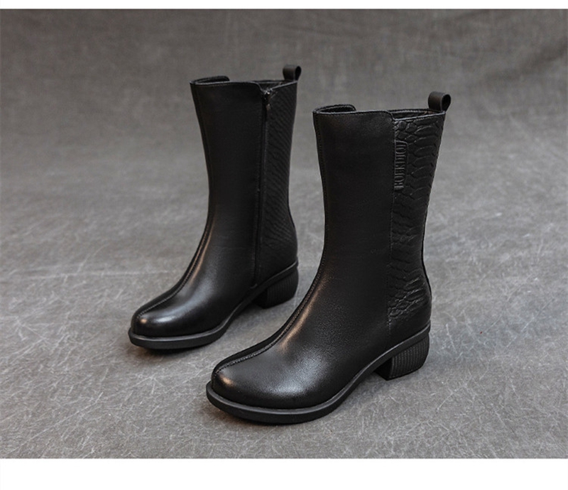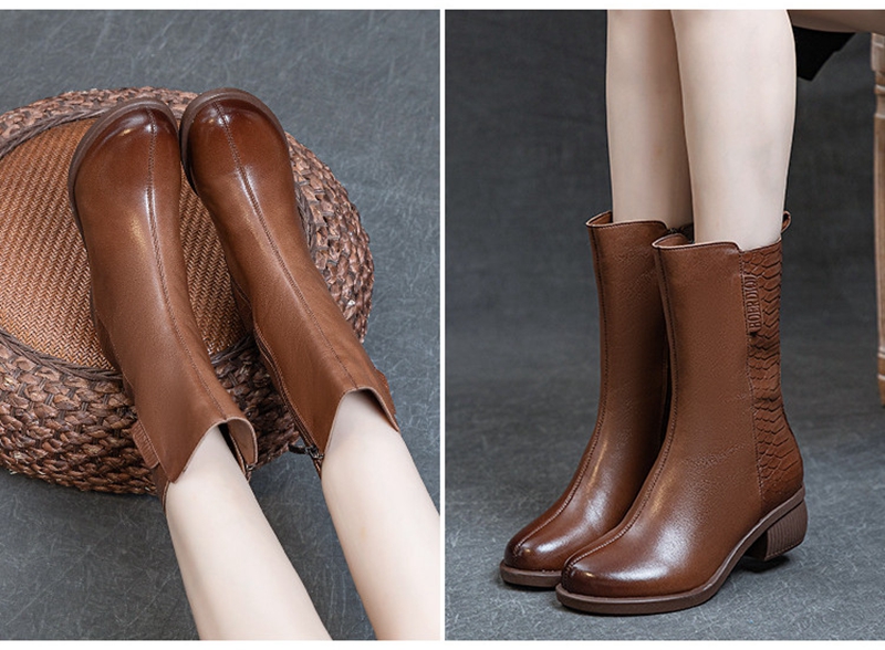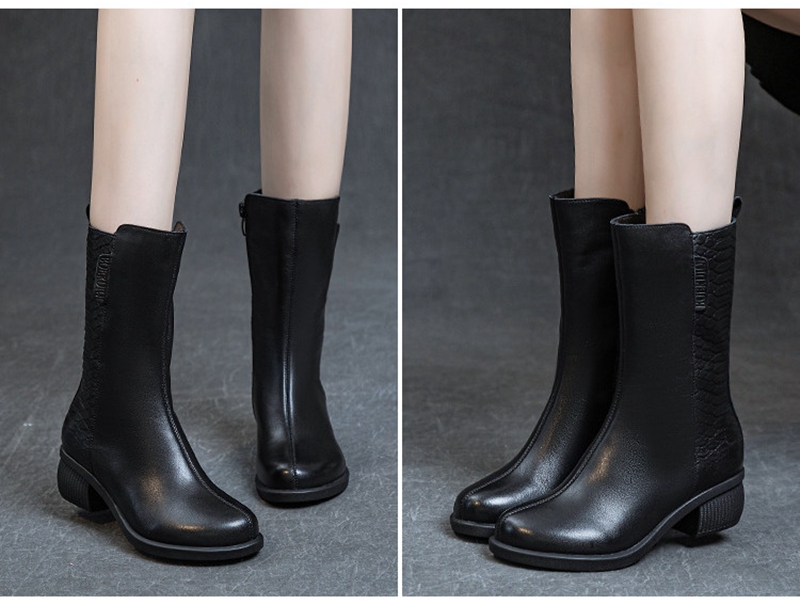 水洗头层软牛皮圆头中筒侧拉链粗跟中跟皮靴