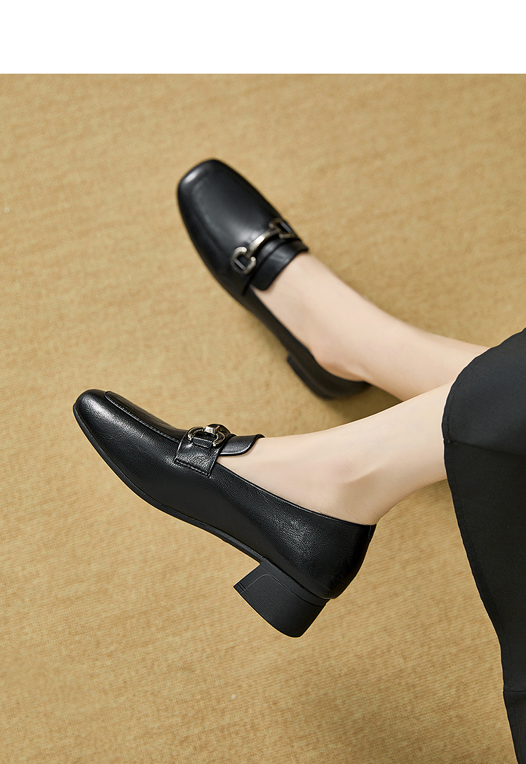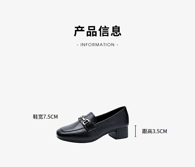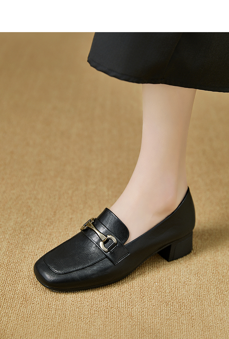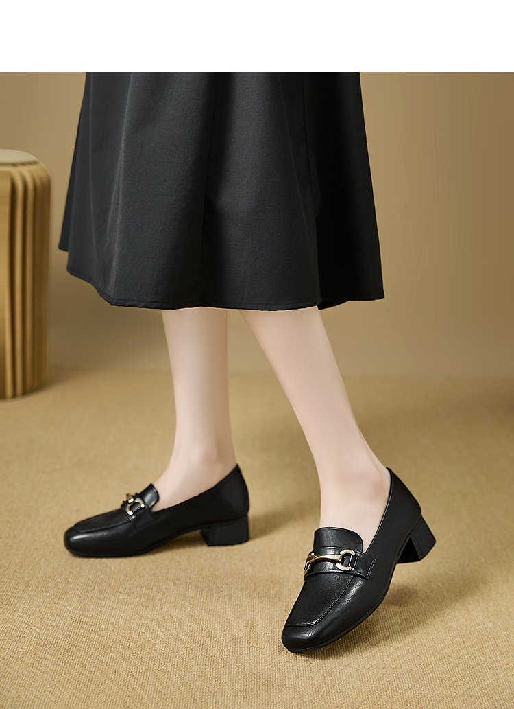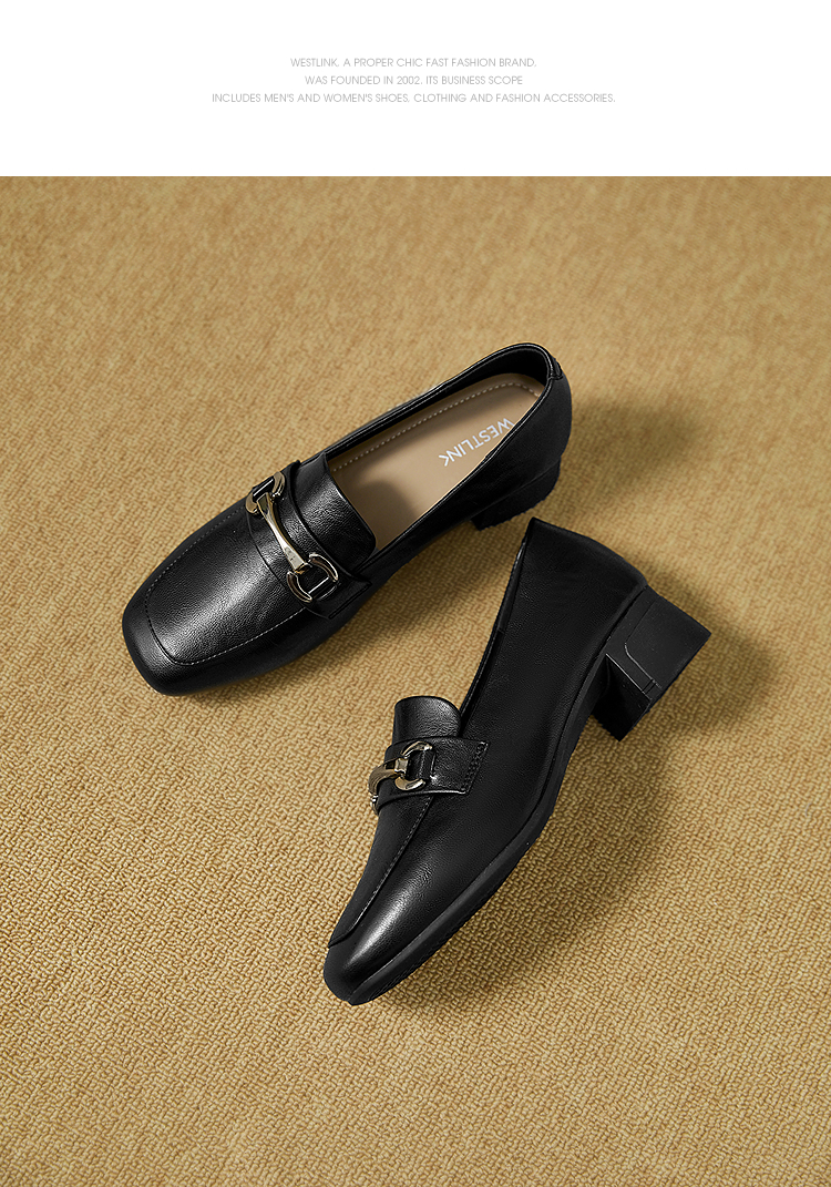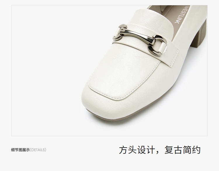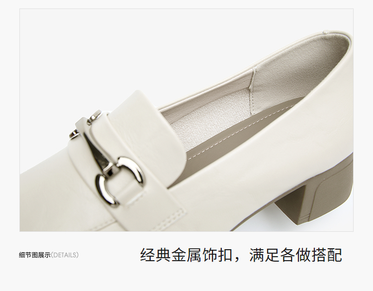 西遇粗跟乐福鞋女新款秋季复古金扣方头通勤单鞋中跟小皮鞋V1857106
