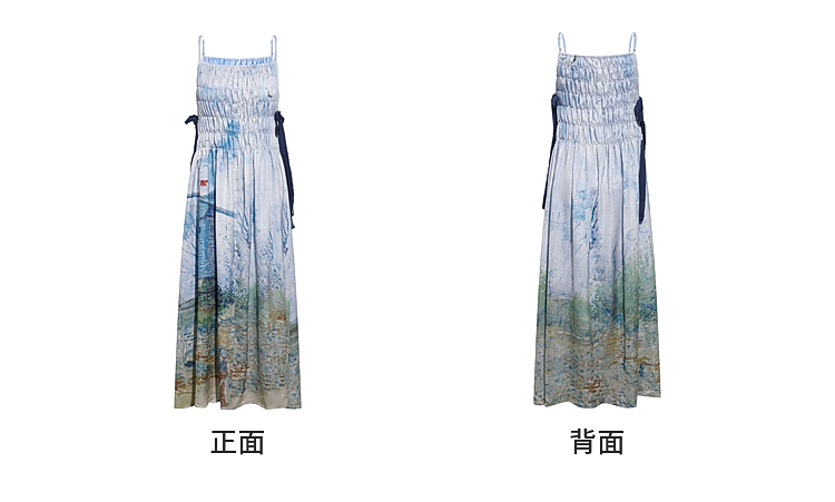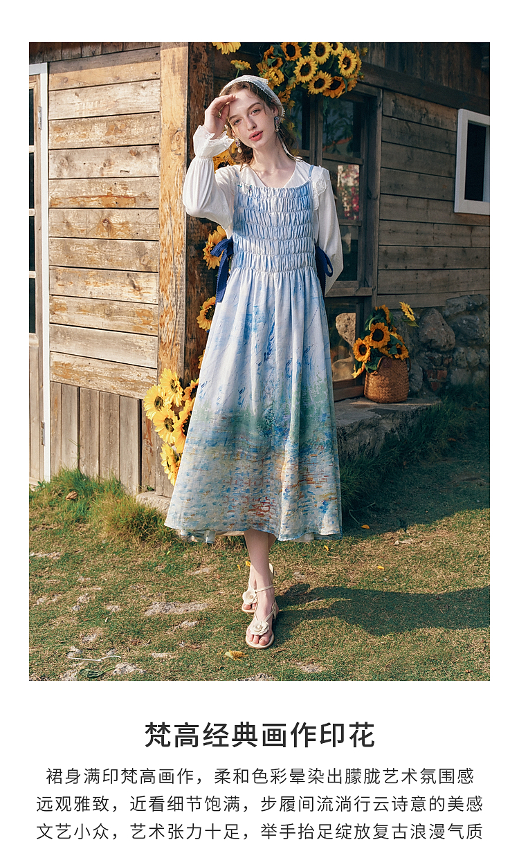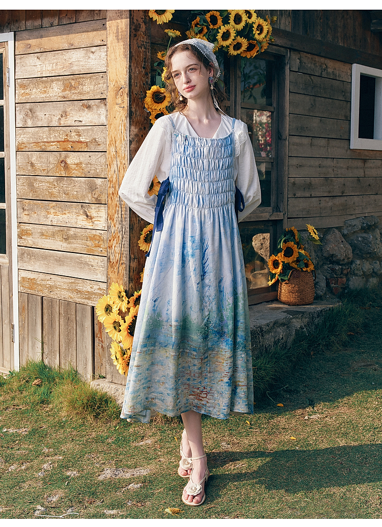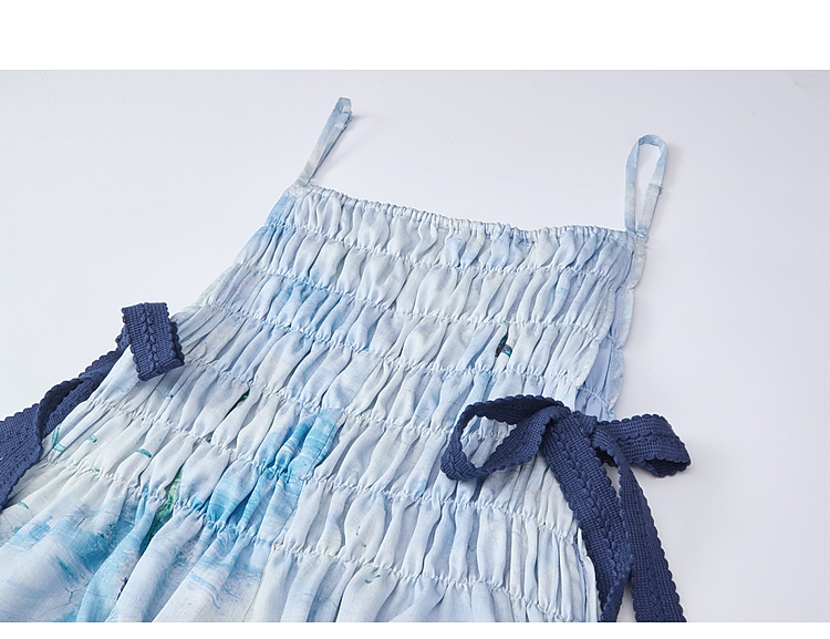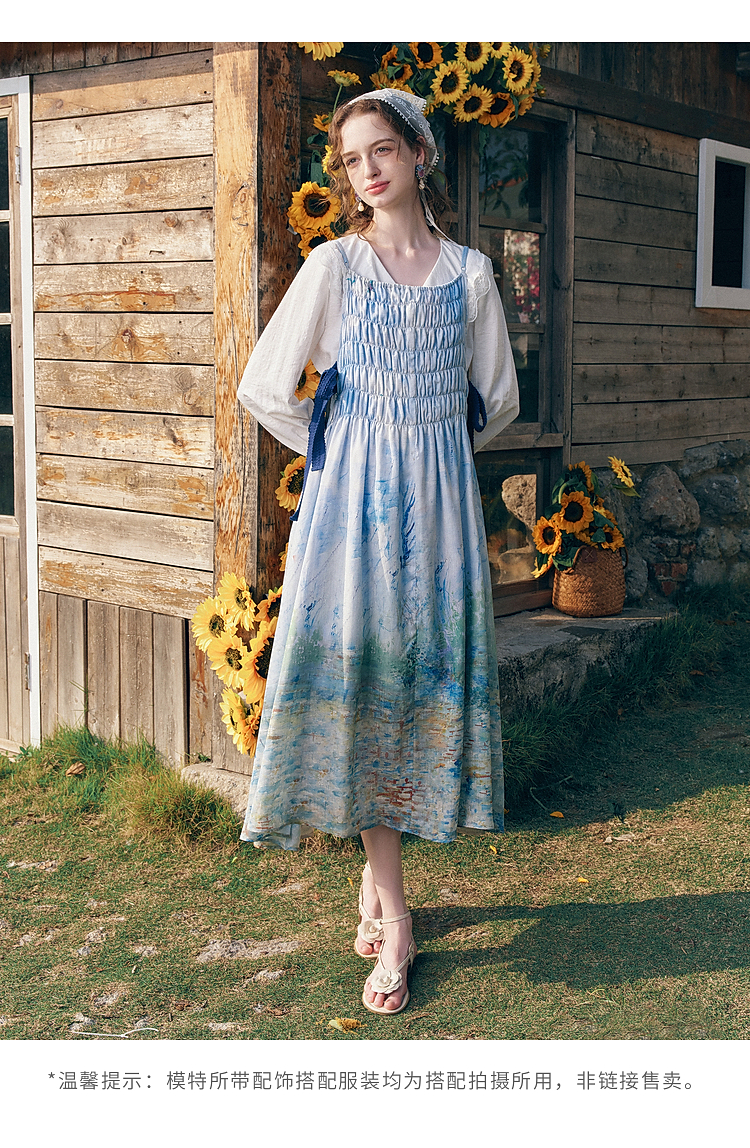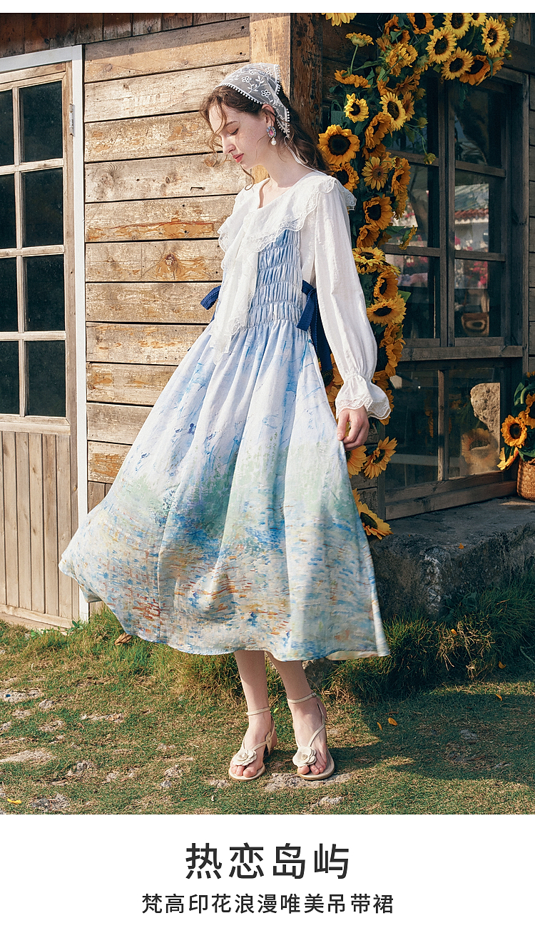 两三事梵高文艺热恋岛屿2026春新款侧边绑带褶皱印花吊带裙连衣裙