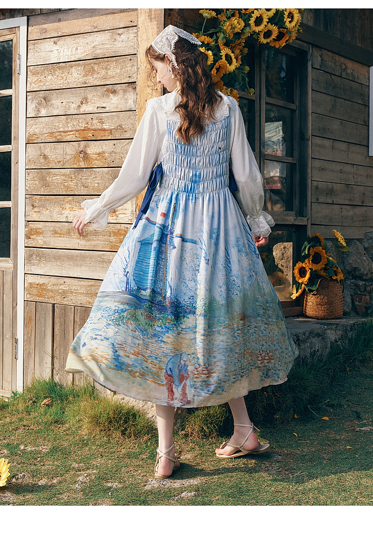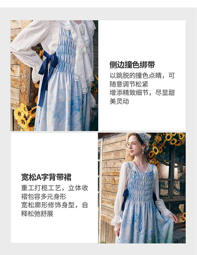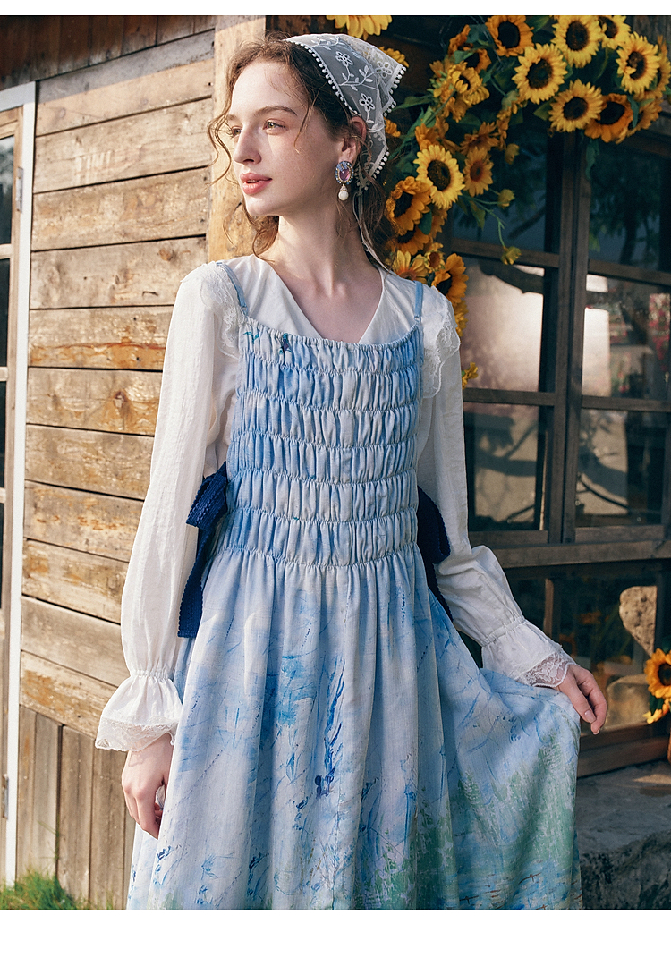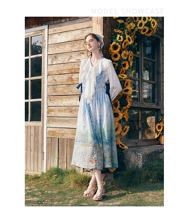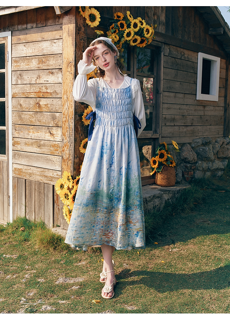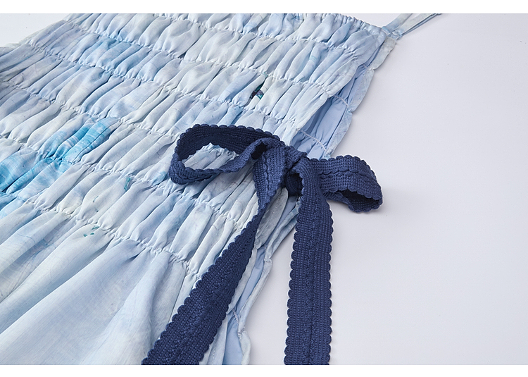两三事梵高文艺热恋岛屿2026春新款侧边绑带褶皱印花吊带裙连衣裙
