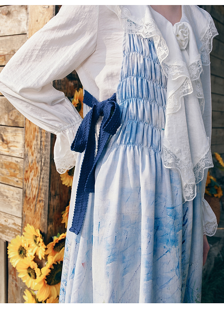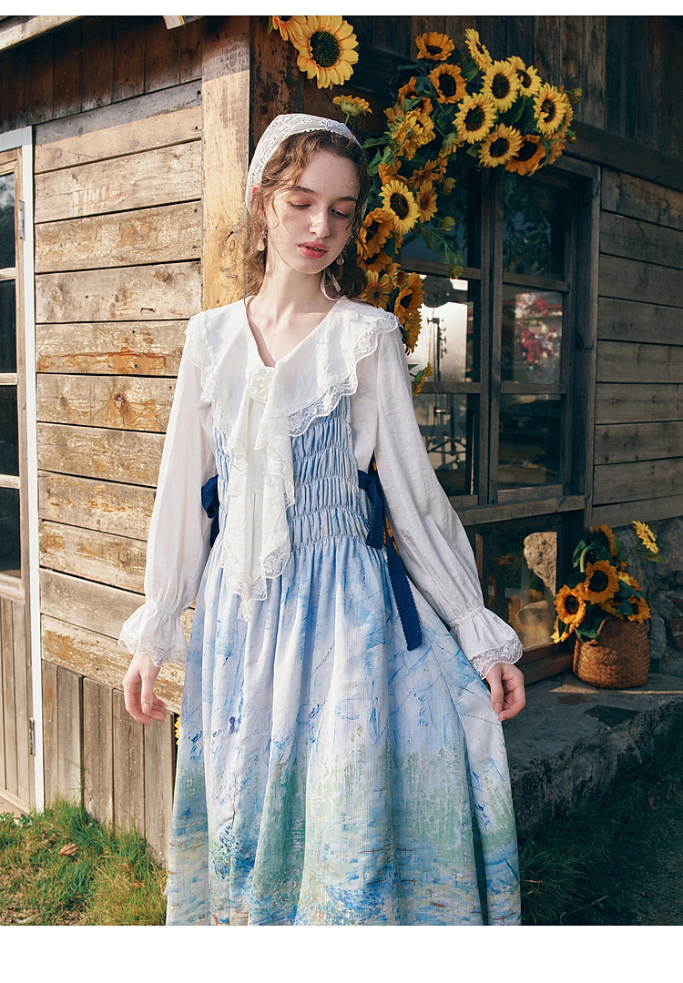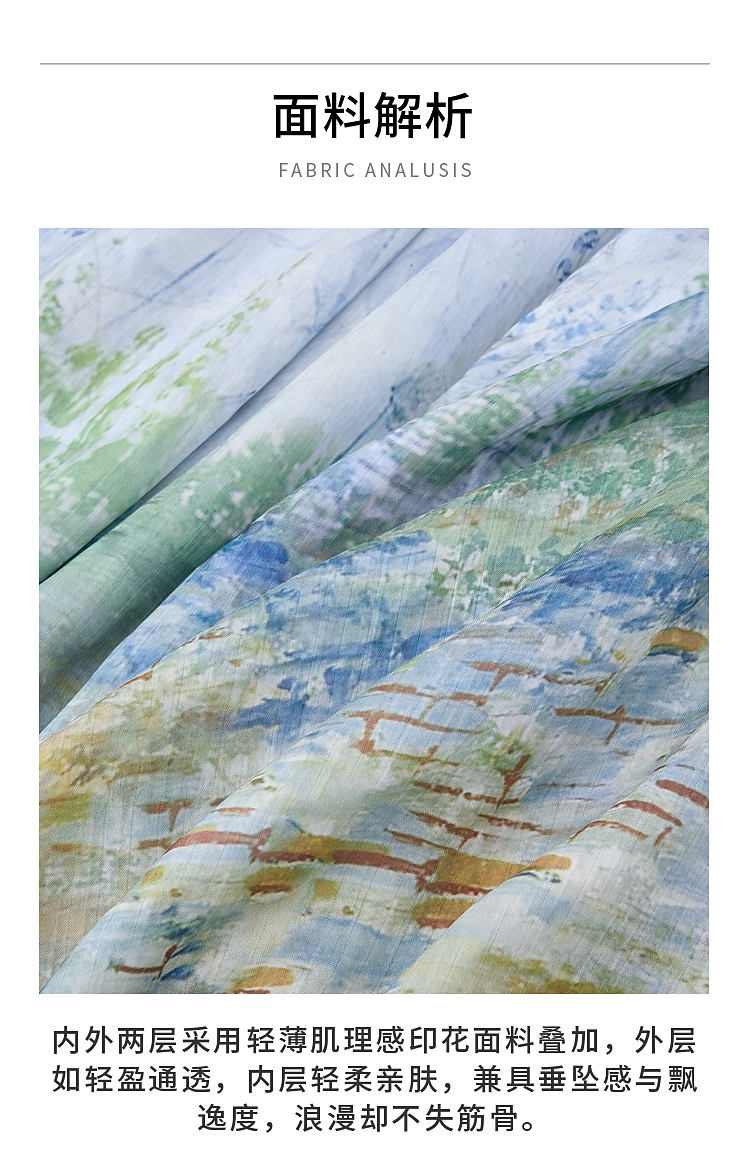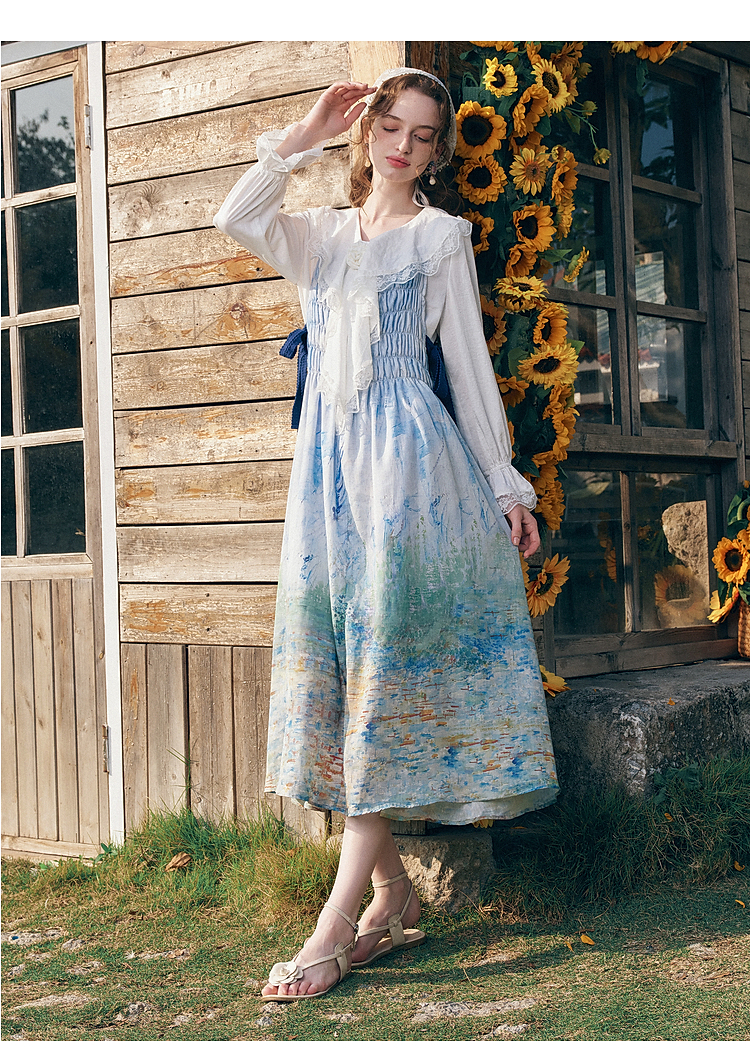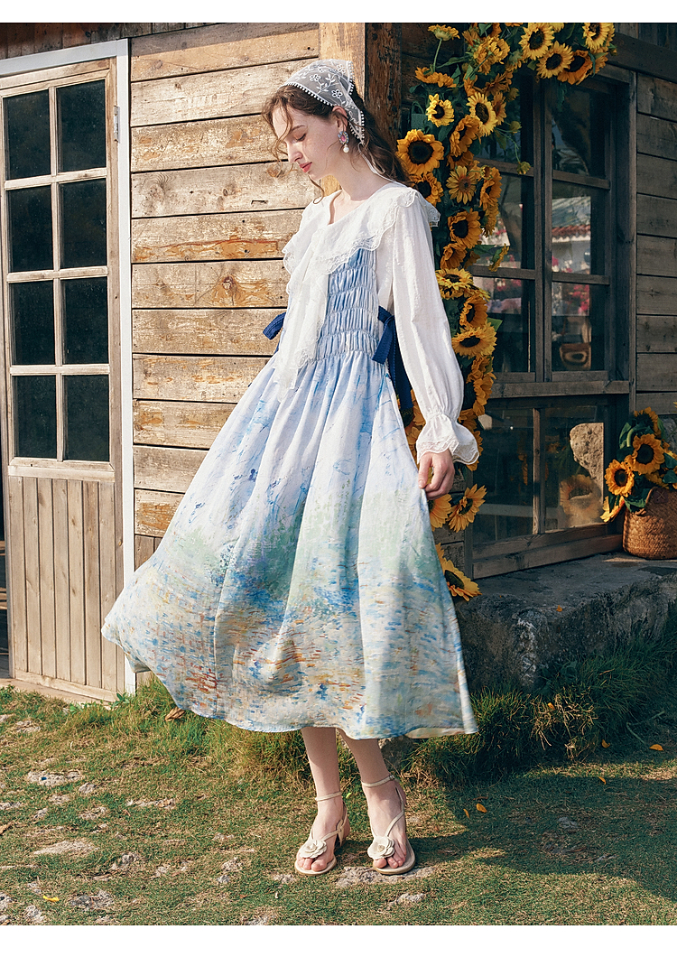 两三事梵高文艺热恋岛屿2026春新款侧边绑带褶皱印花吊带裙连衣裙