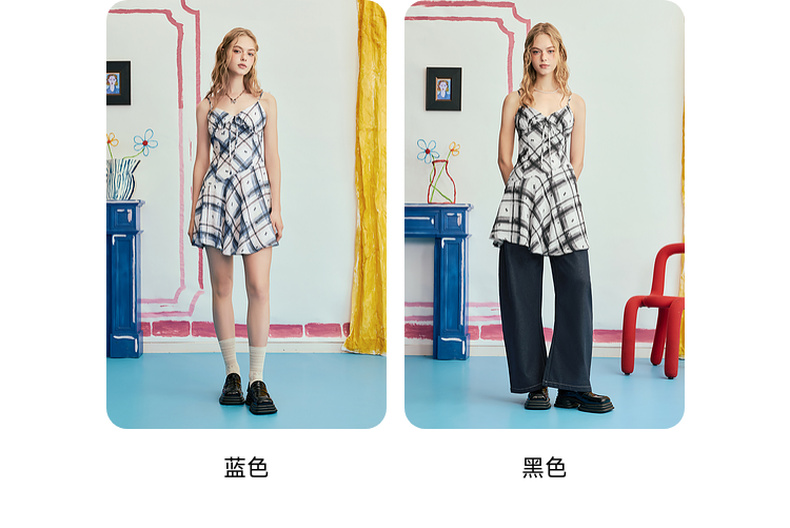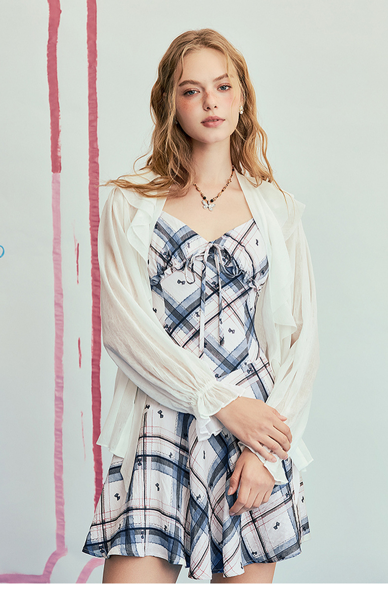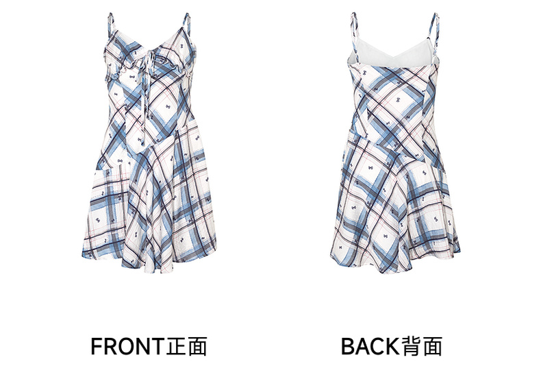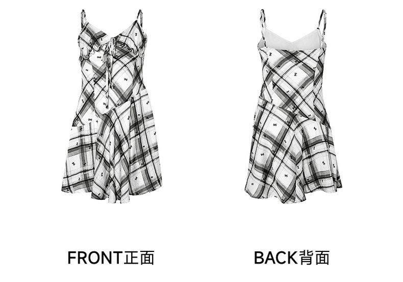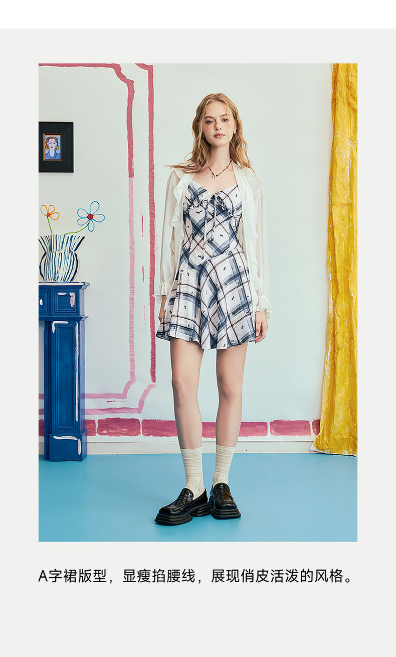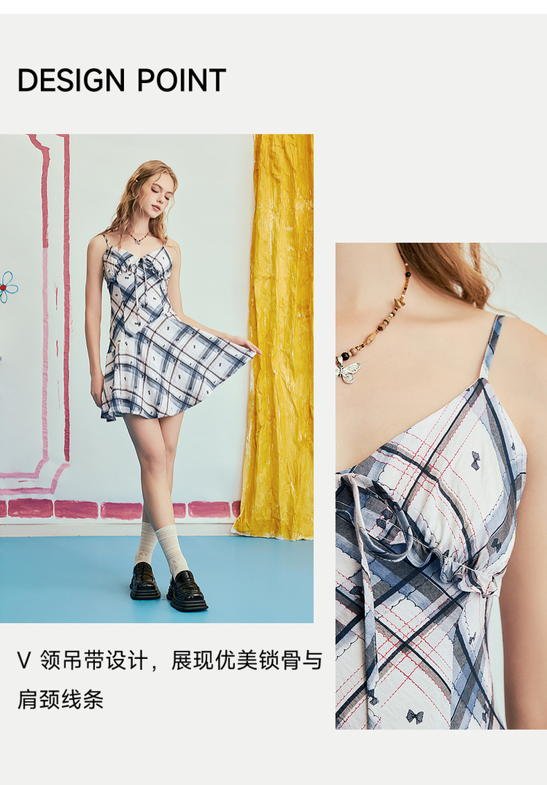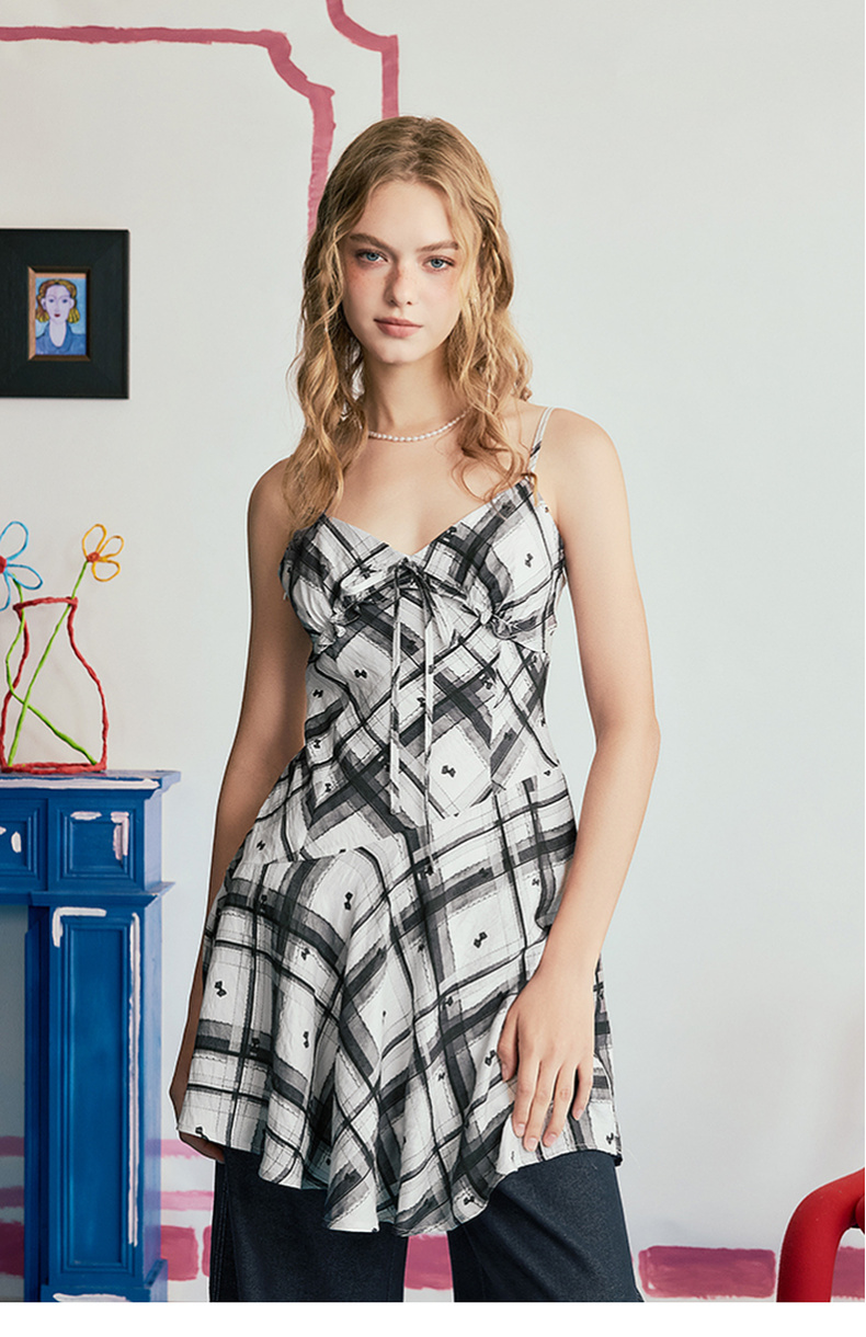 两三事 虚格甜叛 2025夏季新款复古格子绑带收腰吊带短裙连衣裙