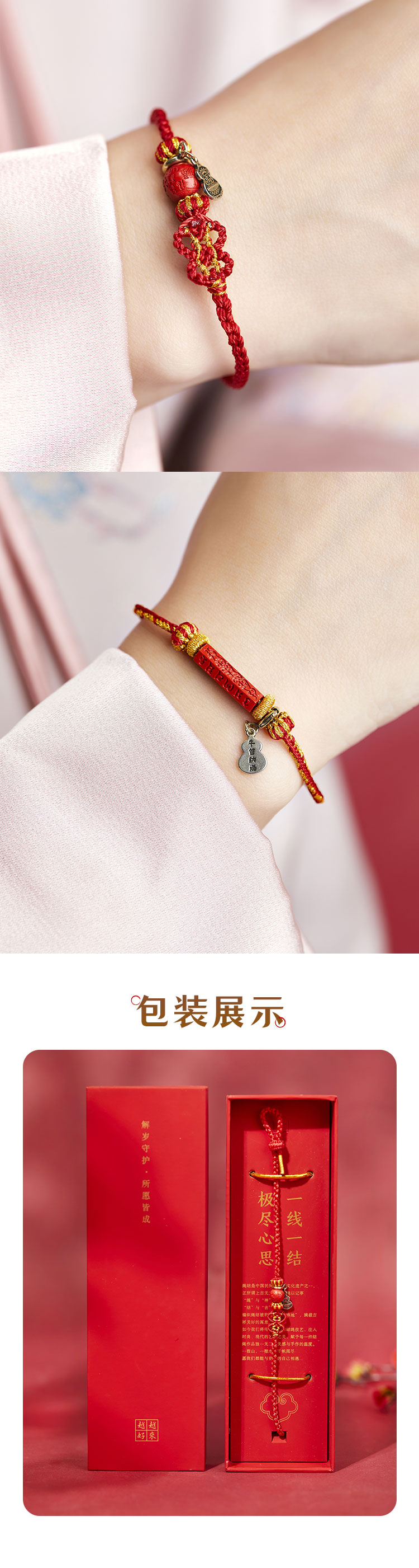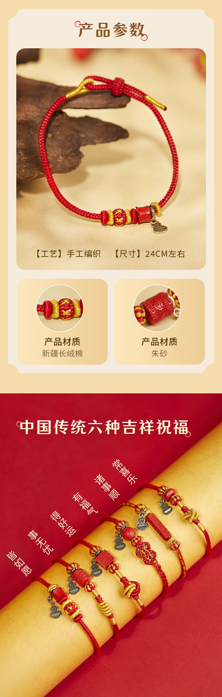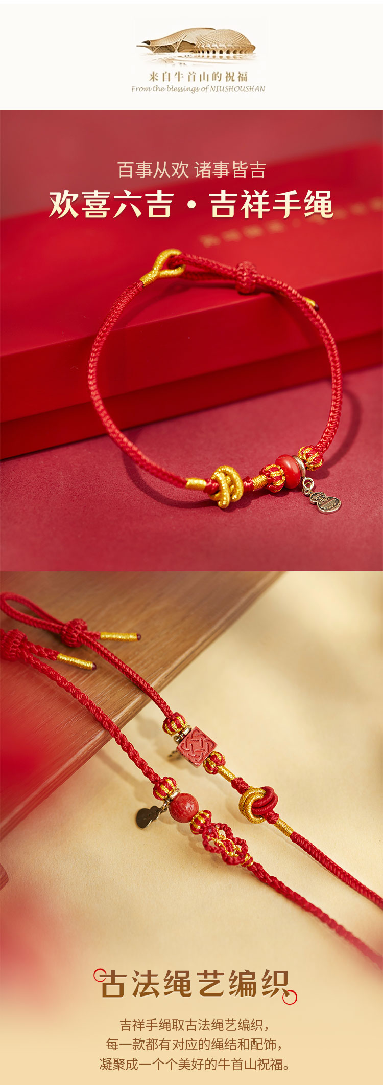 牛首山文创欢喜六吉吉祥手绳朱砂红绳手饰吉祥佩戴物国风节日礼物
