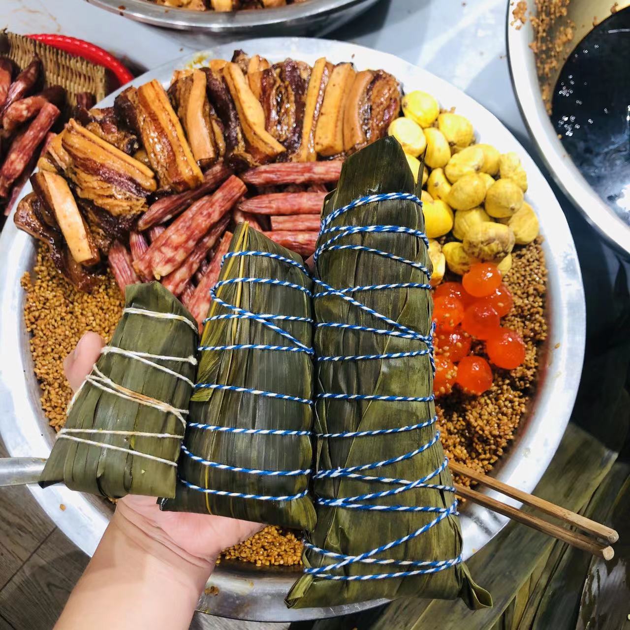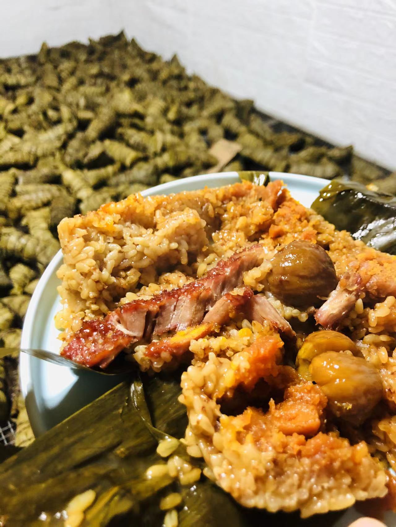 大块的鲜肉加上附带的蛋黄 板栗 排骨等 让一个个粽子内容丰富了起来!