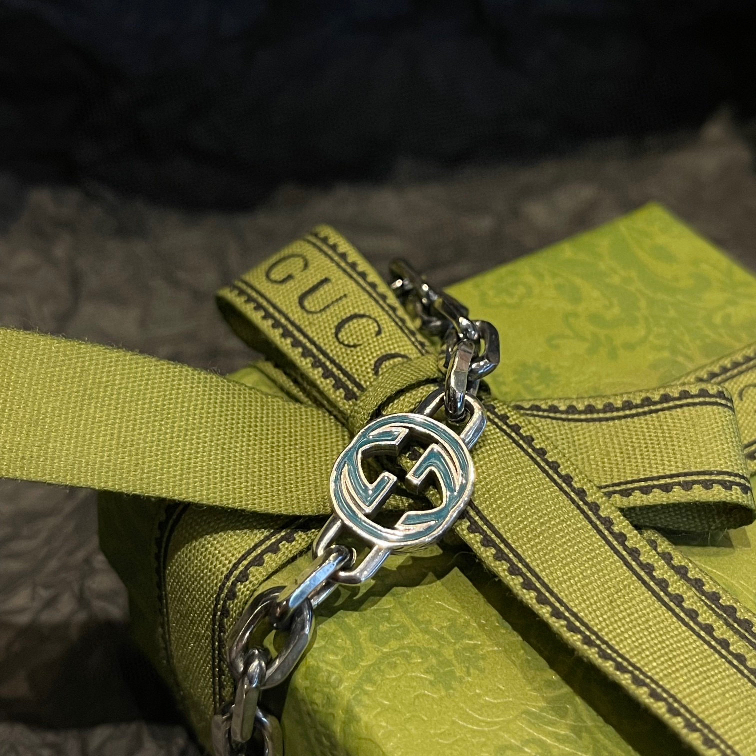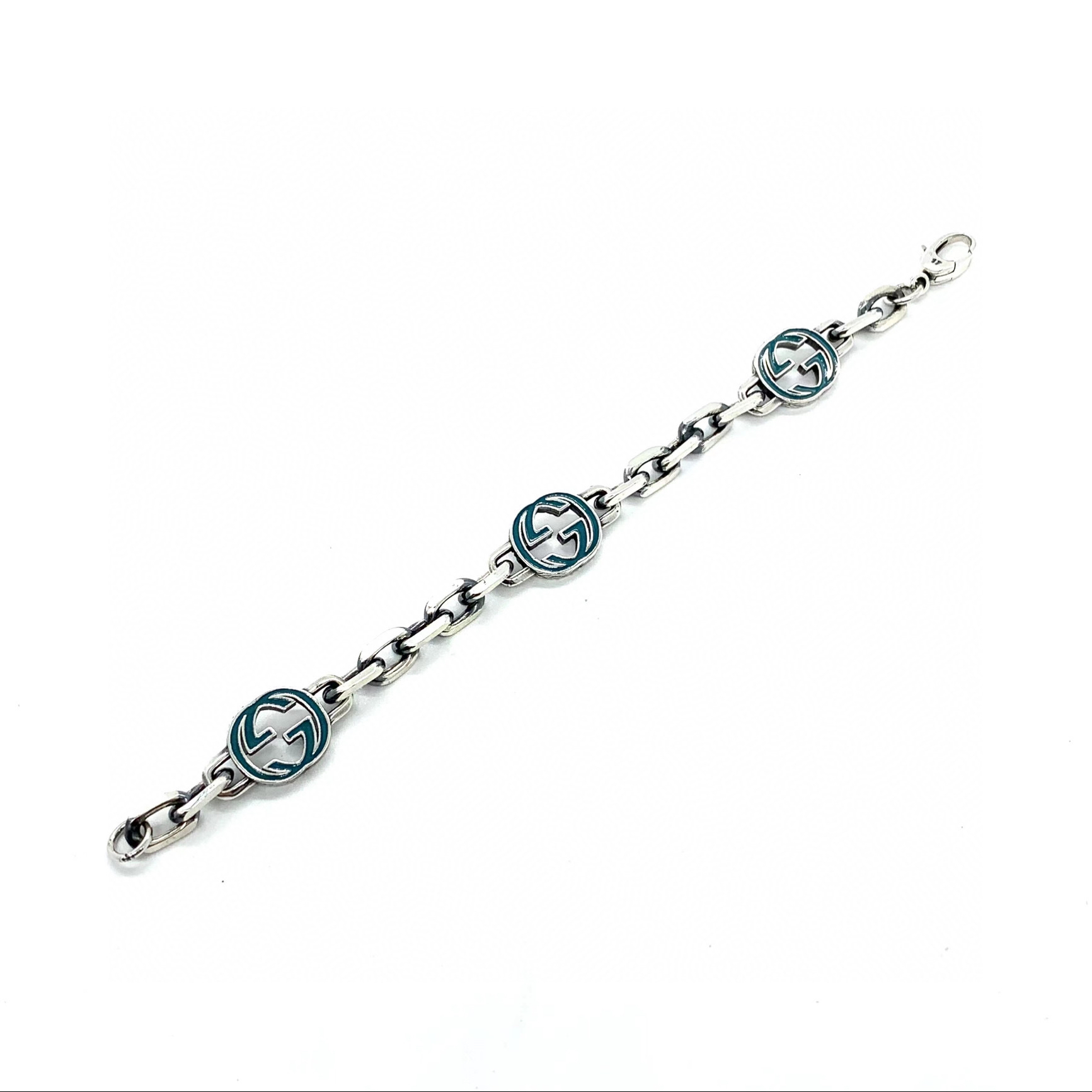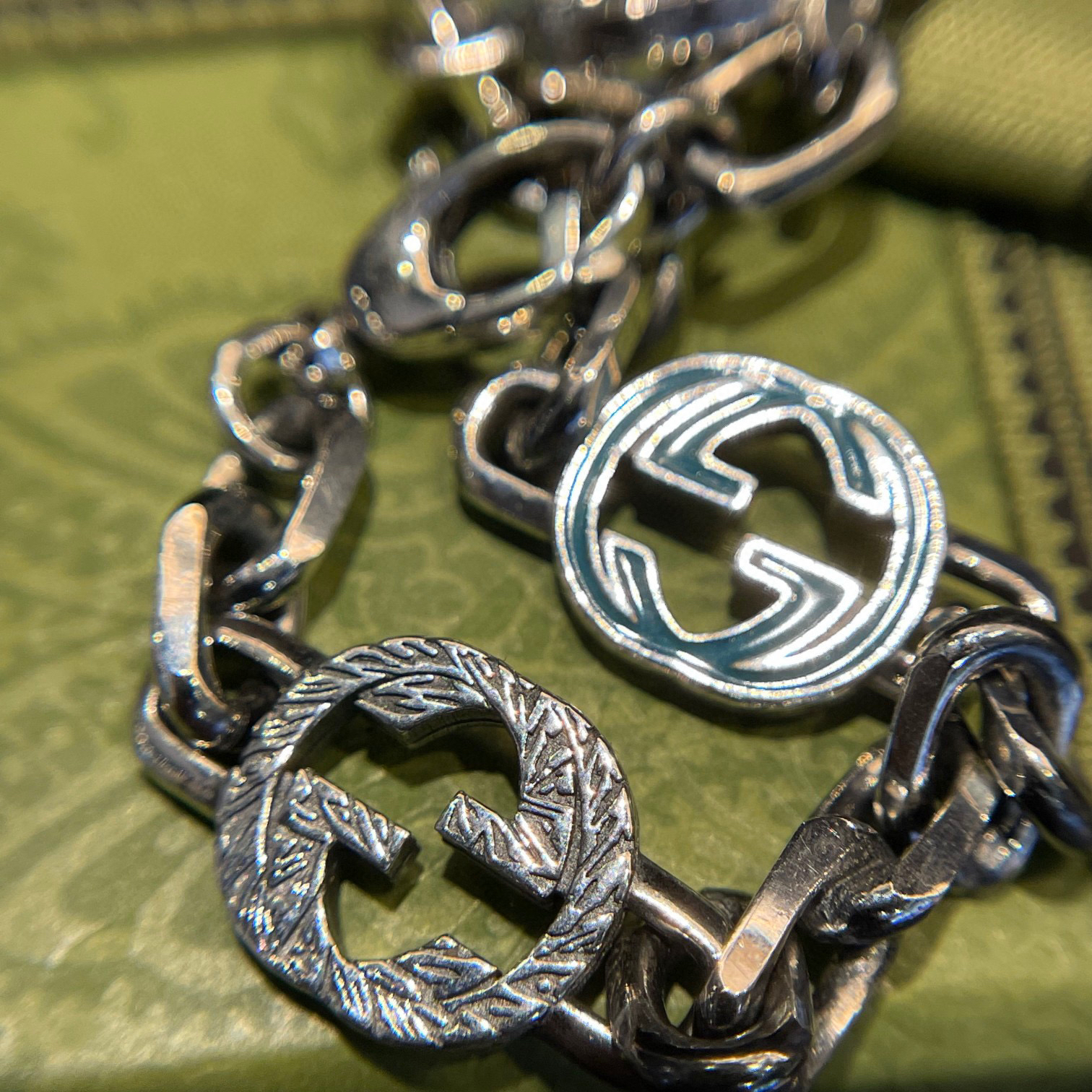 𝐆𝐮𝐜𝐜𝐢 互扣式双G手链 Epilogue这款手链采用纯银制作,饰以引人瞩目的宝石绿色珐琅和织纹滚边