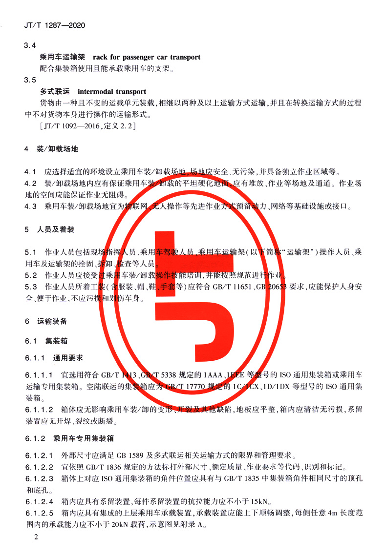 | 乘用车集装箱运输技术要求(JT/T 1287—2020) | ||