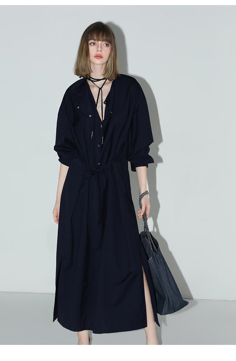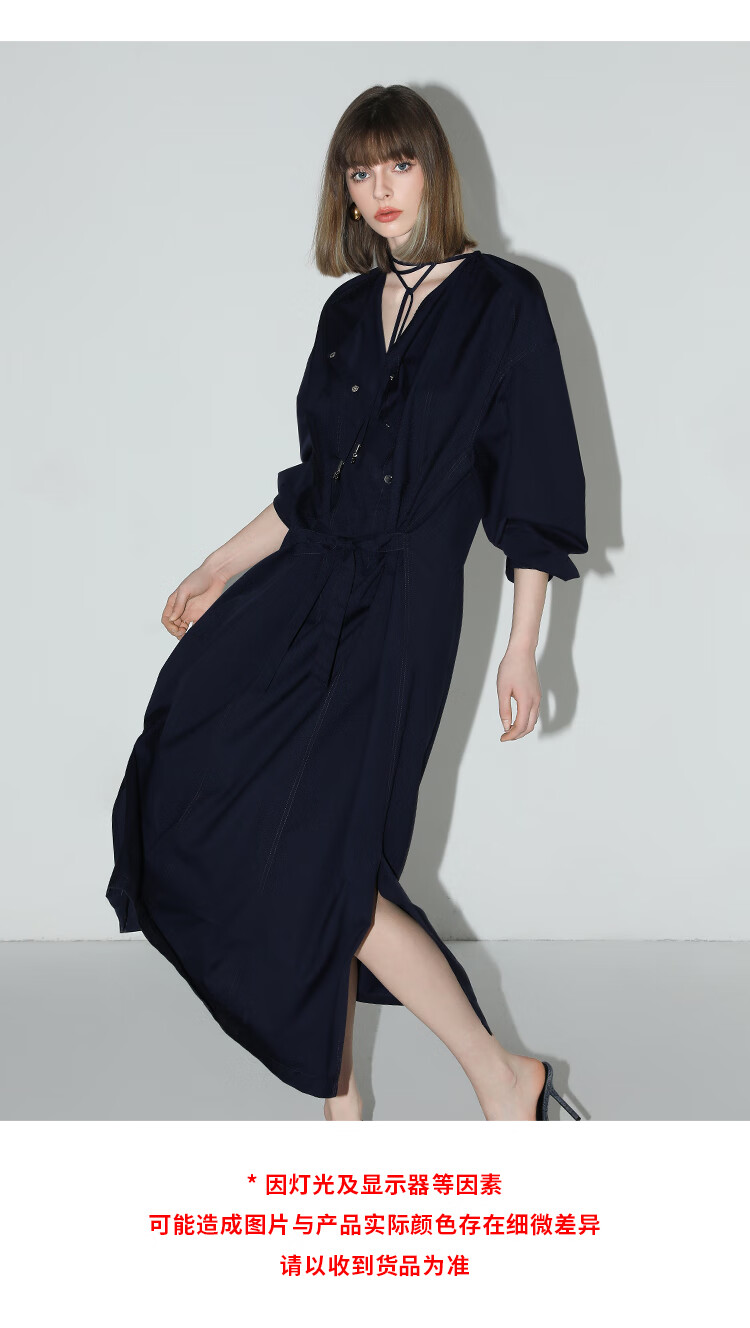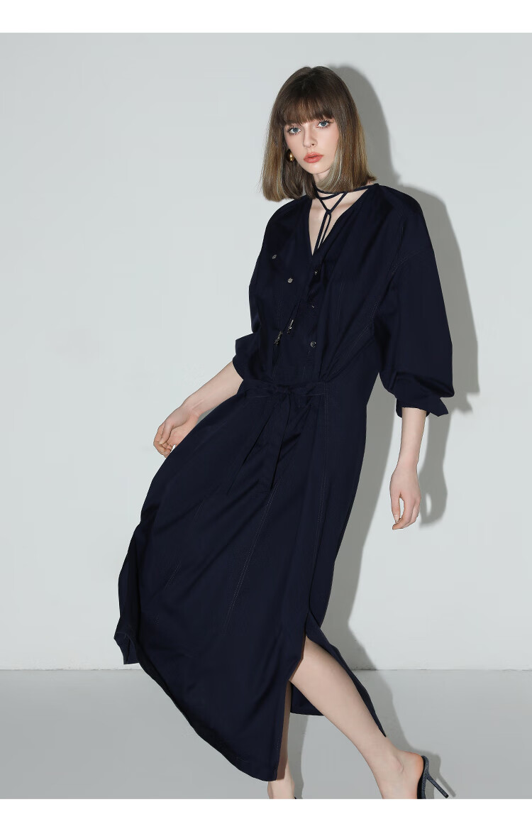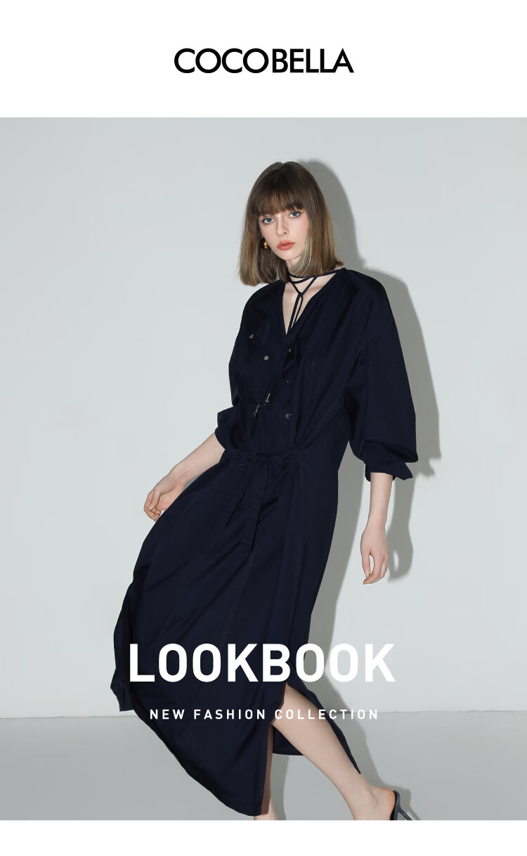 【秒杀】COCOBELLA重工绗线金属扣开叉连衣裙女通勤飘带衬衫裙FR3039