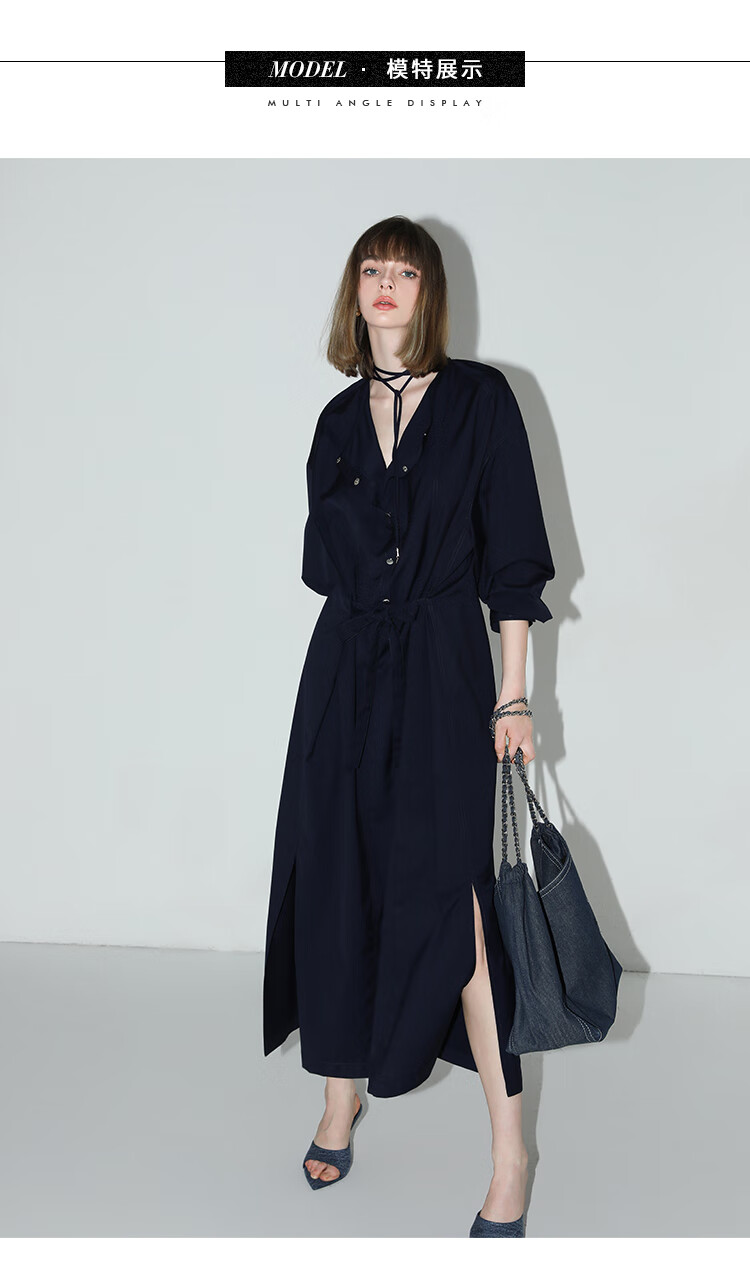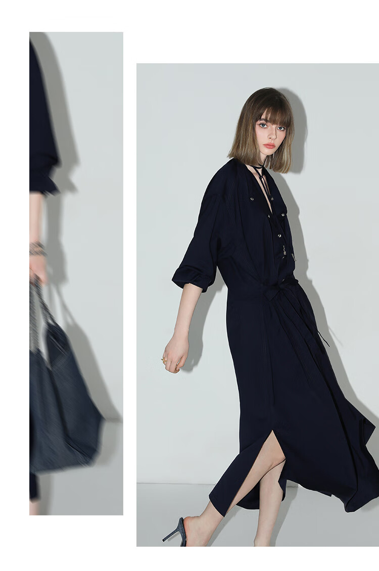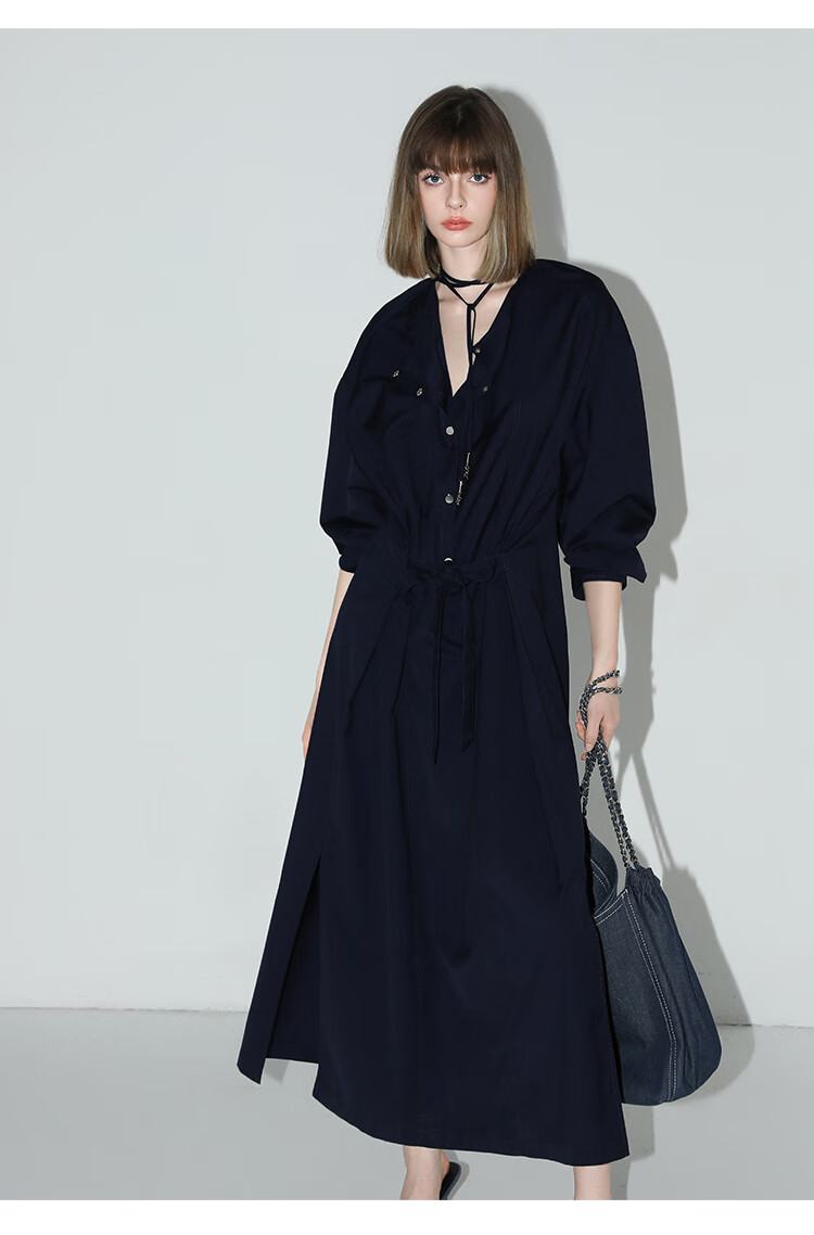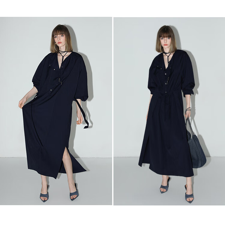【秒杀】COCOBELLA重工绗线金属扣开叉连衣裙女通勤飘带衬衫裙FR3039