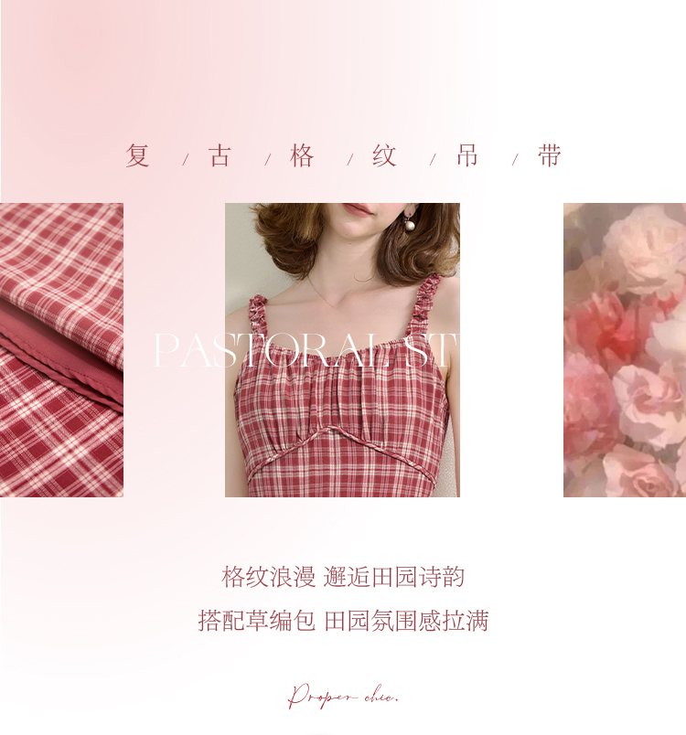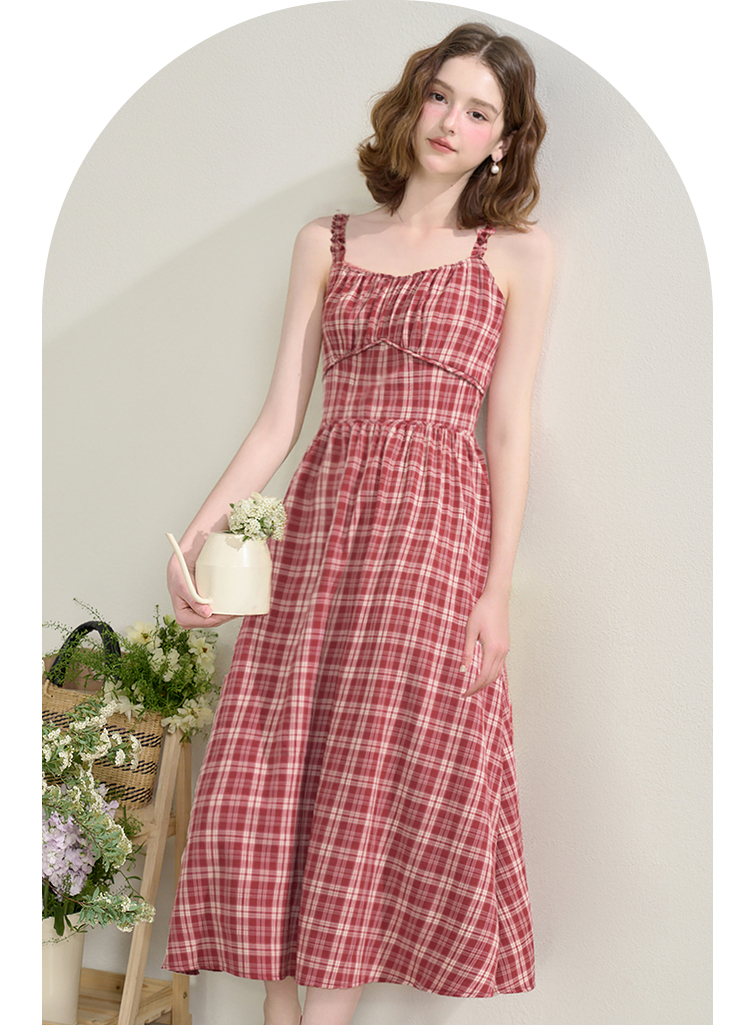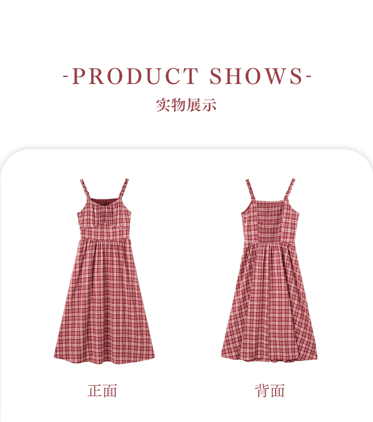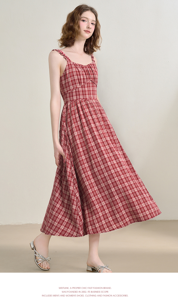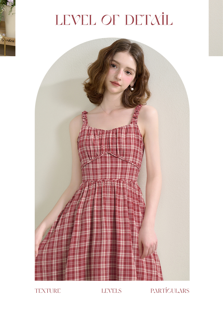 法式气质复古红色格纹木耳边吊带裙女夏季收腰连衣裙V1050583