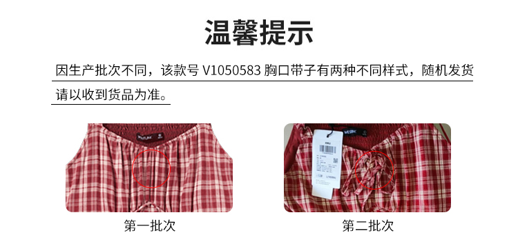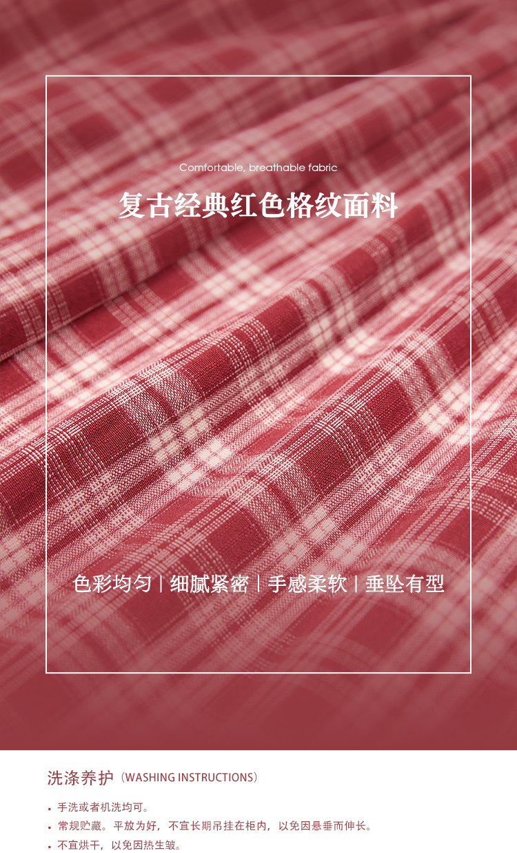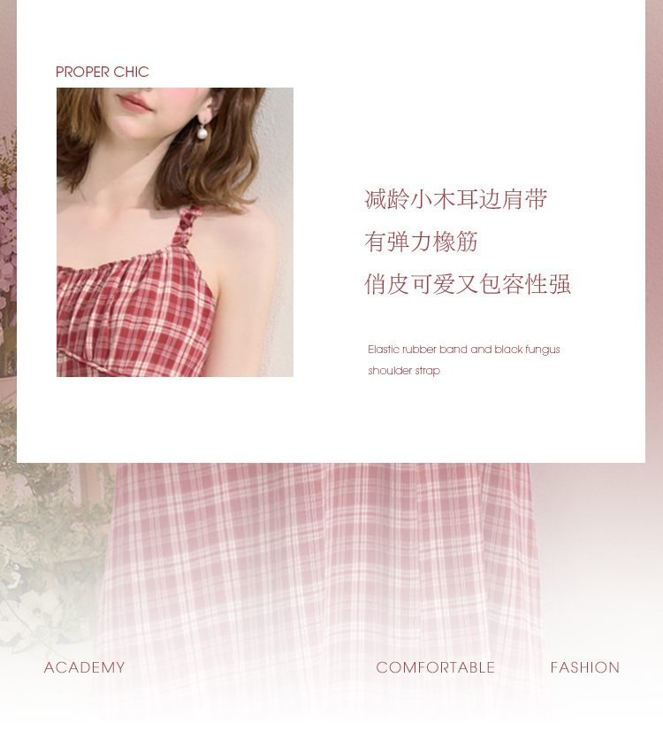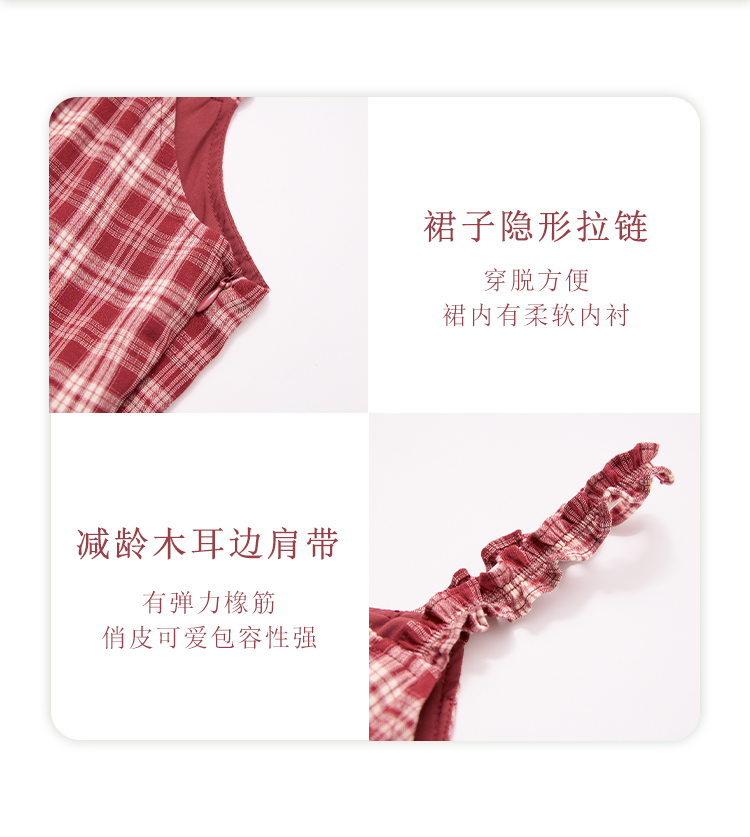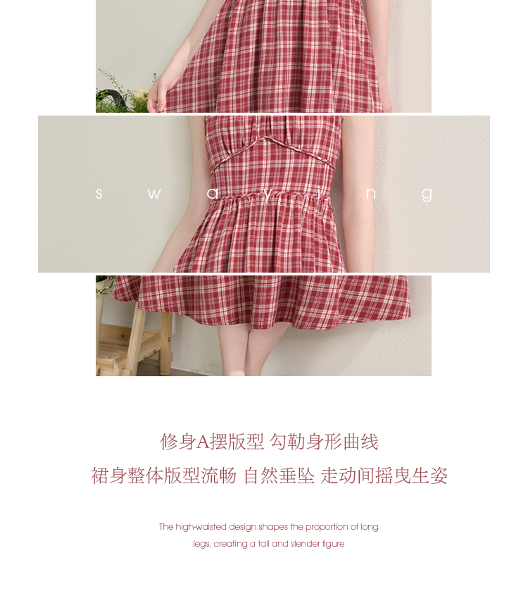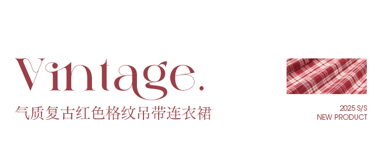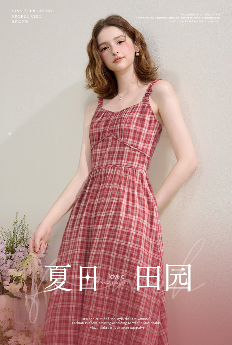 法式气质复古红色格纹木耳边吊带裙女夏季收腰连衣裙V1050583