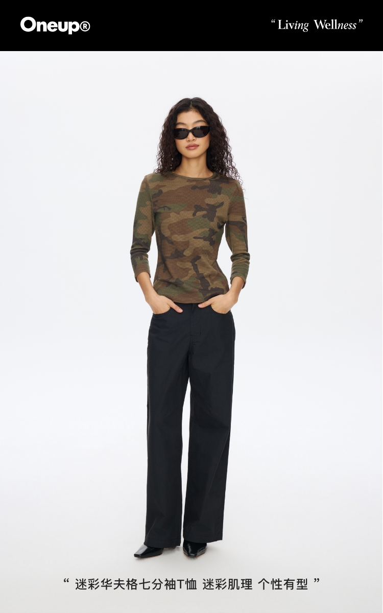 Oneup迷彩华夫格七分袖T恤