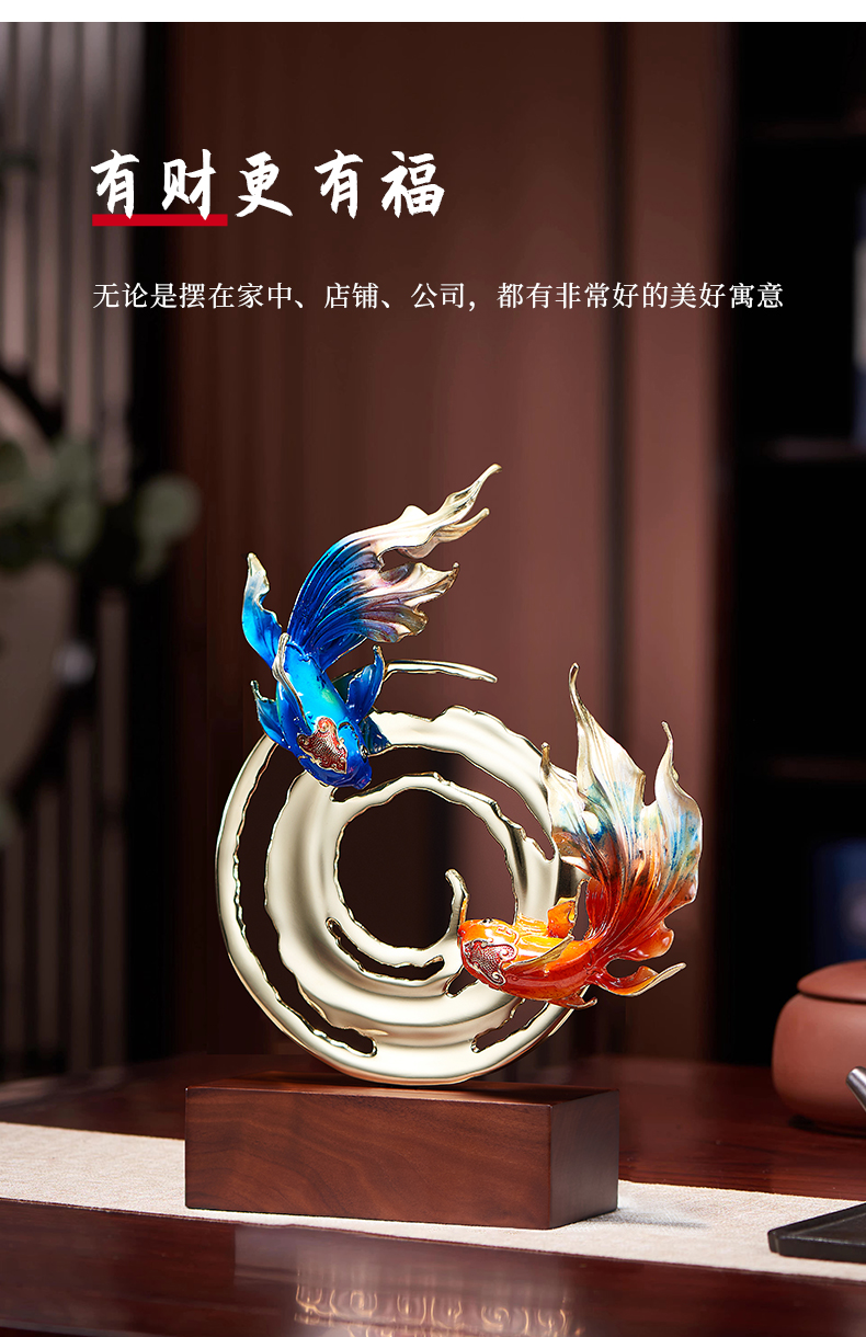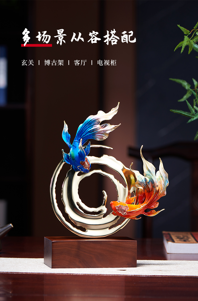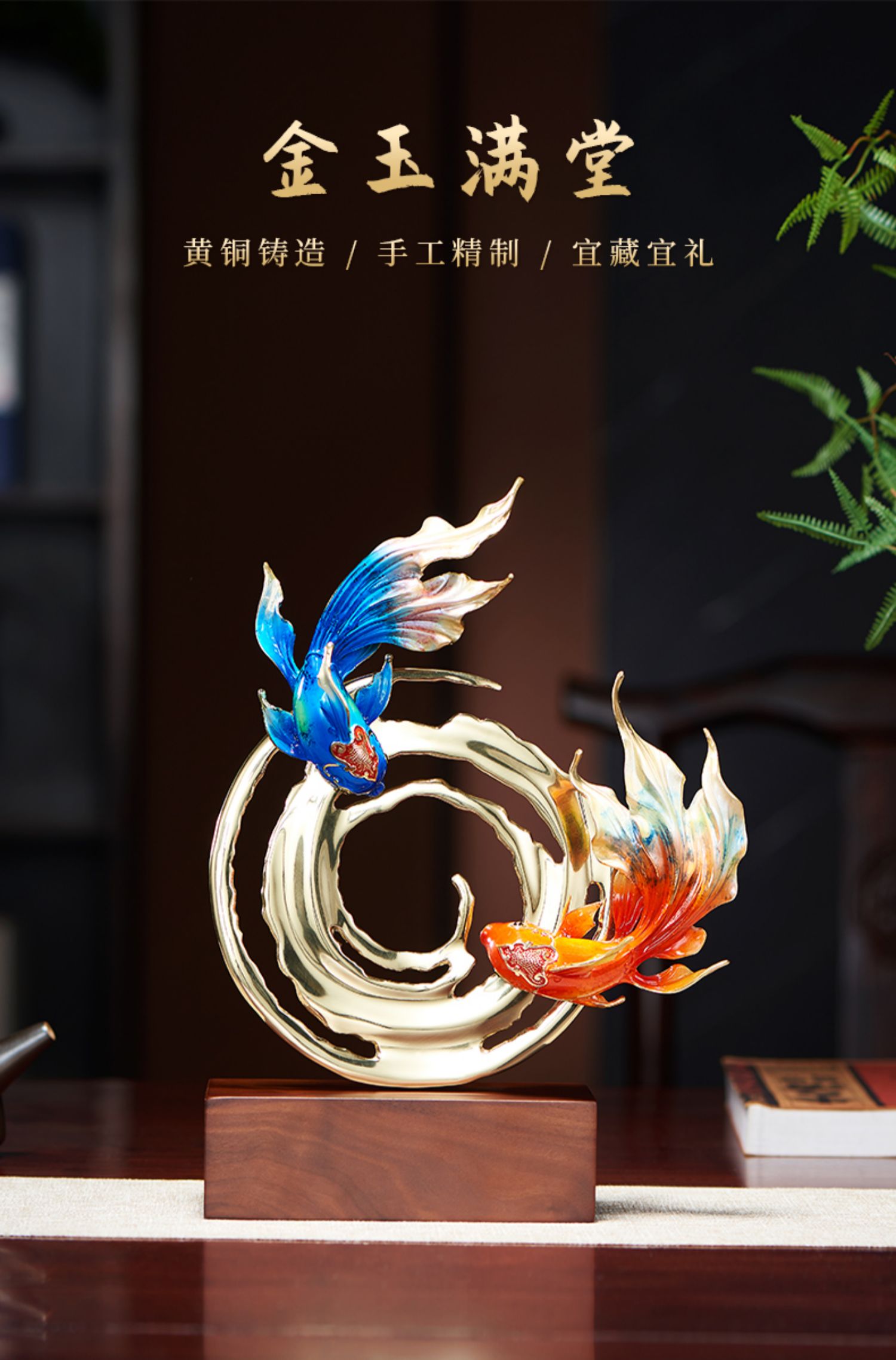 年年有余铜金鱼书柜展示柜电视柜艺术工艺品装饰摆件纯铜招财双鱼戏水摆件 220*80*310客厅书房办公室玄关新中式摆件新婚贺礼乔迁贺礼