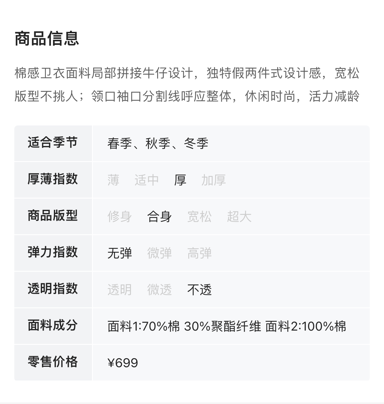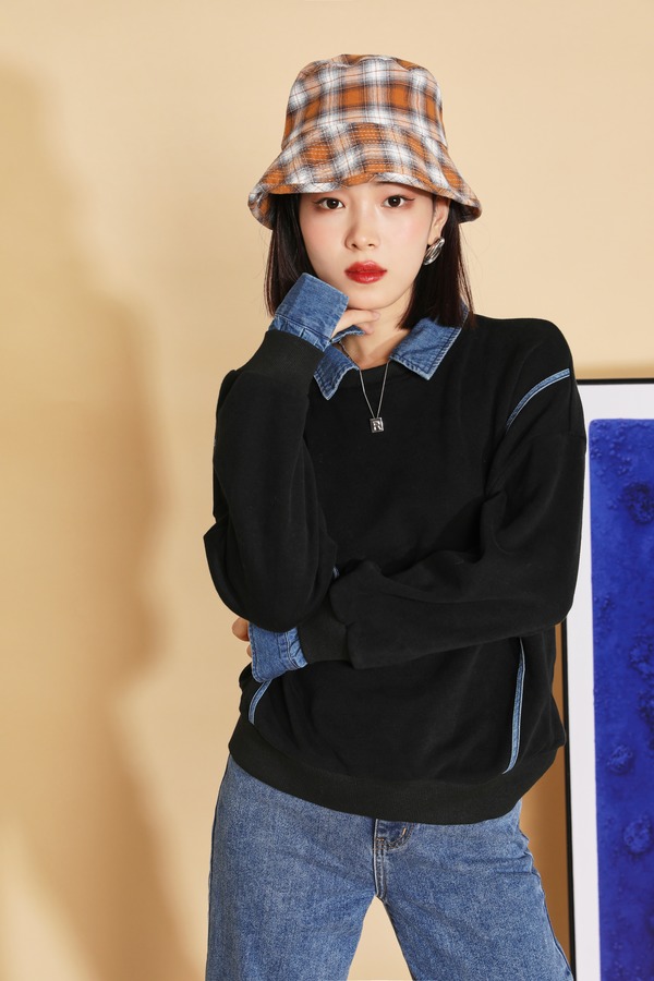WHO KNOWS 牛仔拼接领假两件式卫衣 14539