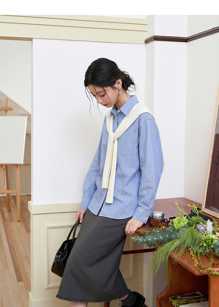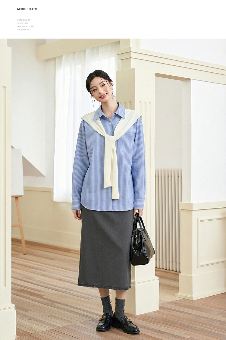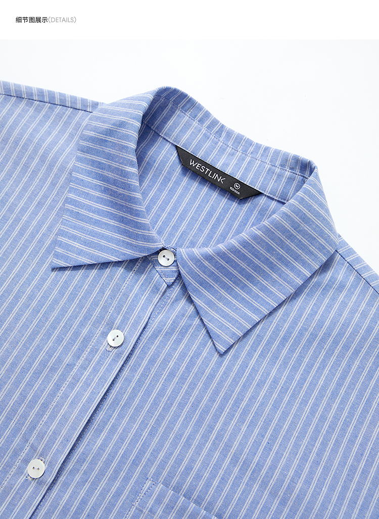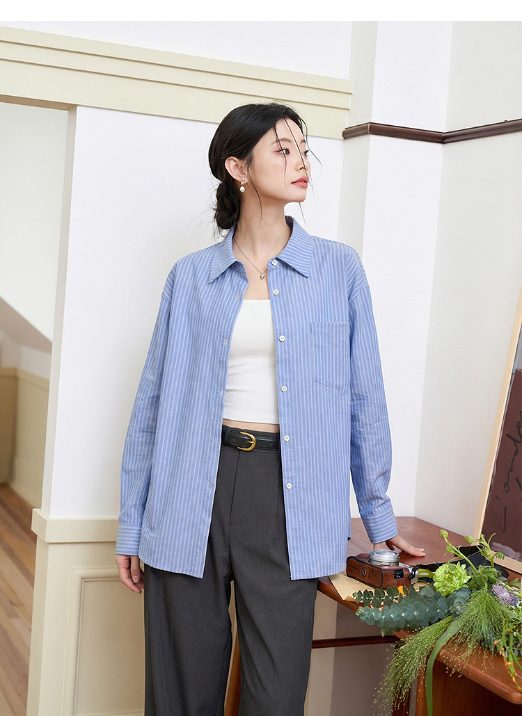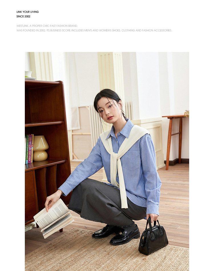 【限时秒杀】西遇慵懒蓝色条纹衬衫女2026年春季新款通勤风宽松休闲长袖衬衣10260018