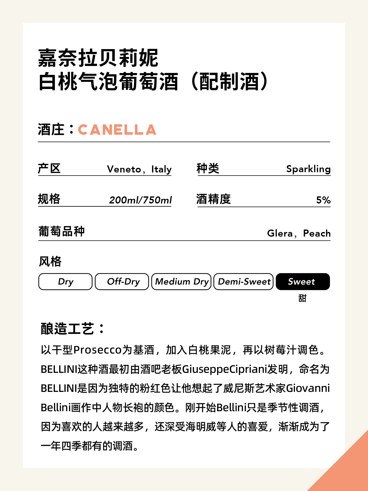 嘉奈拉贝利尼白桃气泡葡萄酒(配制酒) 200ml