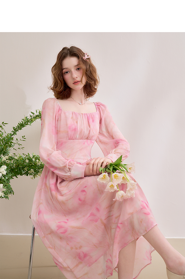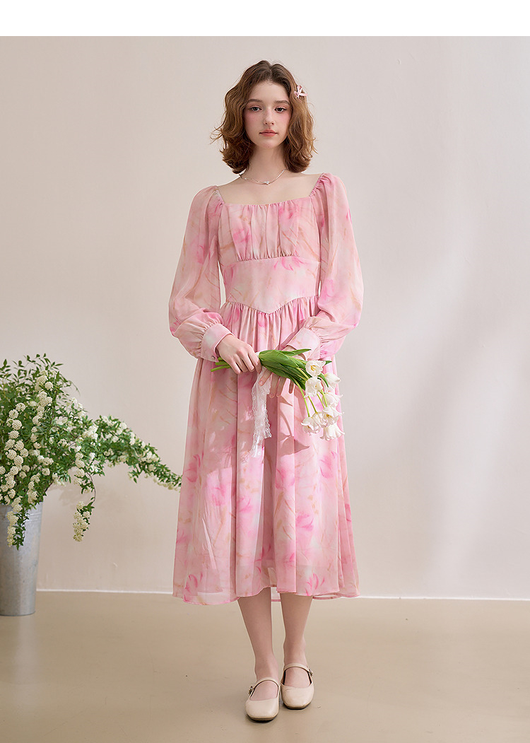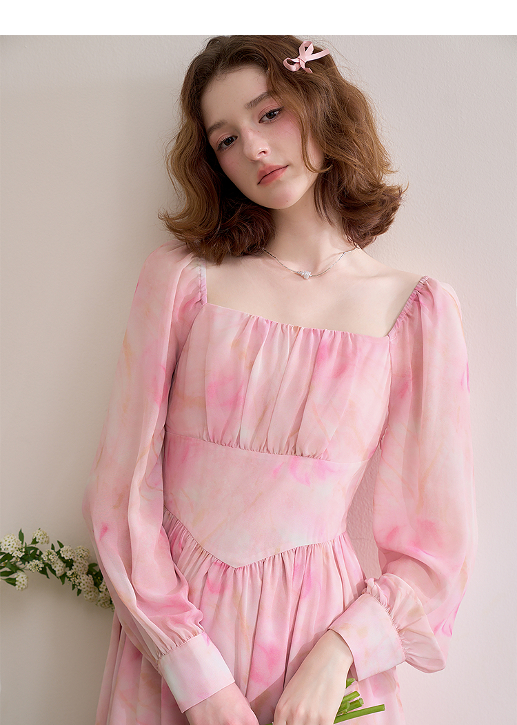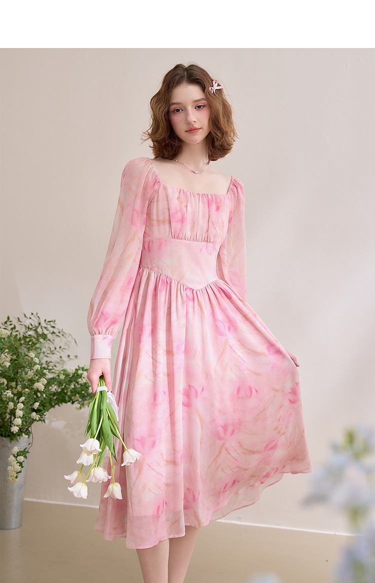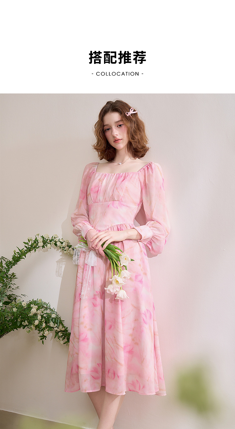 【雪纺印花】法式浪漫方领晕染长袖连衣裙女收腰长裙V0650253