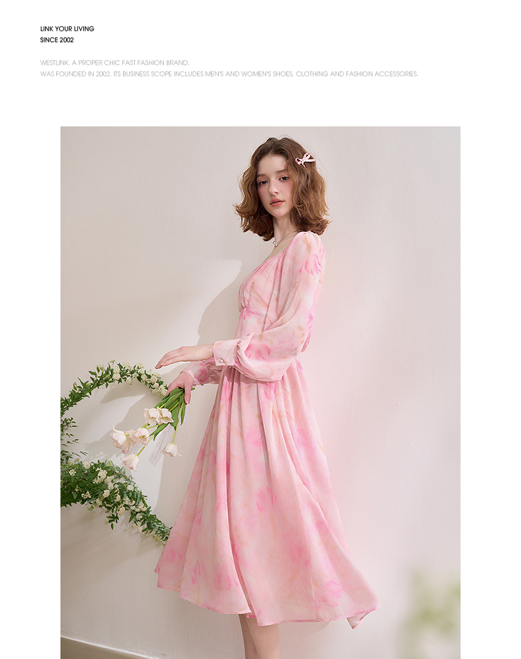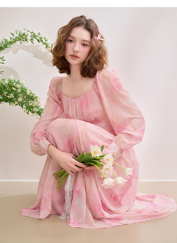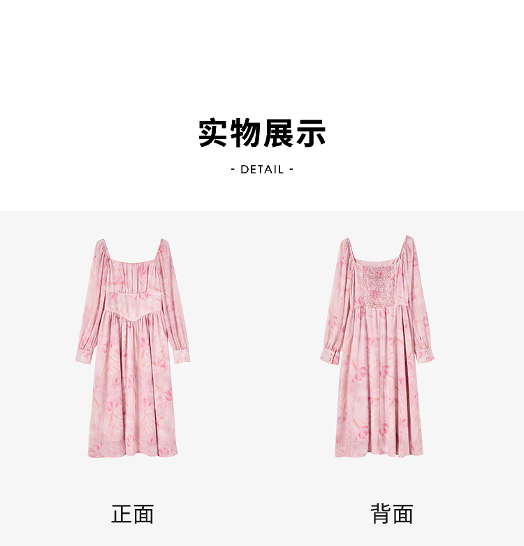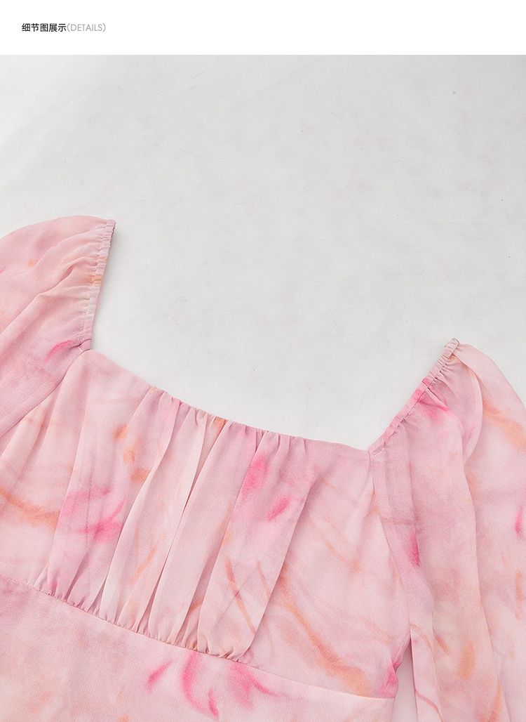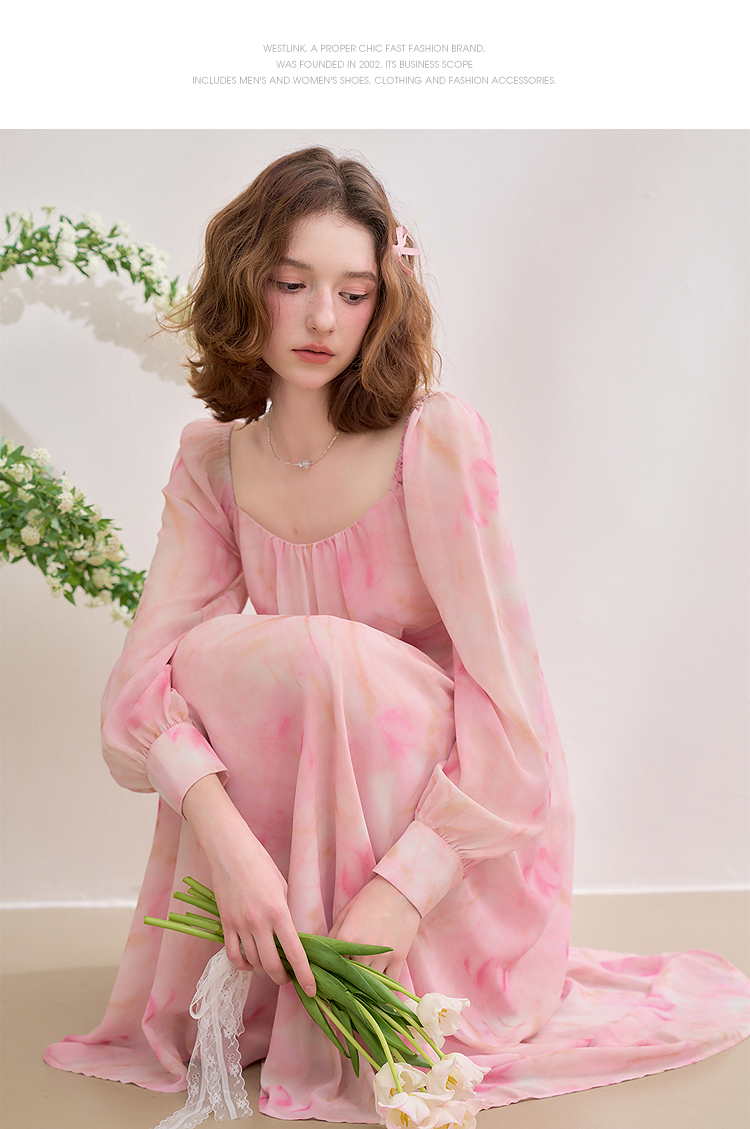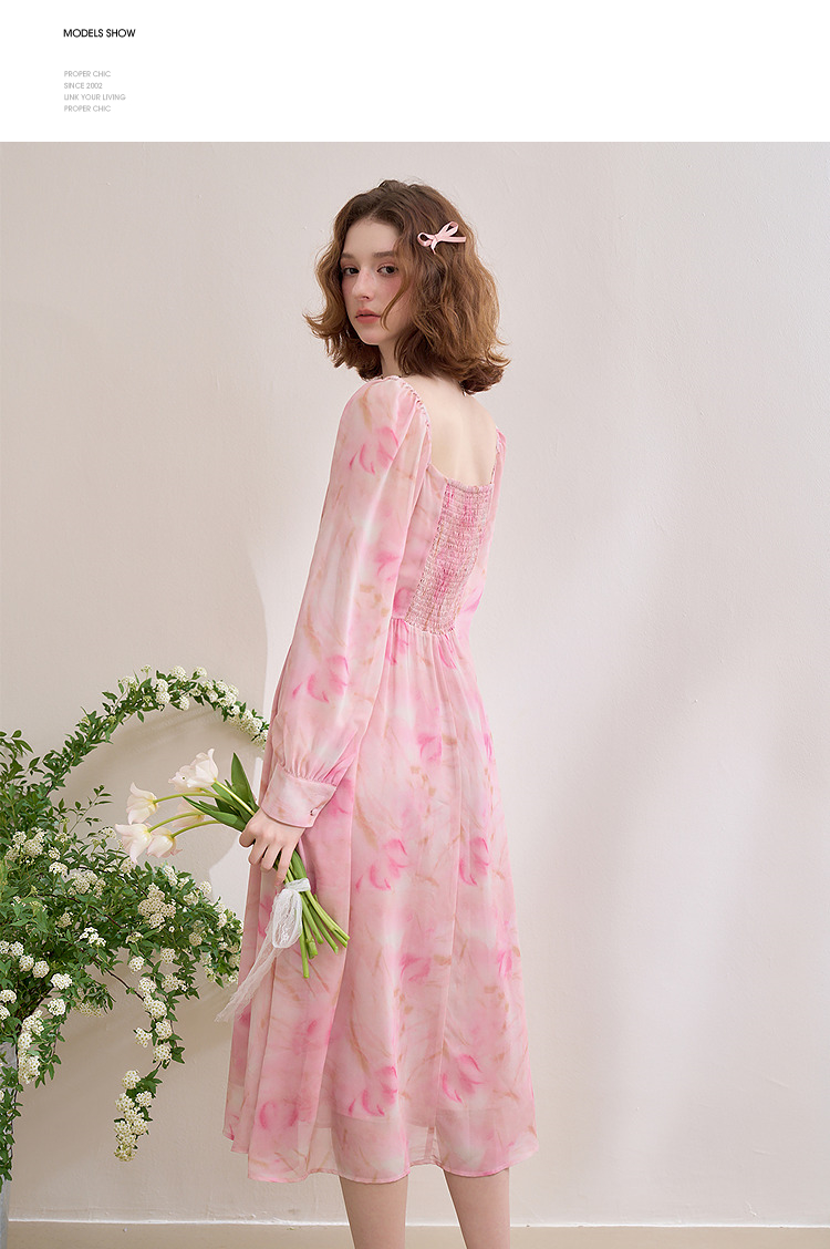 【雪纺印花】法式浪漫方领晕染长袖连衣裙女收腰长裙V0650253