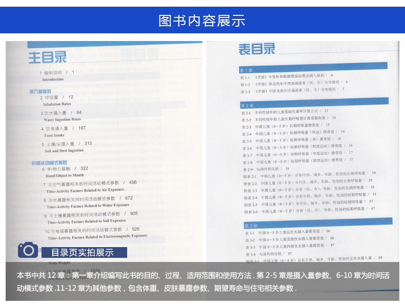 /尘摄入量;第二部分为时间活动模式参数,包括与手/物口接触参数(手/物口接触频次和接触时间)、与空气暴露相关的时间活动模式参数(室内外活动时间、交通出行方式和时间)、与水暴露相关的时间活动模式参数(洗澡时间、游泳时间等)、与土壤暴露相关的时间活动模式参数(土壤接触时间),与电磁暴露相关的时间活动模式参数(与手机、电视、台式电脑、平板电脑等电子设备的接触时间等);第三部分为其他参数,包括体重和皮肤暴露参数。对于每类参数,均先介绍该参数的定义、影响因素和获取方法,然后是数据和资料的来源和各年龄段儿童参数的推荐值,最后是与国外相关参数的比较。此外,每章都以附表的形式列出了分地区(东中西、片区和省)、分城乡、分年龄、分性别的数据,有个别参数还列出了分季节的数据。附表中列出了样本量、算数均值,以及百分位数值(P5、P25、P50、P75、P95),读者可以根据需要选择。
