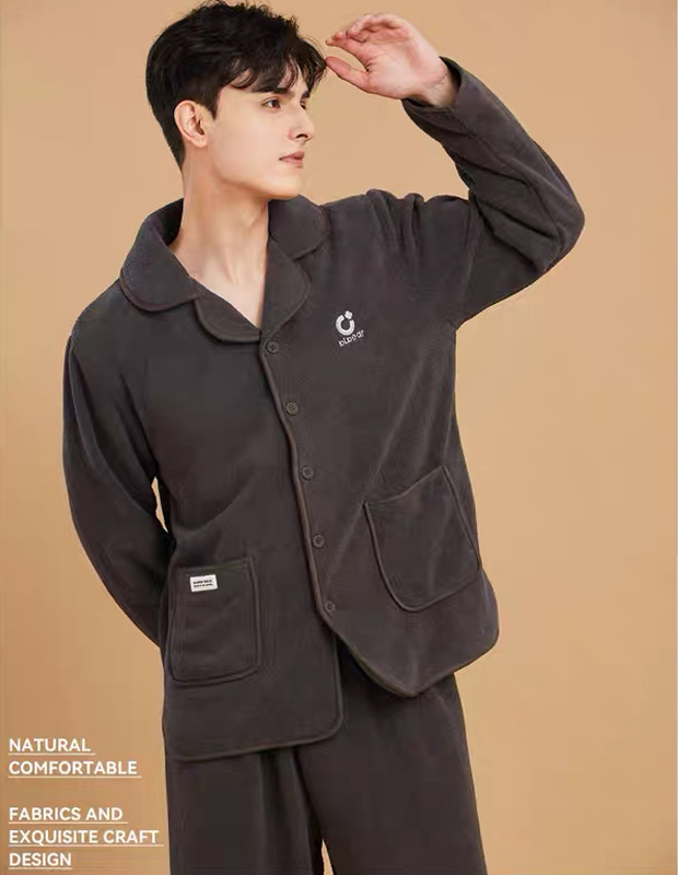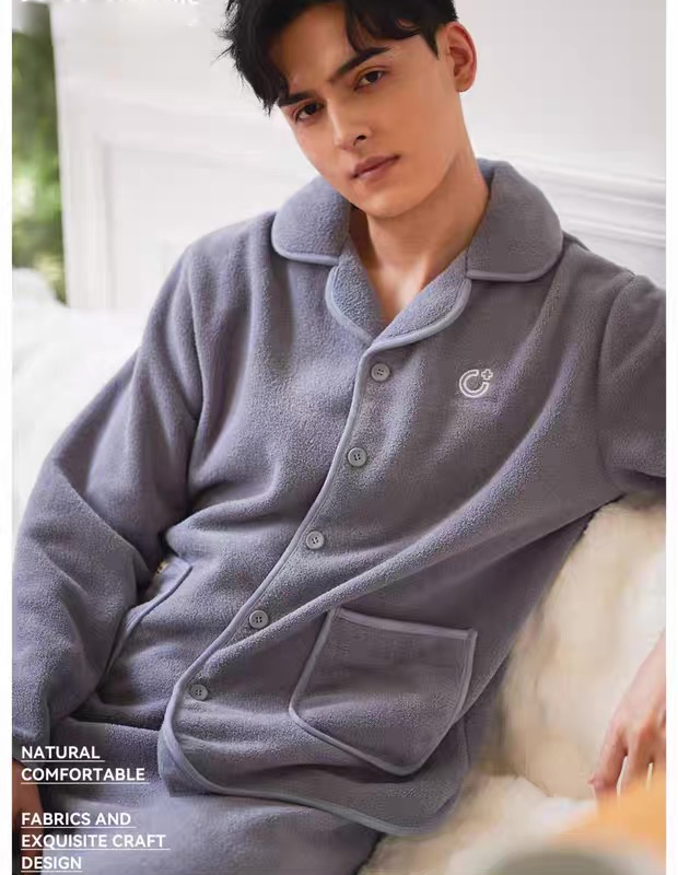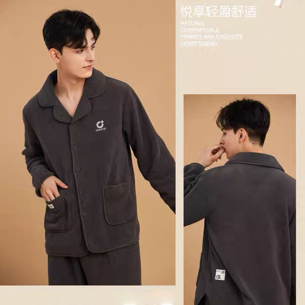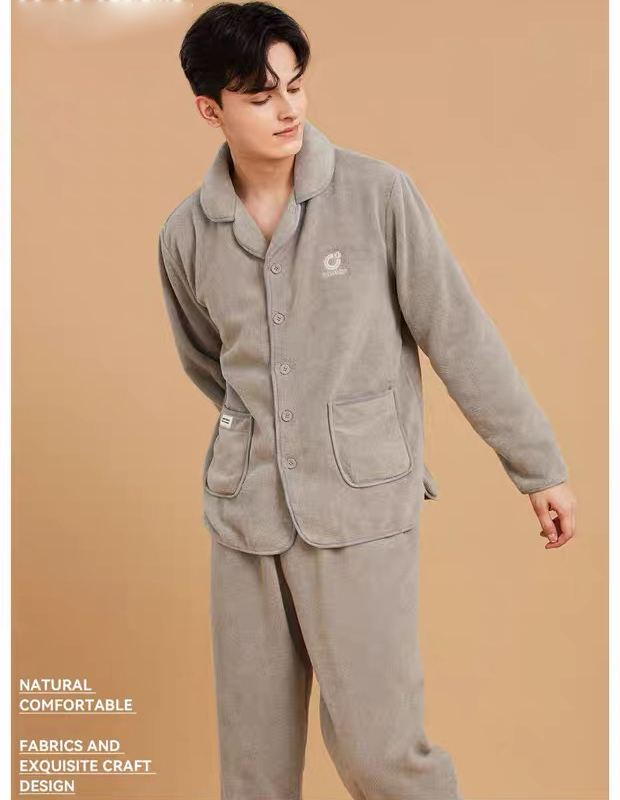 男士翻领休闲睡衣套装果粒绒保暖可外穿家居服套装【24R31134】