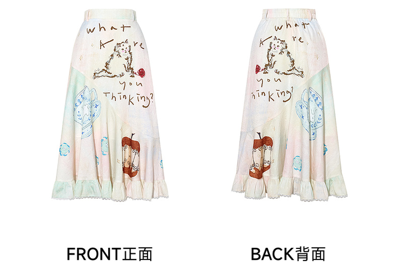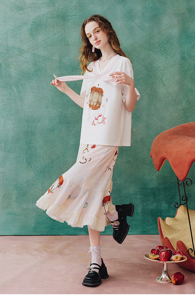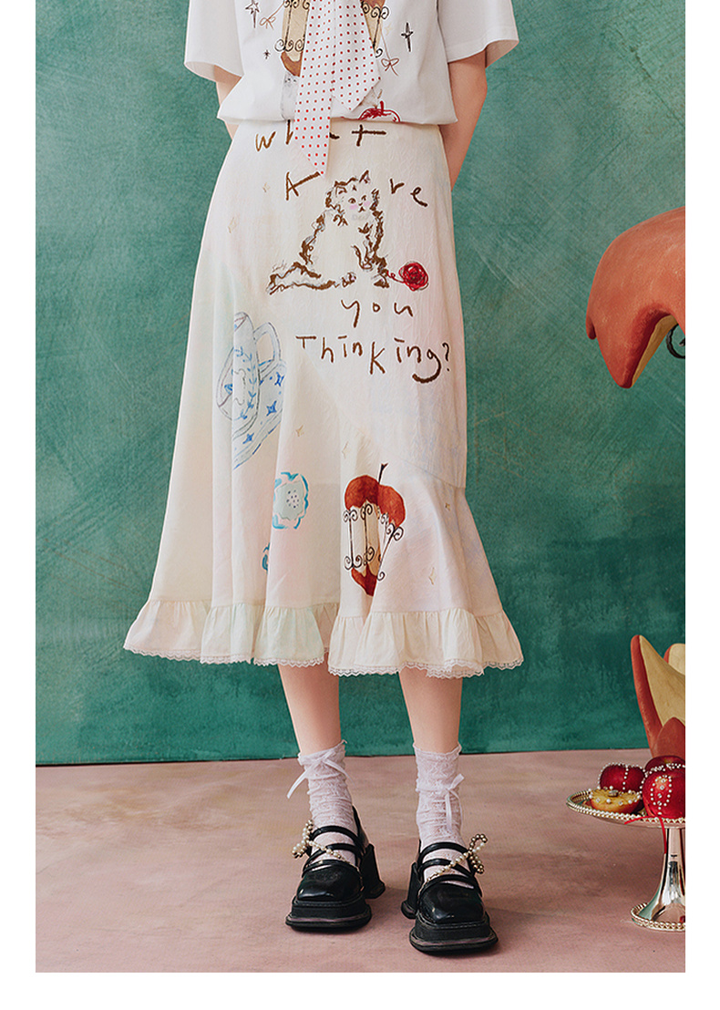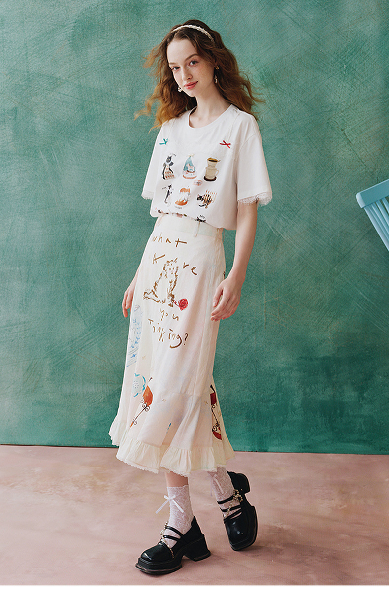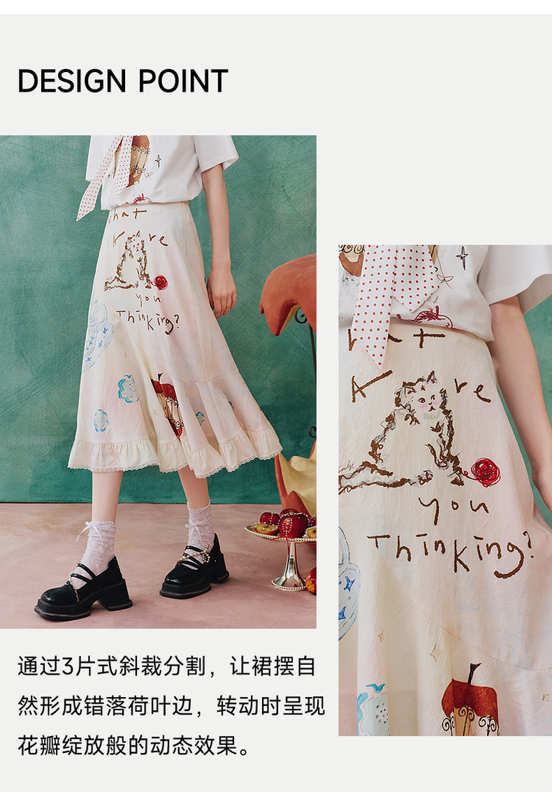 两三事 魔幻派对 2025夏季新款小清新印花荷叶边摆a字半身裙长裙