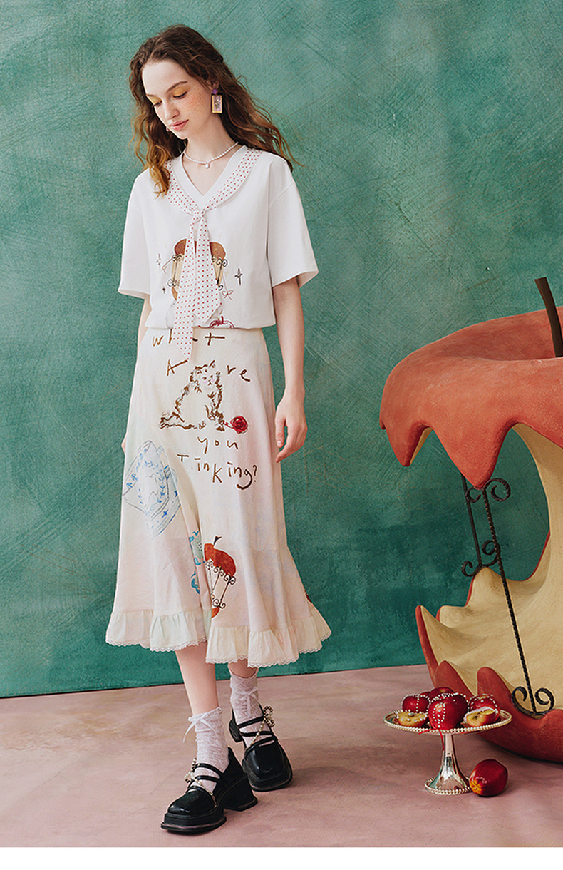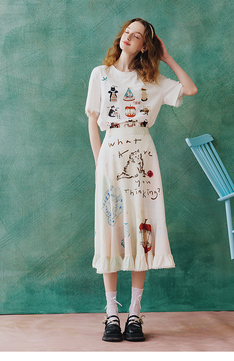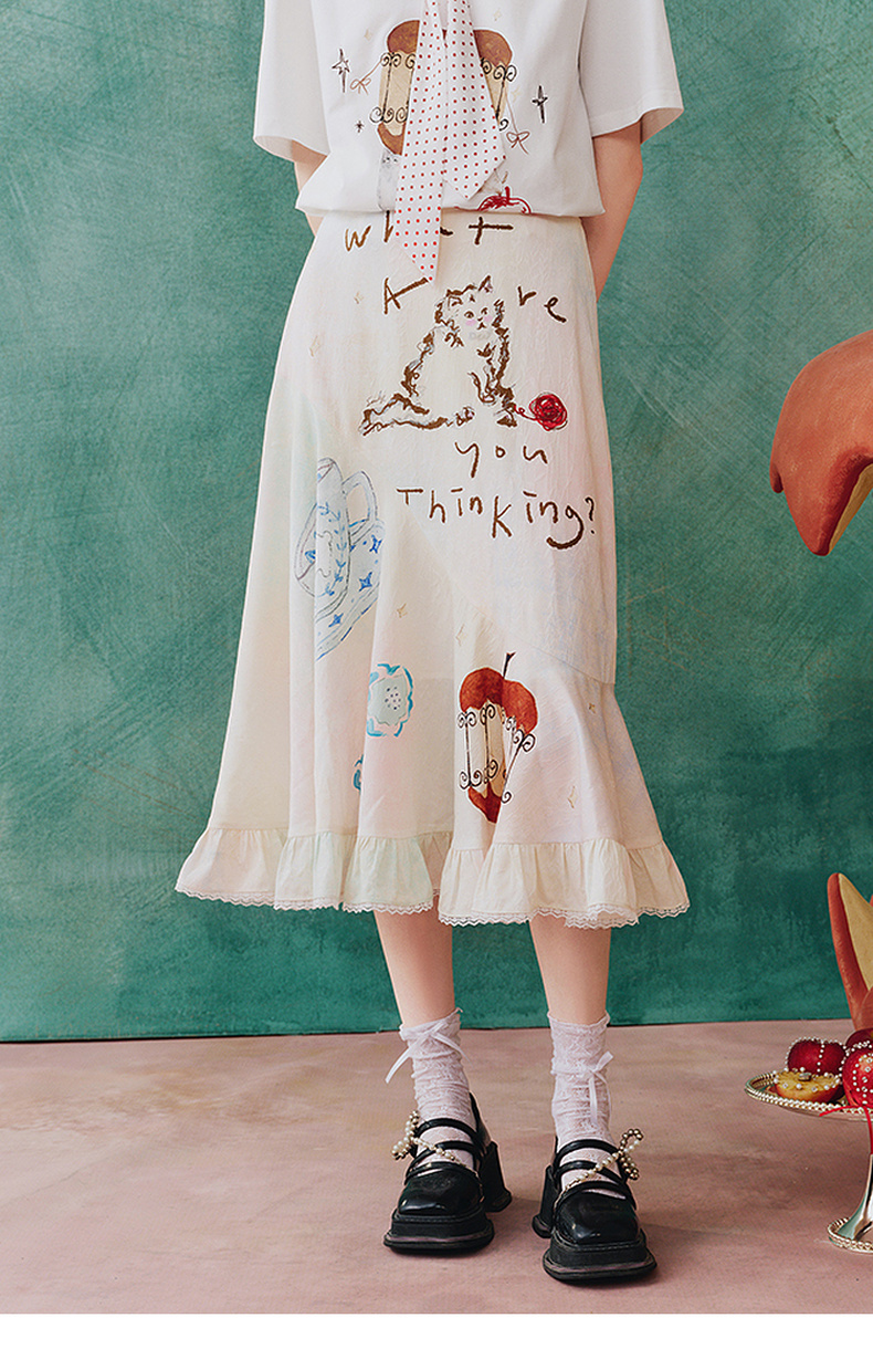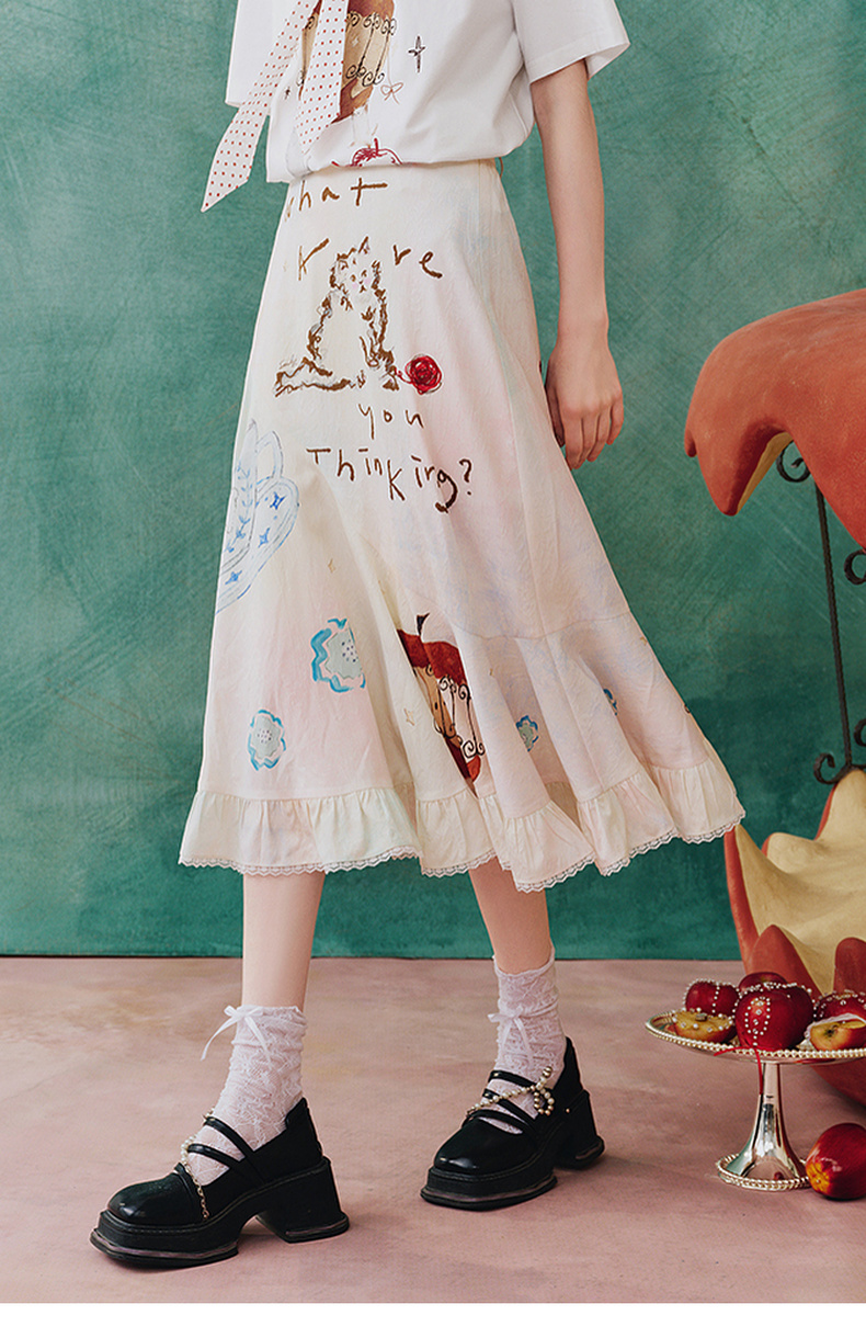 两三事 魔幻派对 2025夏季新款小清新印花荷叶边摆a字半身裙长裙